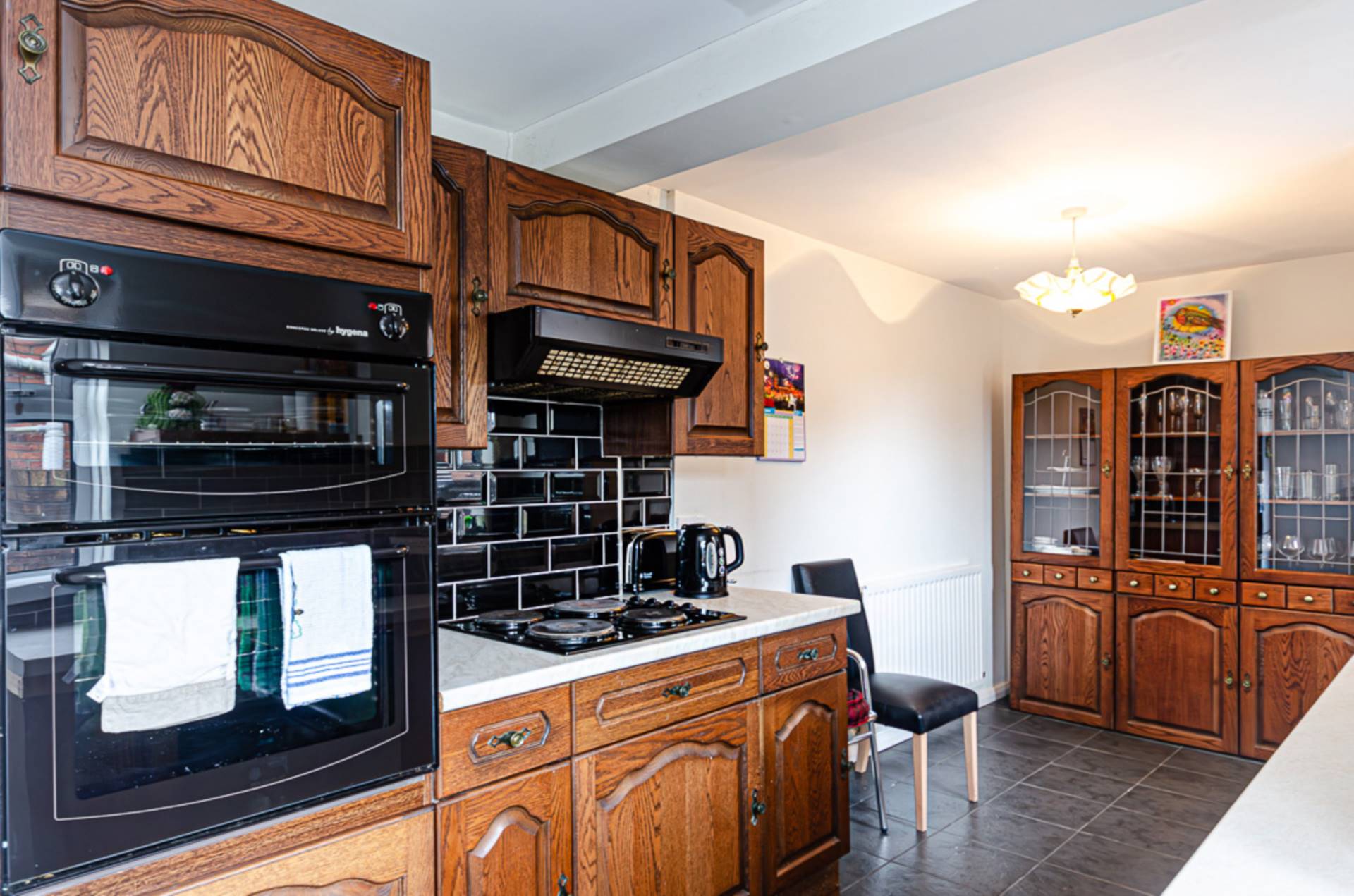 Range of high and low level fitted units, integrated double oven, integrated hob, part tiled walls, ceramic tiled floor and plumbing for washing machine