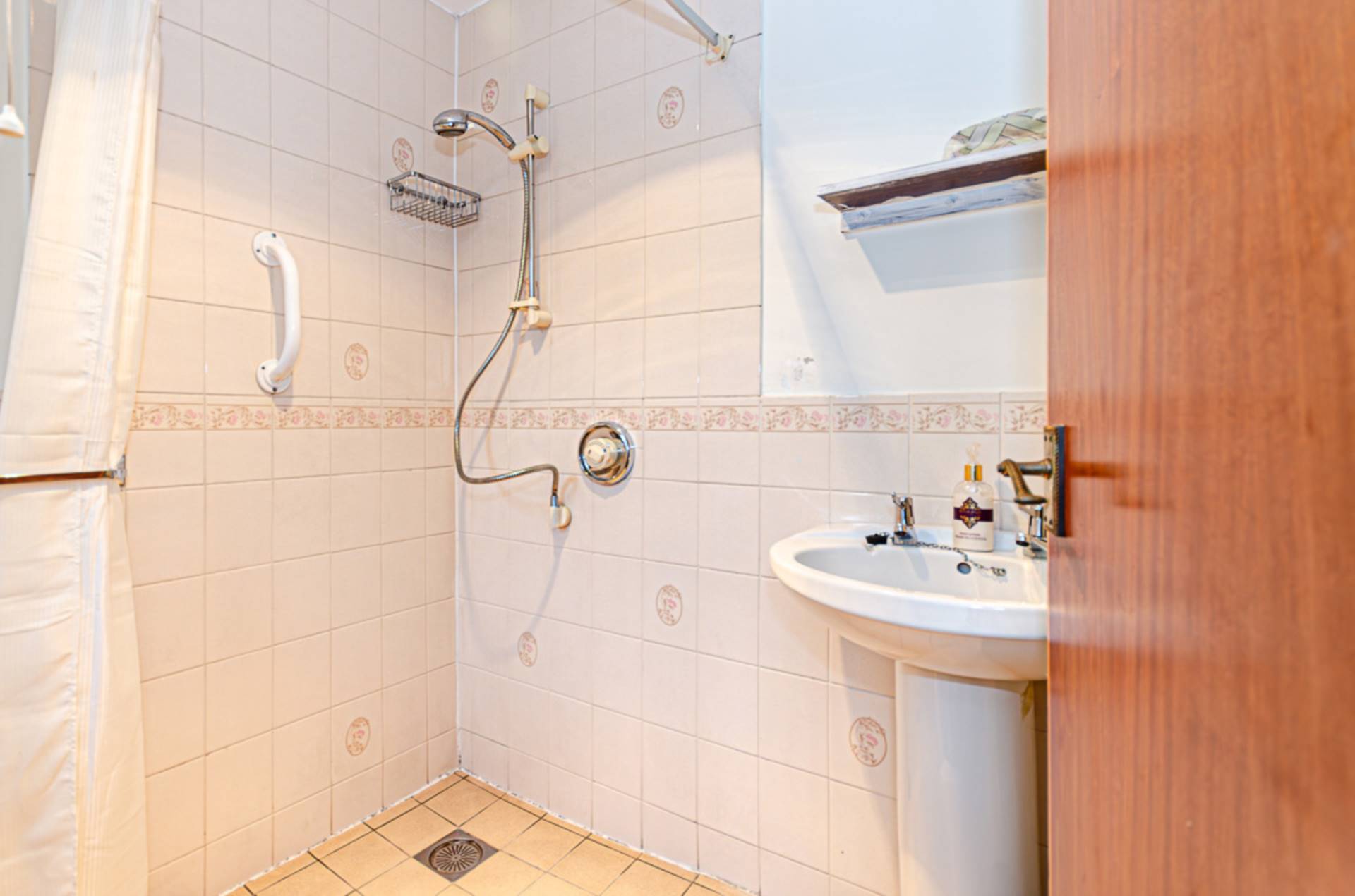 Wet room with thermostatic shower, wash hand basin, W.C., part tiled walls, ceramic tiled floor and extractor fan