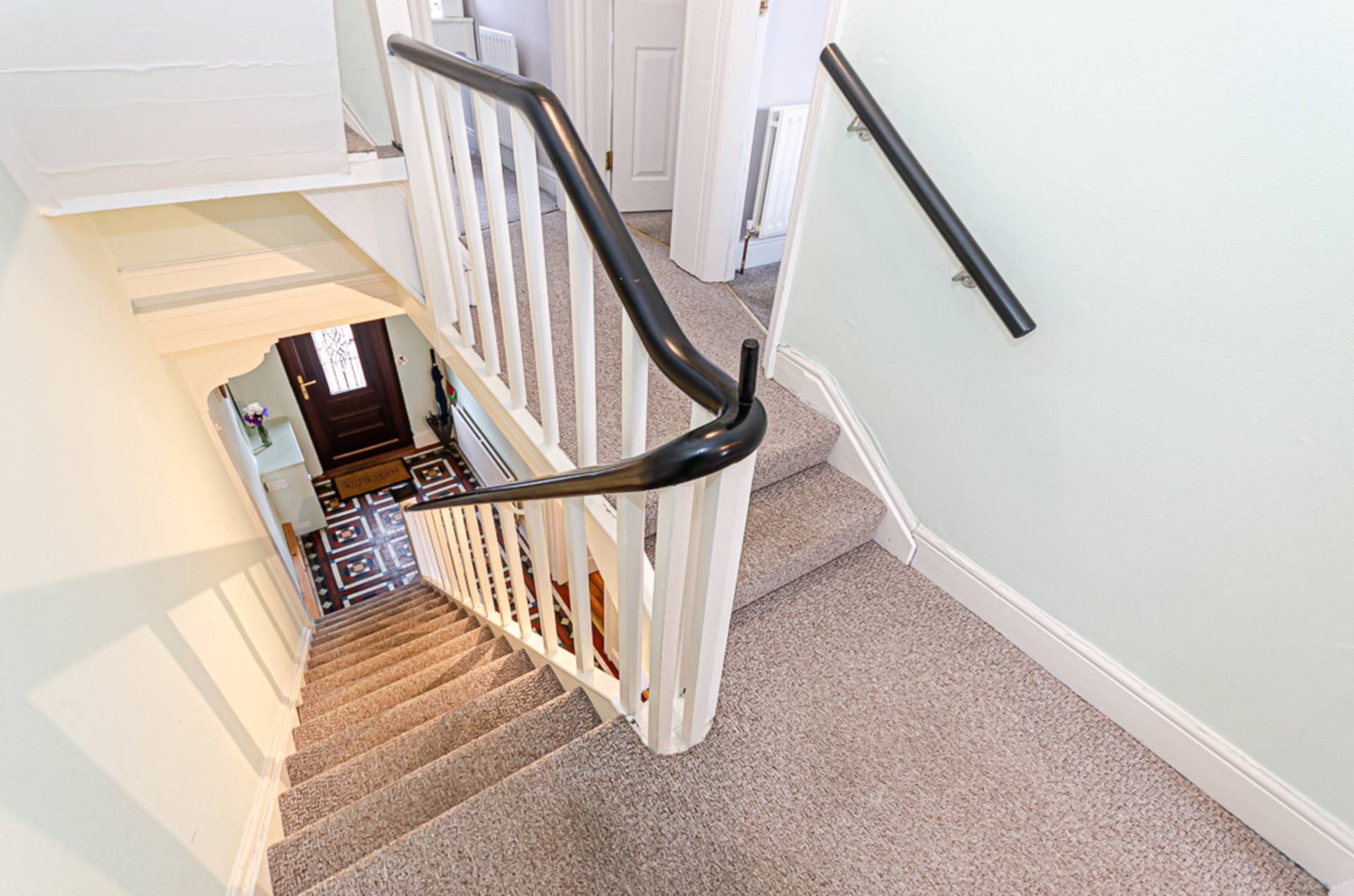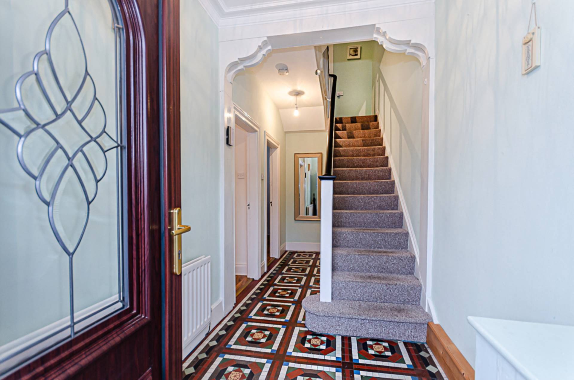 Original decorative tiled floor and timber detailing, cornice and storage under stairs