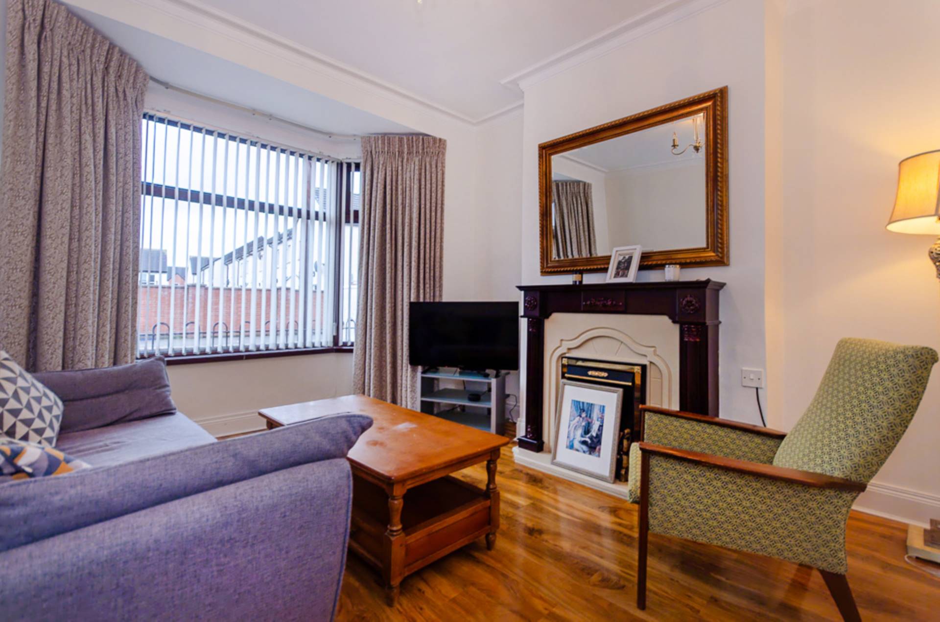 Bay window, feature fireplace with electric inset, cornice and timber laminate floor