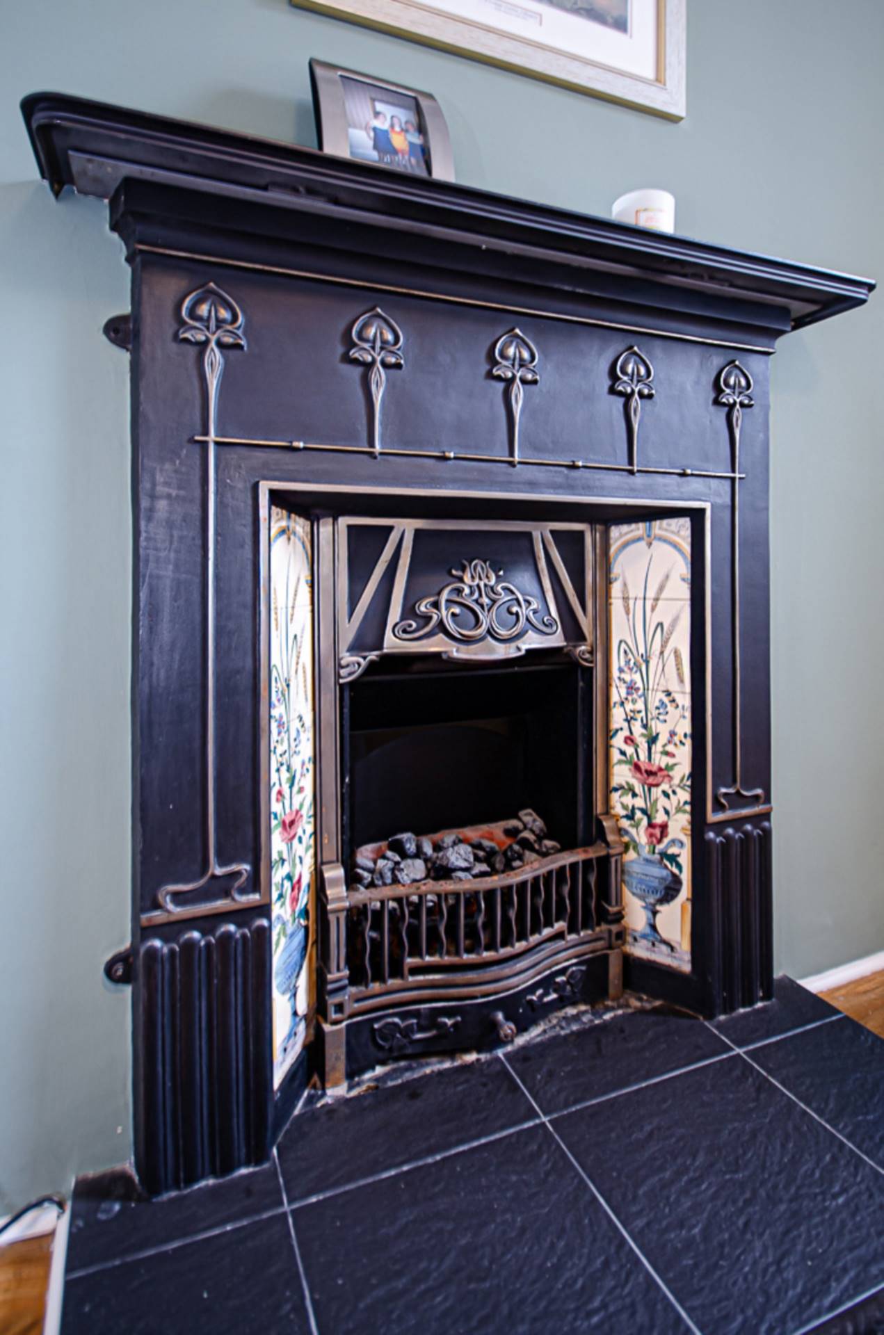 Feature cast iron fireplace with decorative tiled inset and tiled hearth, built in shelving and timber laminate floor