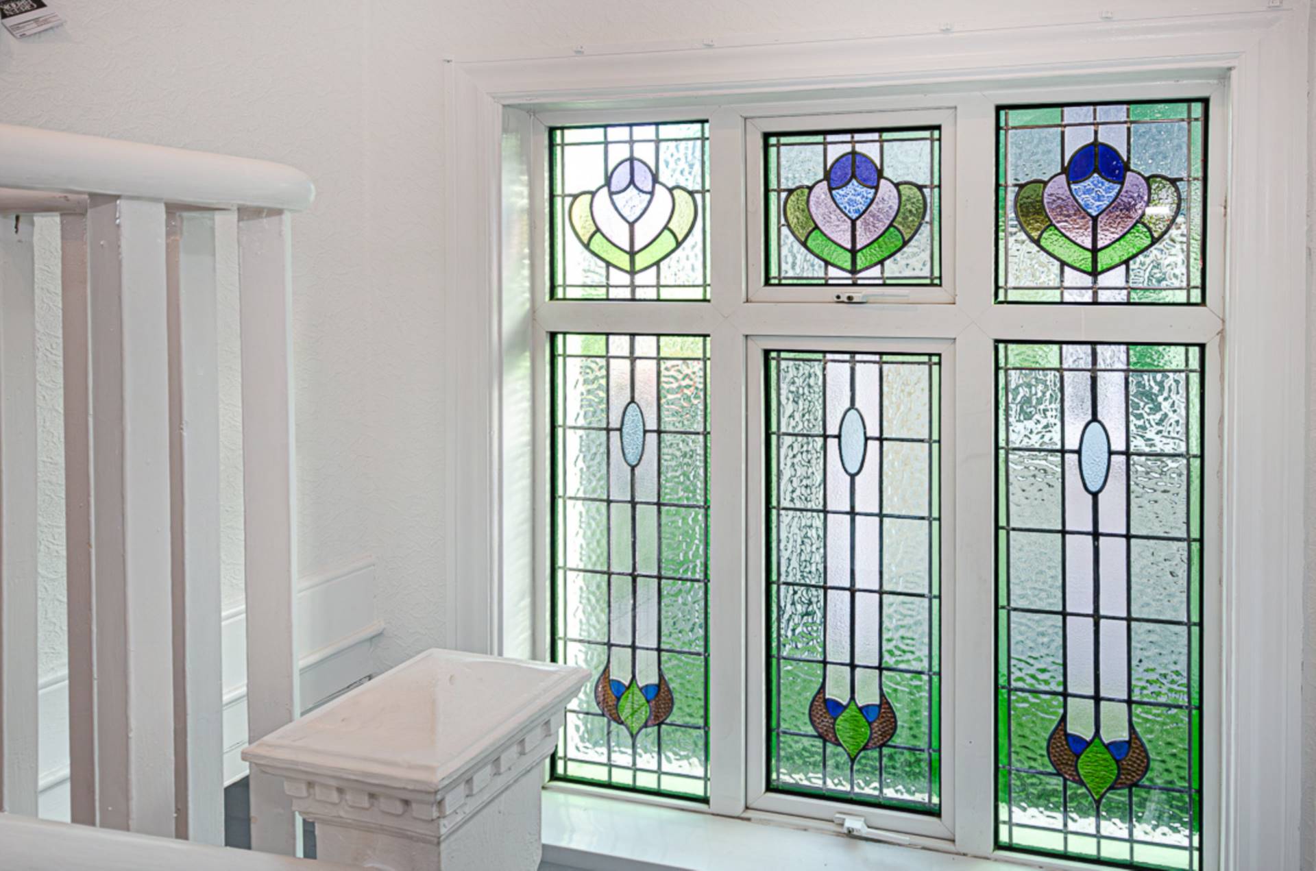 Feature fireplace with marble hearth and timber surround and bay window with stained glass