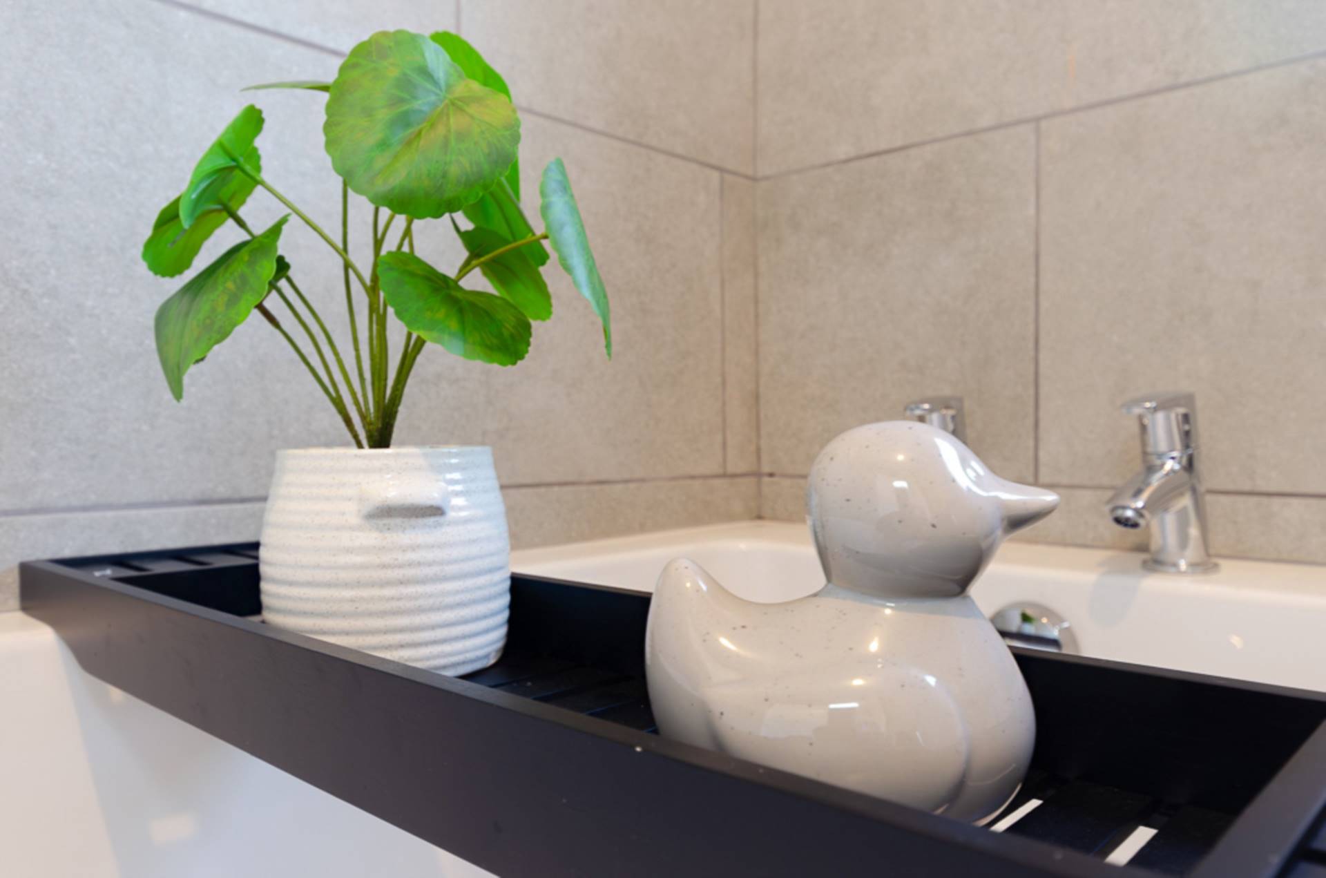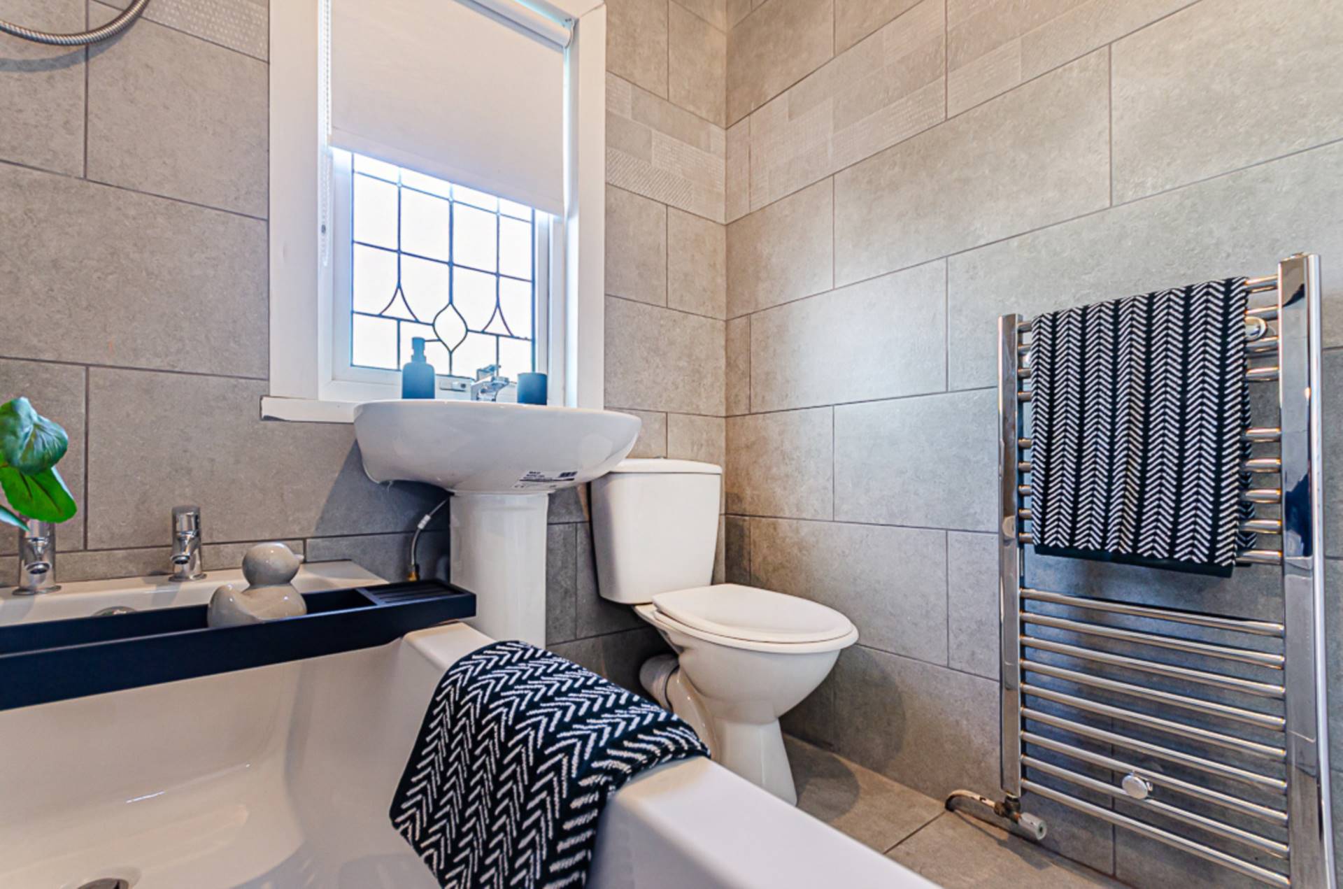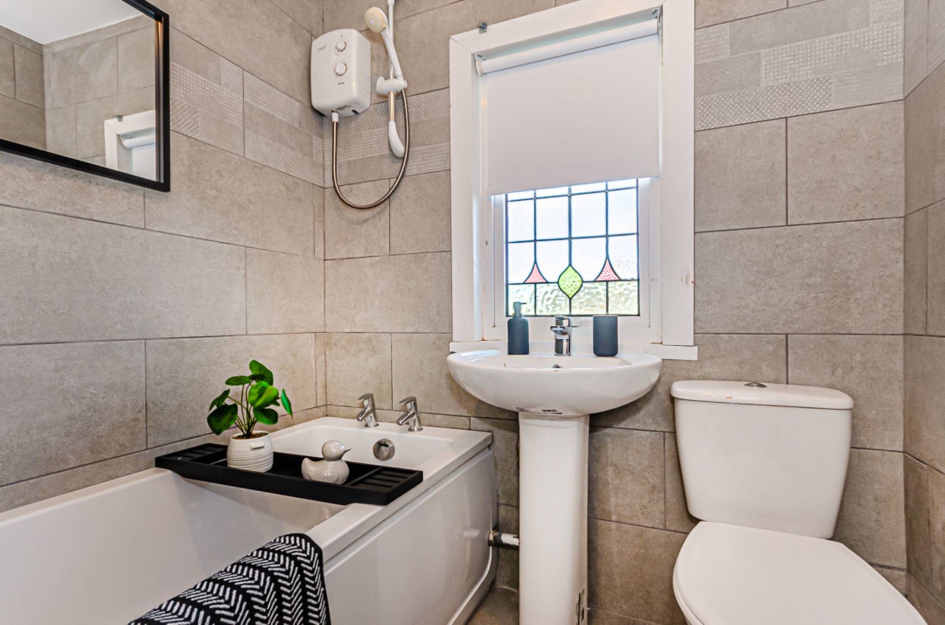 Newly fitted bathroom - white suite with electric shower over bath, wash hand basin, W.C., modern tiled walls, ceramic tiled floor, chrome towel rail radiator and gas boiler in cupboard