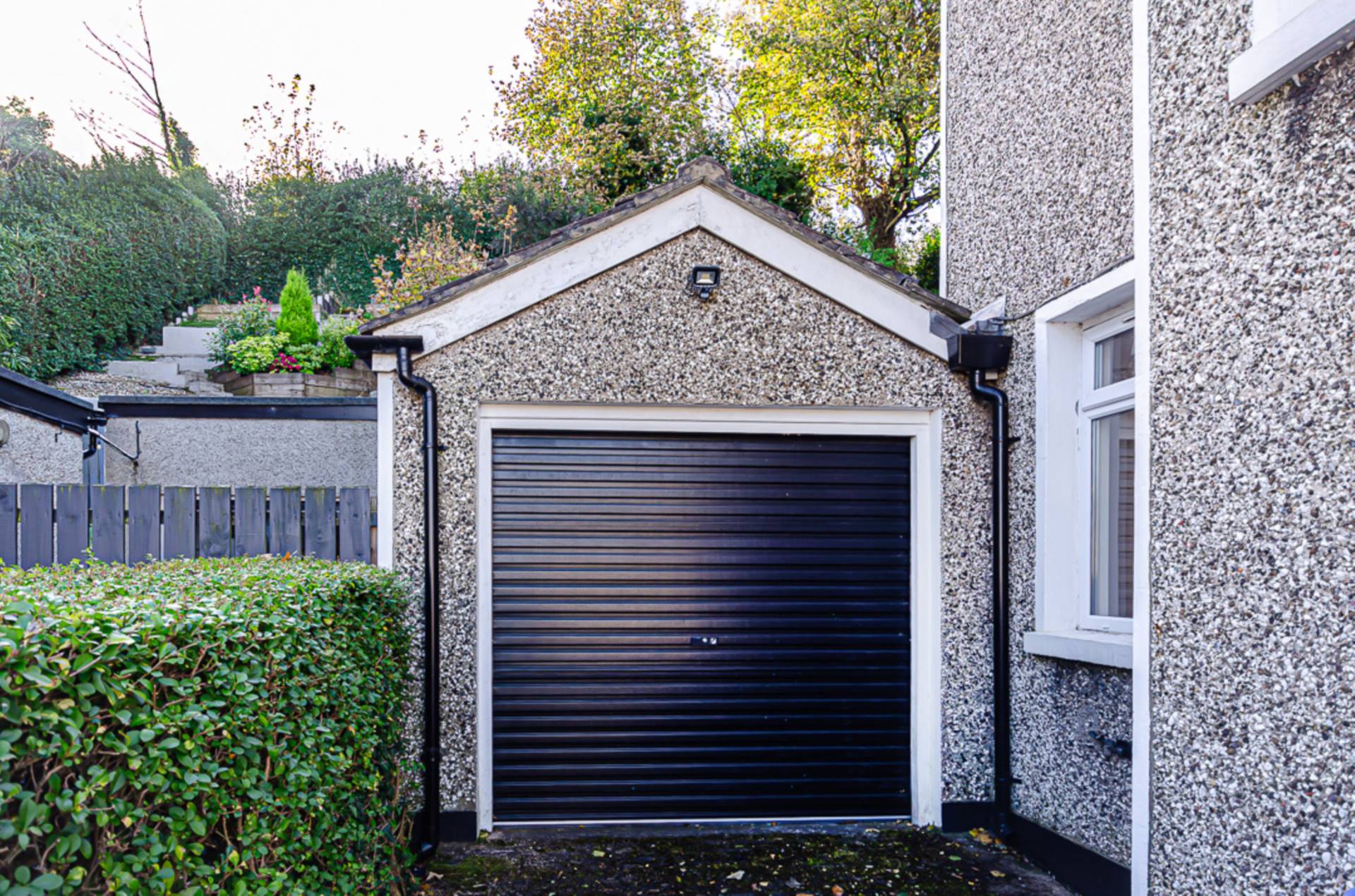 Front garden in paving and shrubs with tarmac driveway. Rear garden in artificial grass stepped up with lawn, shrubs and trees, and outside lights. Attached garage with light and power.