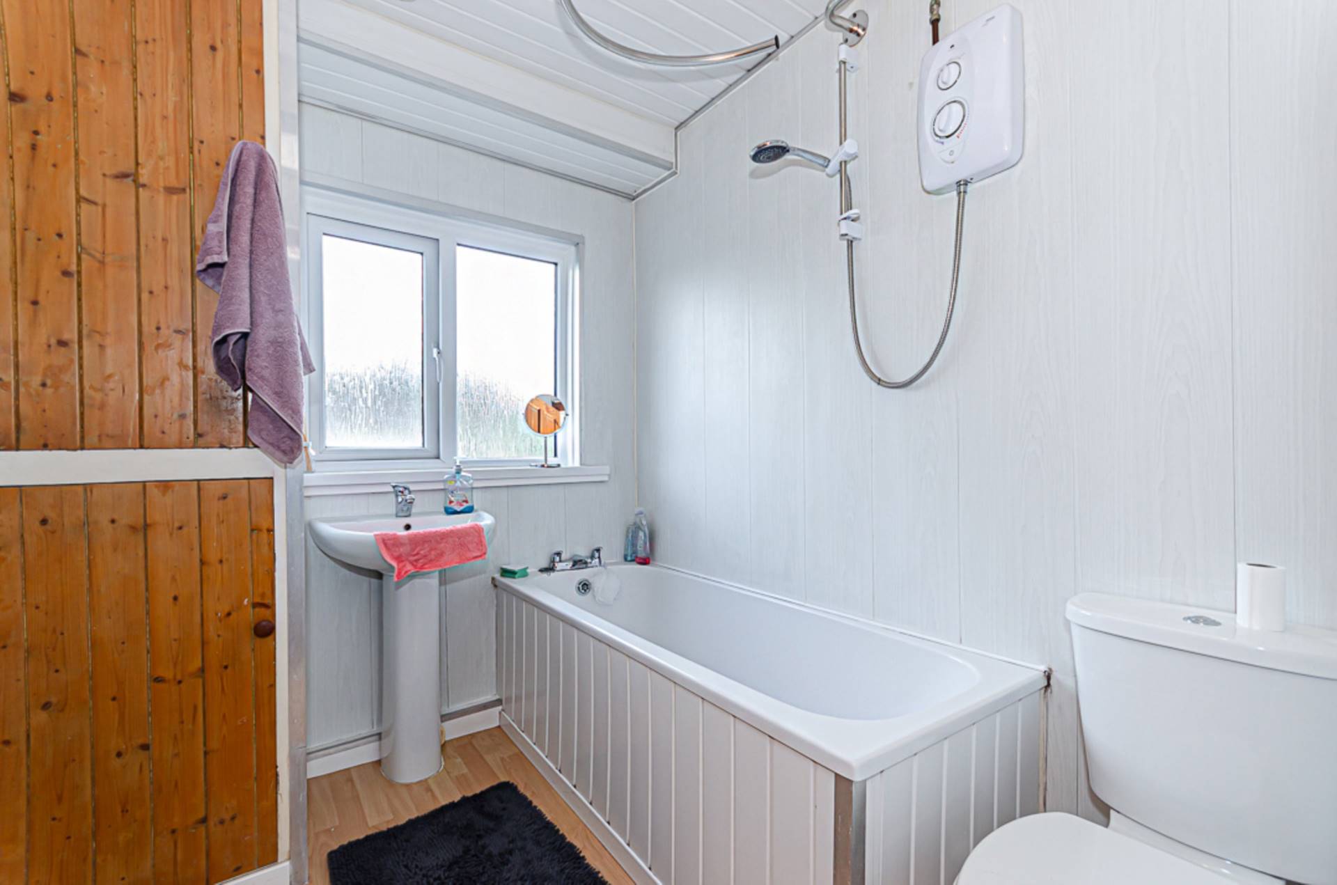 White suite with electric shower over bath, wash hand basin, W.C., PVC panelled walls, timber laminate floor and recessed spotlights