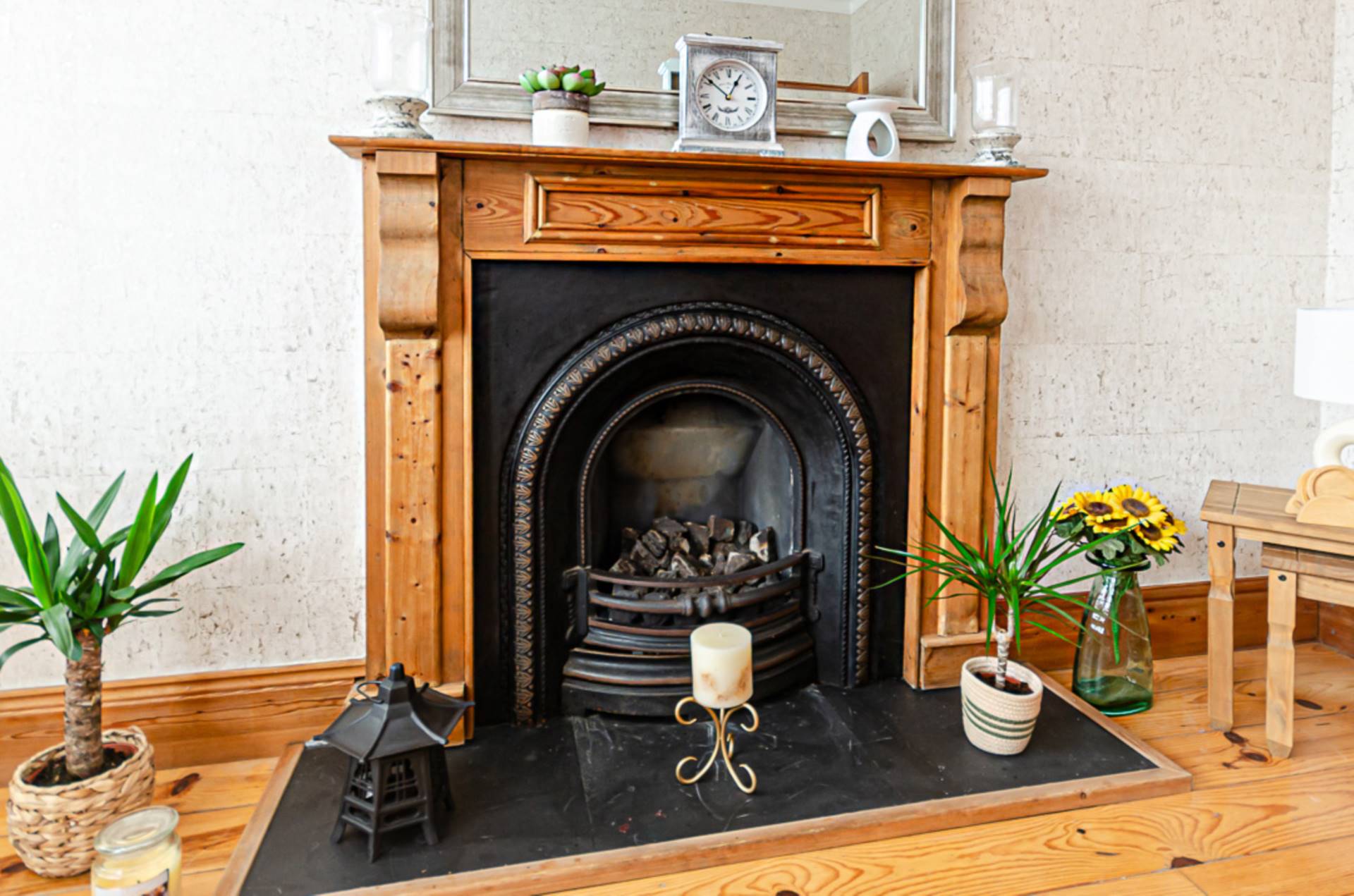 Feature gas fire with timber surround, cast iron inset and slate hearth, cornice and solid pine flooring