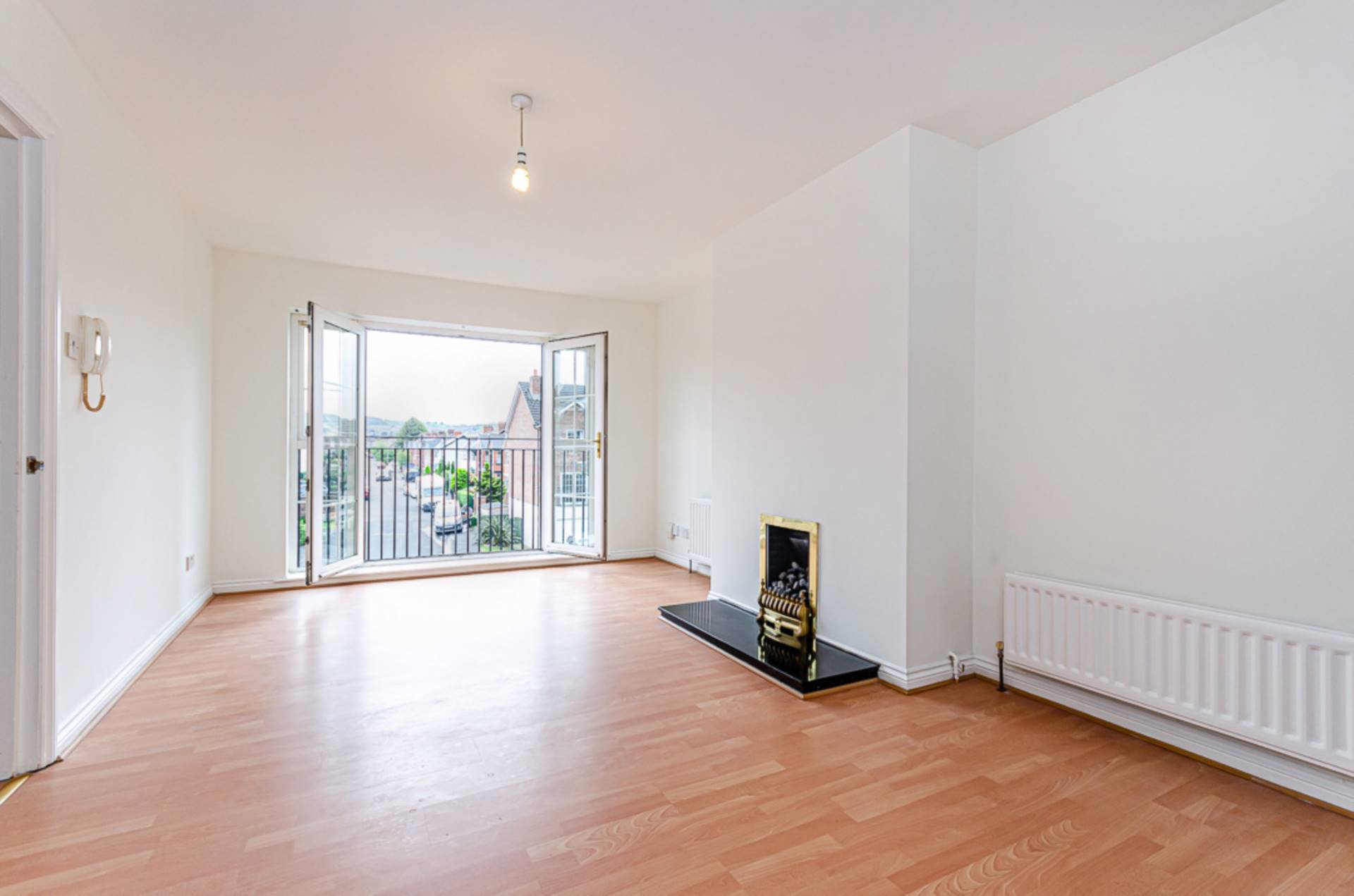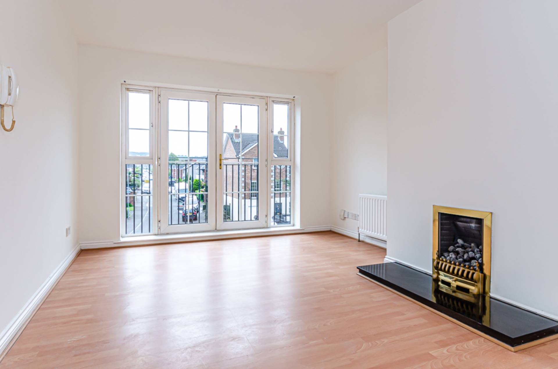 Double doors to French balcony with views of Castlereagh Hills, intercom handset, gas fire, timber laminate floor and open to..