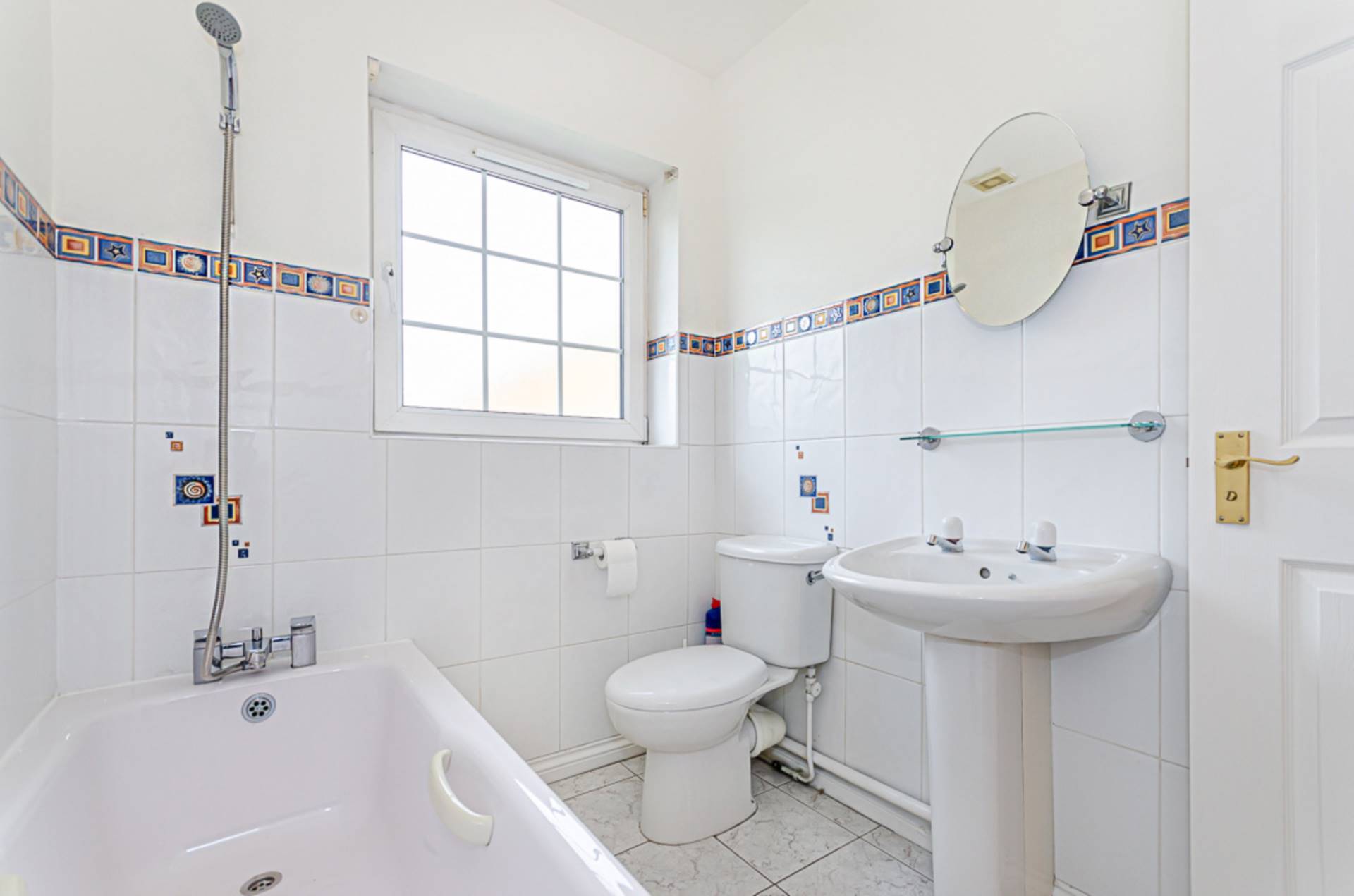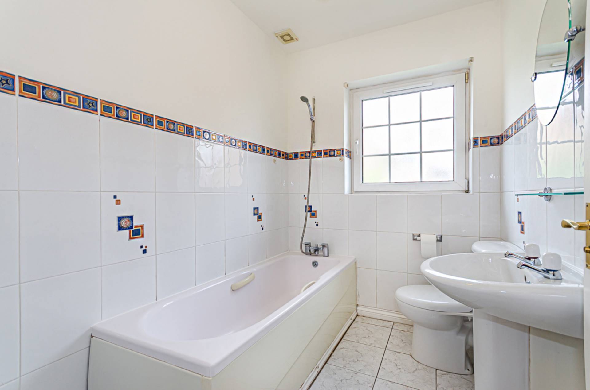 White suite with shower attachment over bath, wash hand basin, W.C., part tiled walls, ceramic tiled floor and extractor fan