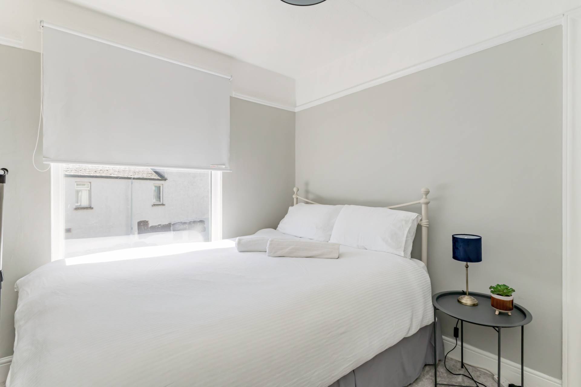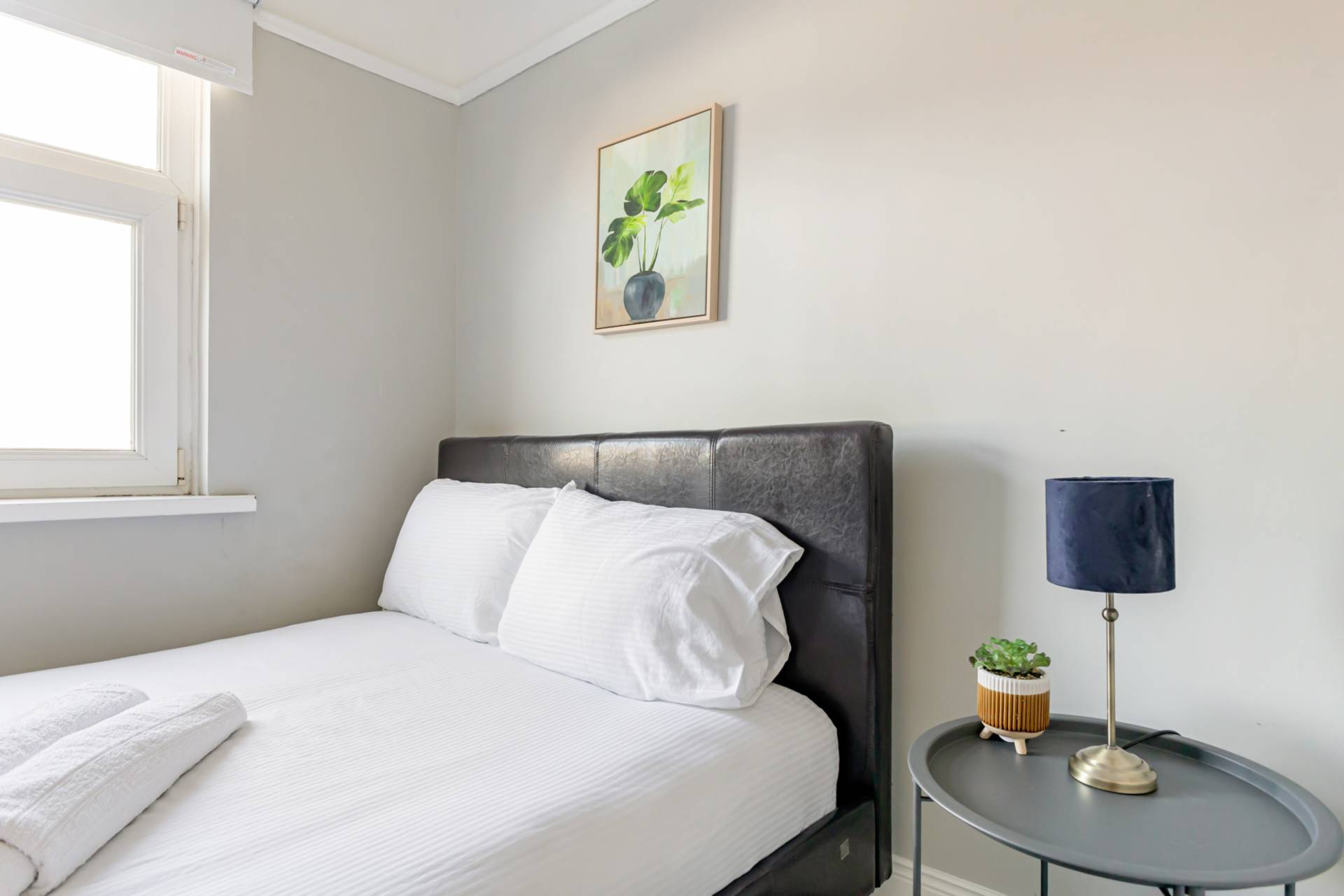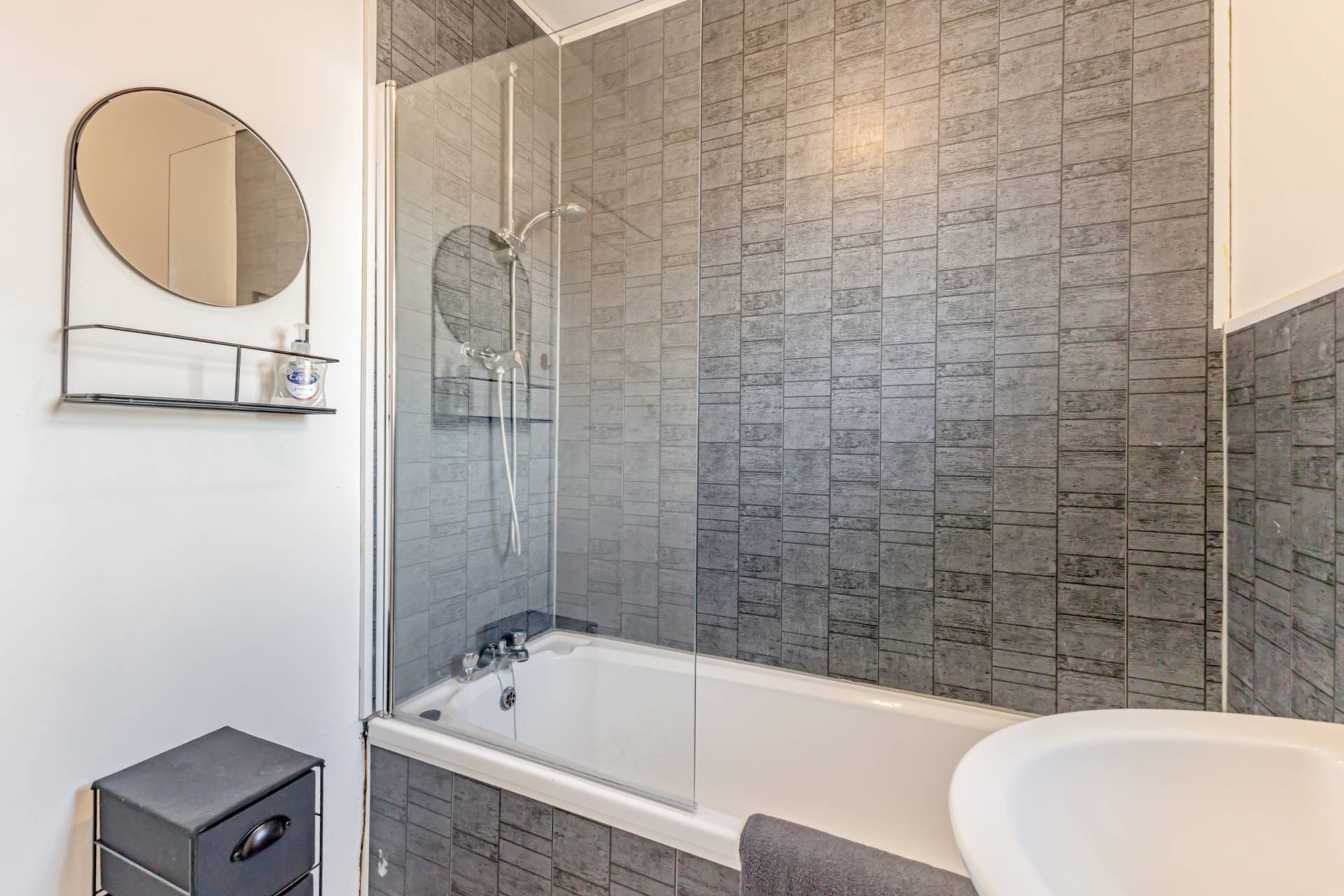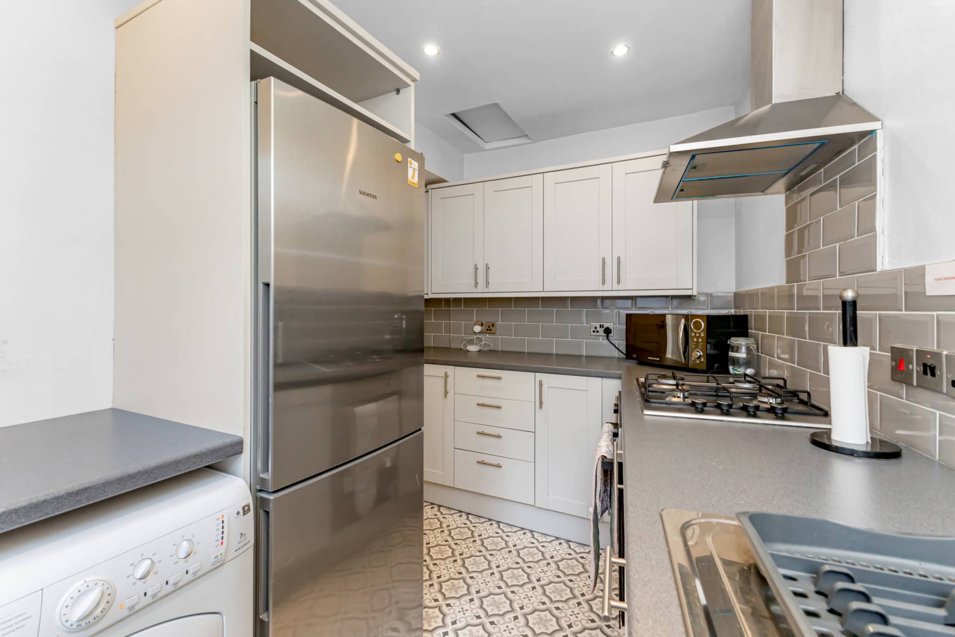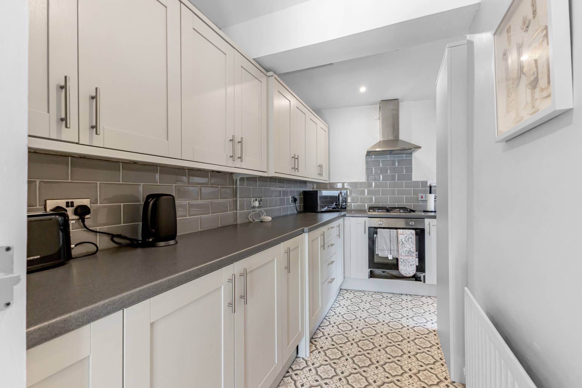 The modern kitchen has a sleek design and integrated appliances. This kitchen is not just functional but also aesthetically pleasing, and has ample storage space. The property has two bright bedrooms with a neutral colour palette and modern appeal. The contemporary bathroom features a clean, bright look with contrasting tiles that add a touch of style.