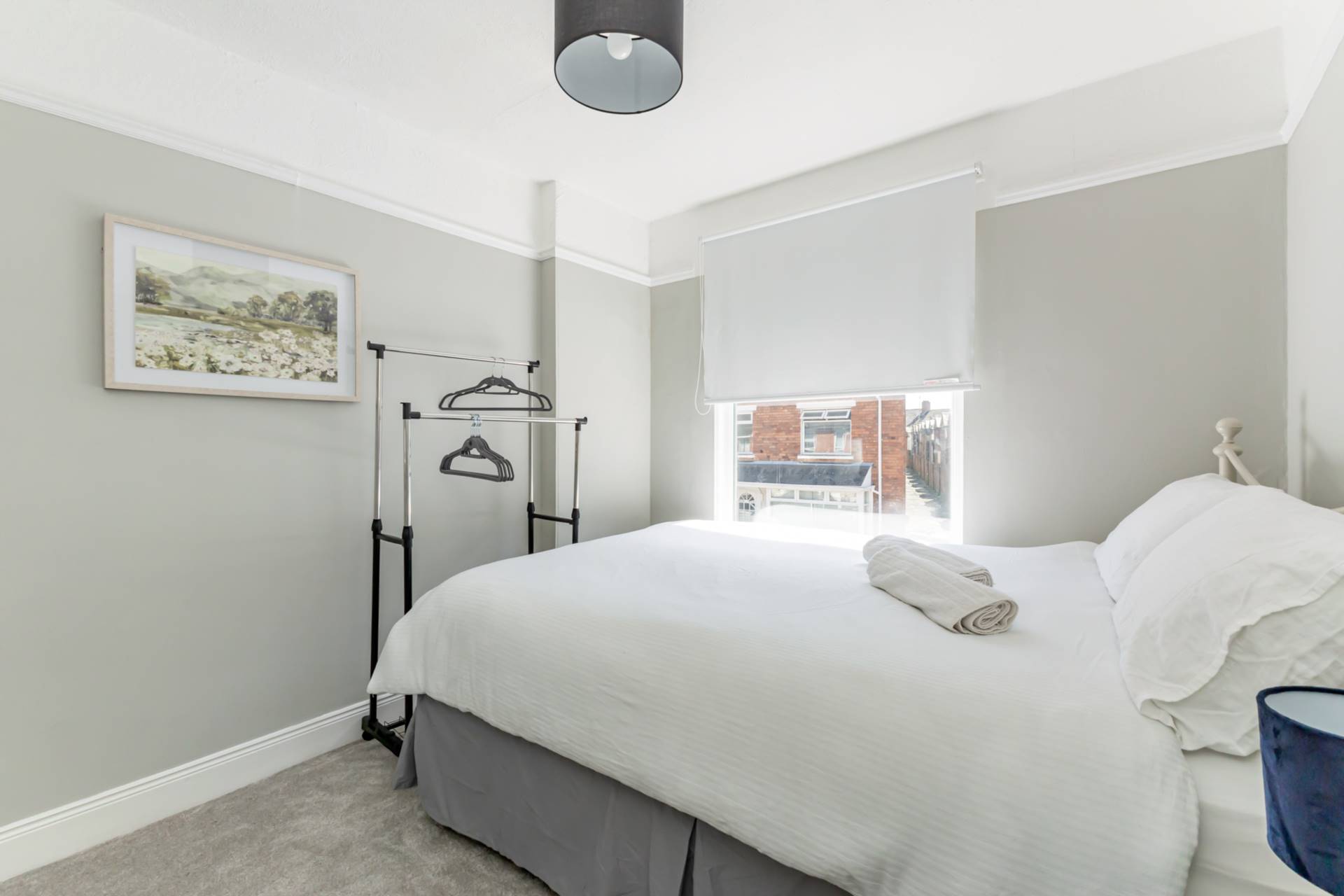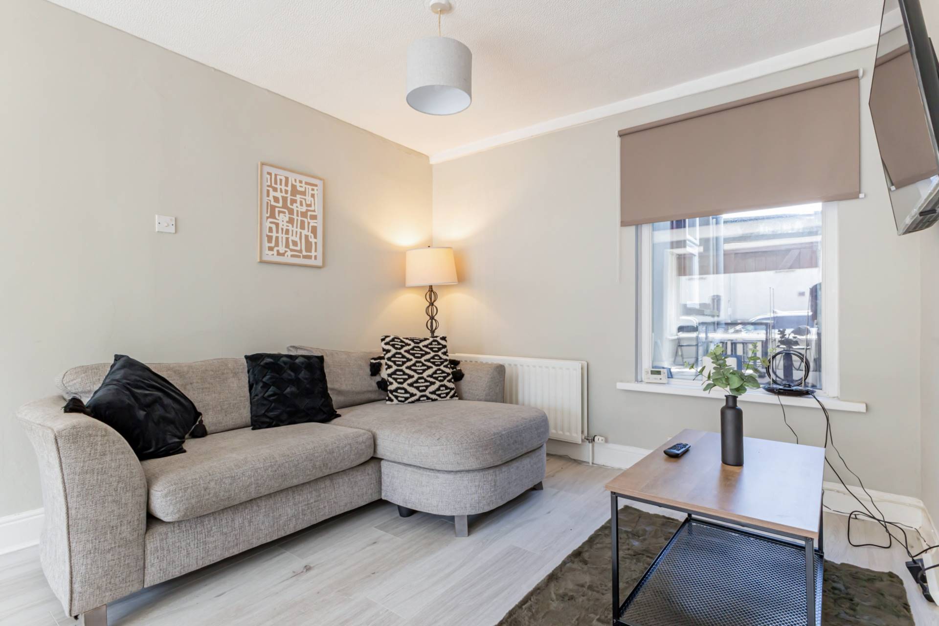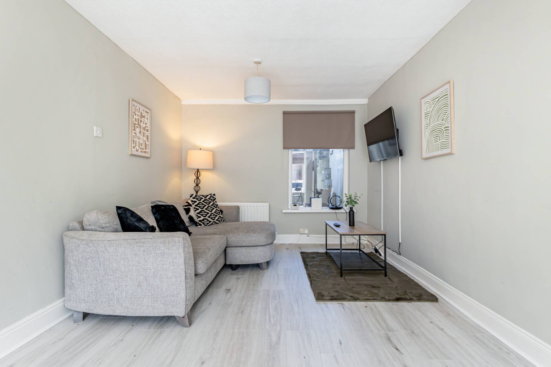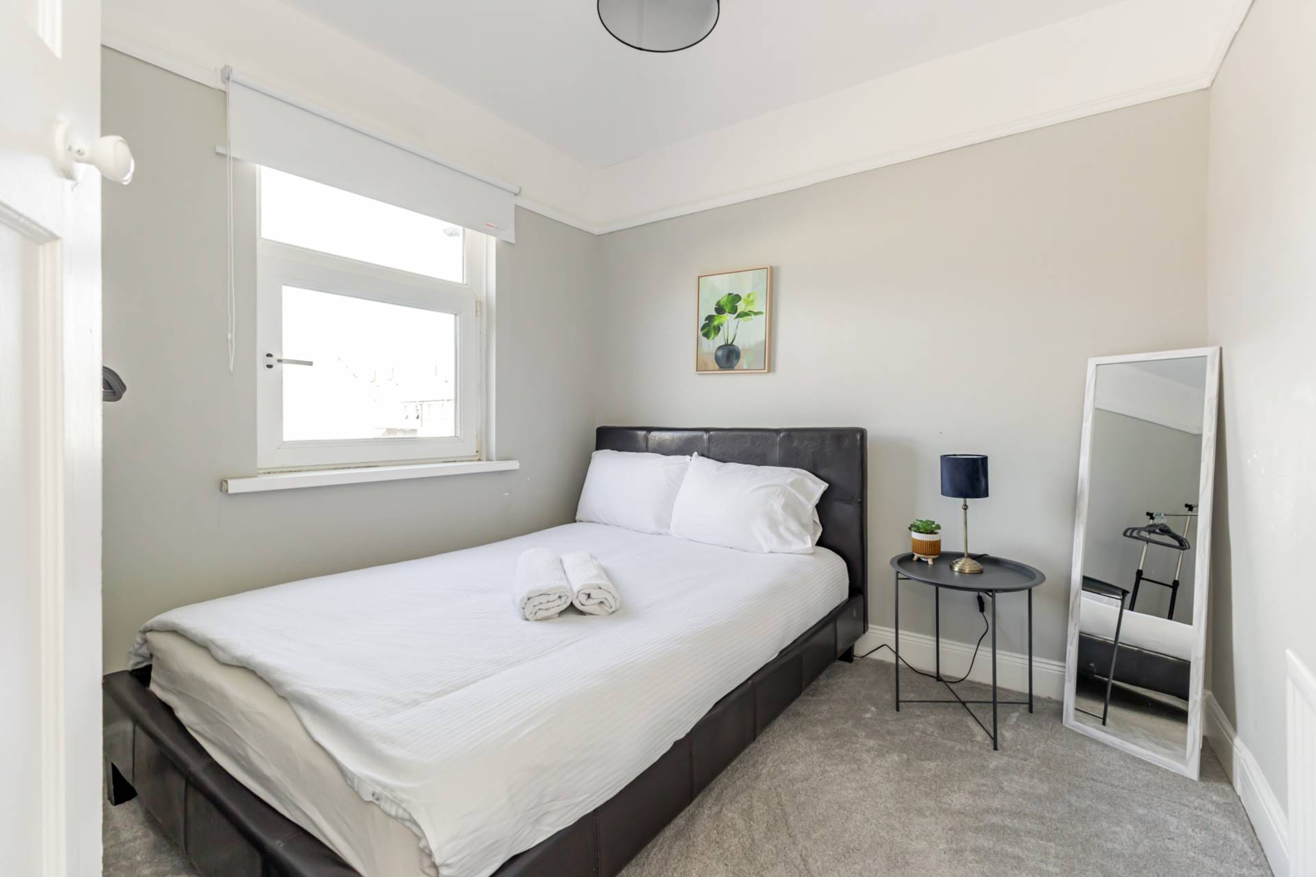 The modern kitchen has a sleek design and integrated appliances. This kitchen is not just functional but also aesthetically pleasing, and has ample storage space. The property has two bright bedrooms with a neutral colour palette and modern appeal. The contemporary bathroom features a clean, bright look with contrasting tiles that add a touch of style.