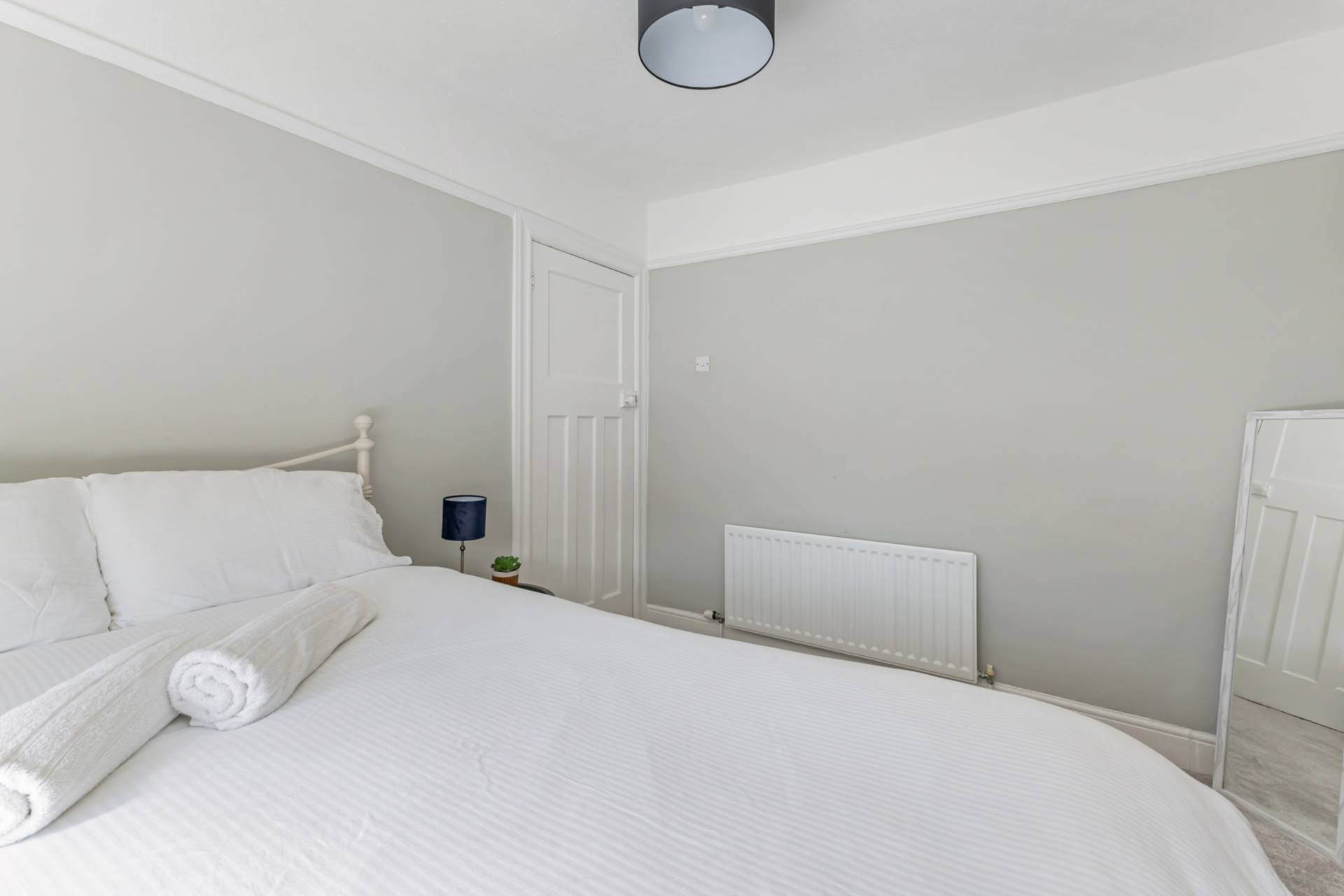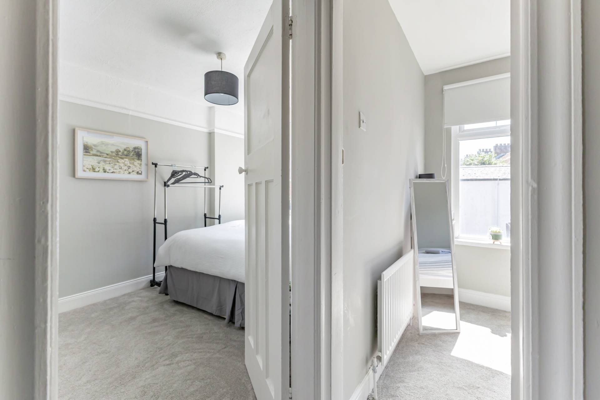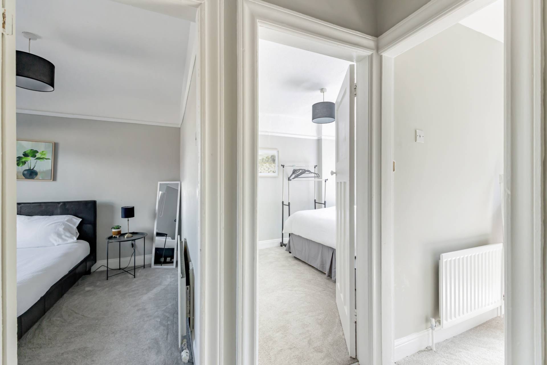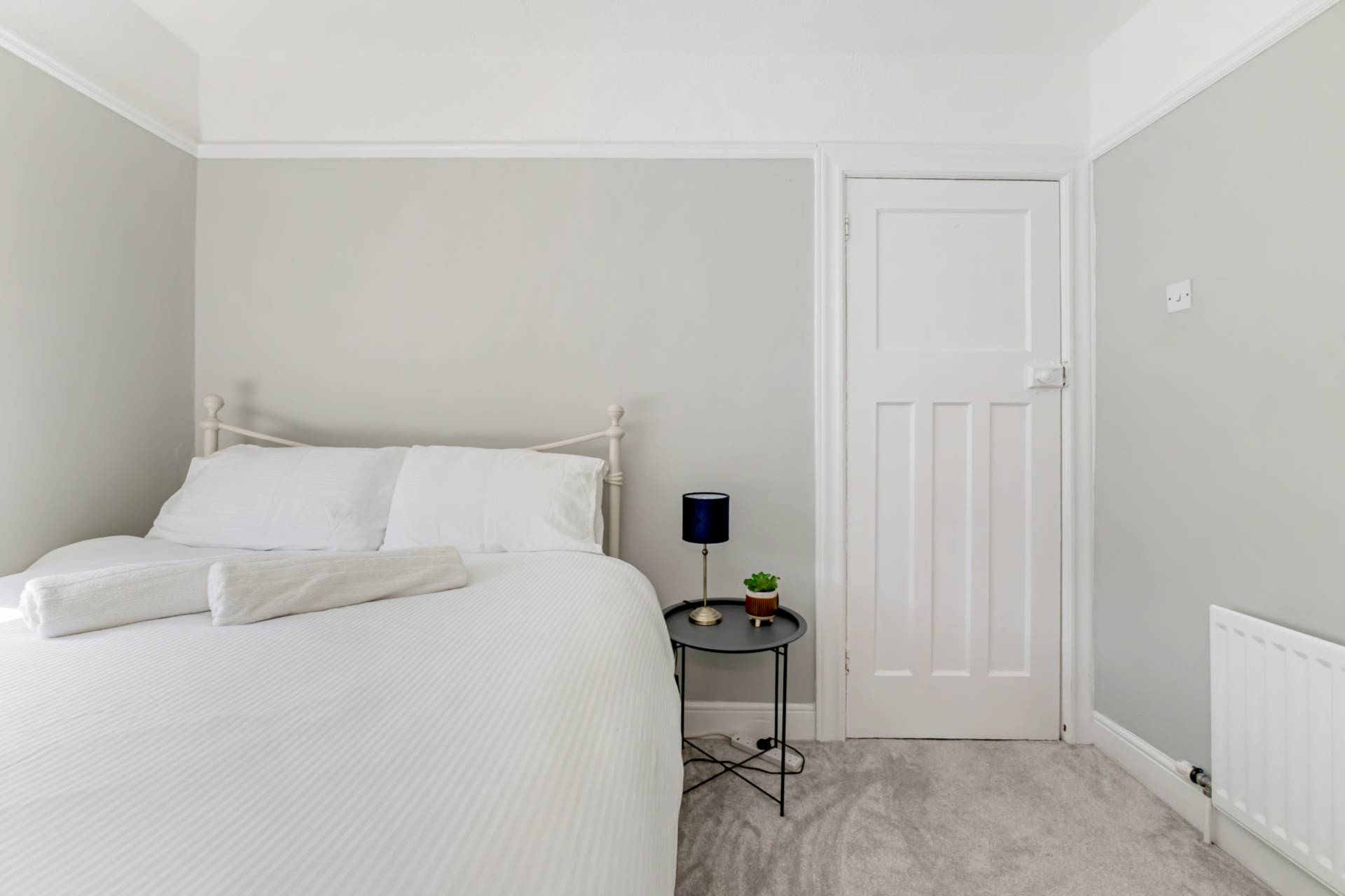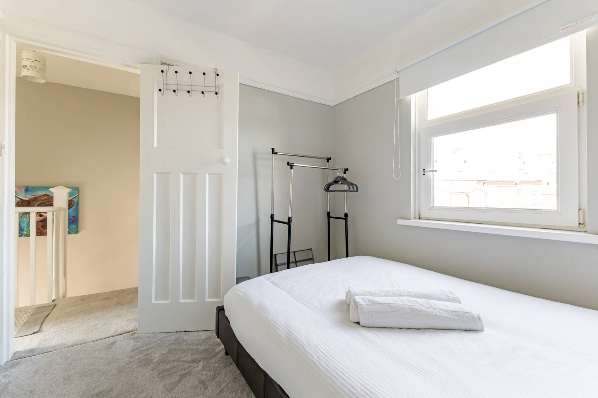 The modern kitchen has a sleek design and integrated appliances. This kitchen is not just functional but also aesthetically pleasing, and has ample storage space. The property has two bright bedrooms with a neutral colour palette and modern appeal. The contemporary bathroom features a clean, bright look with contrasting tiles that add a touch of style.