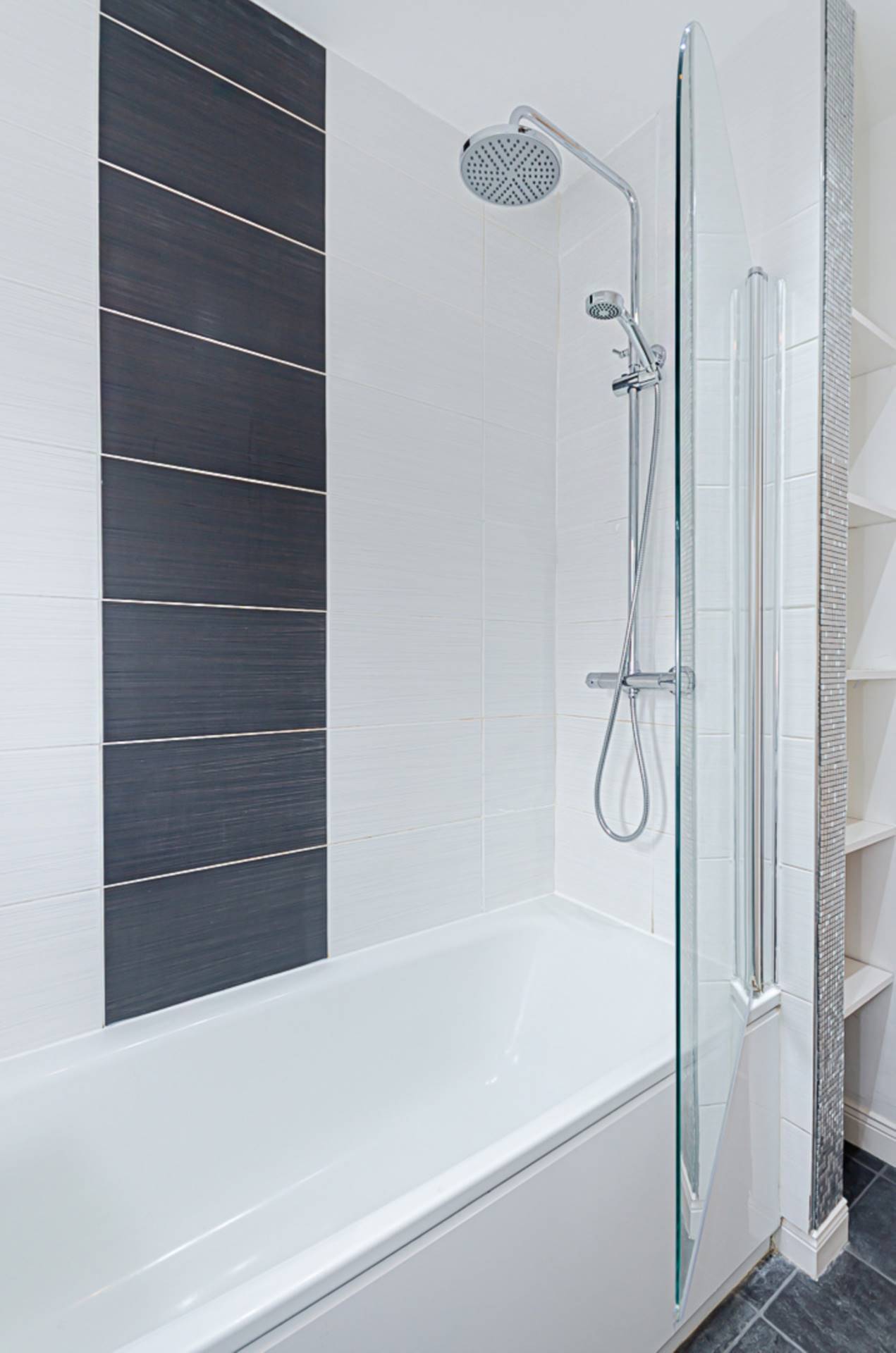 White suite with thermostatic shower over bath, dual shower heads, screen over bath, wash hand basin in vanity unit, W.C., part tiled walls, spotlights and extractor fan