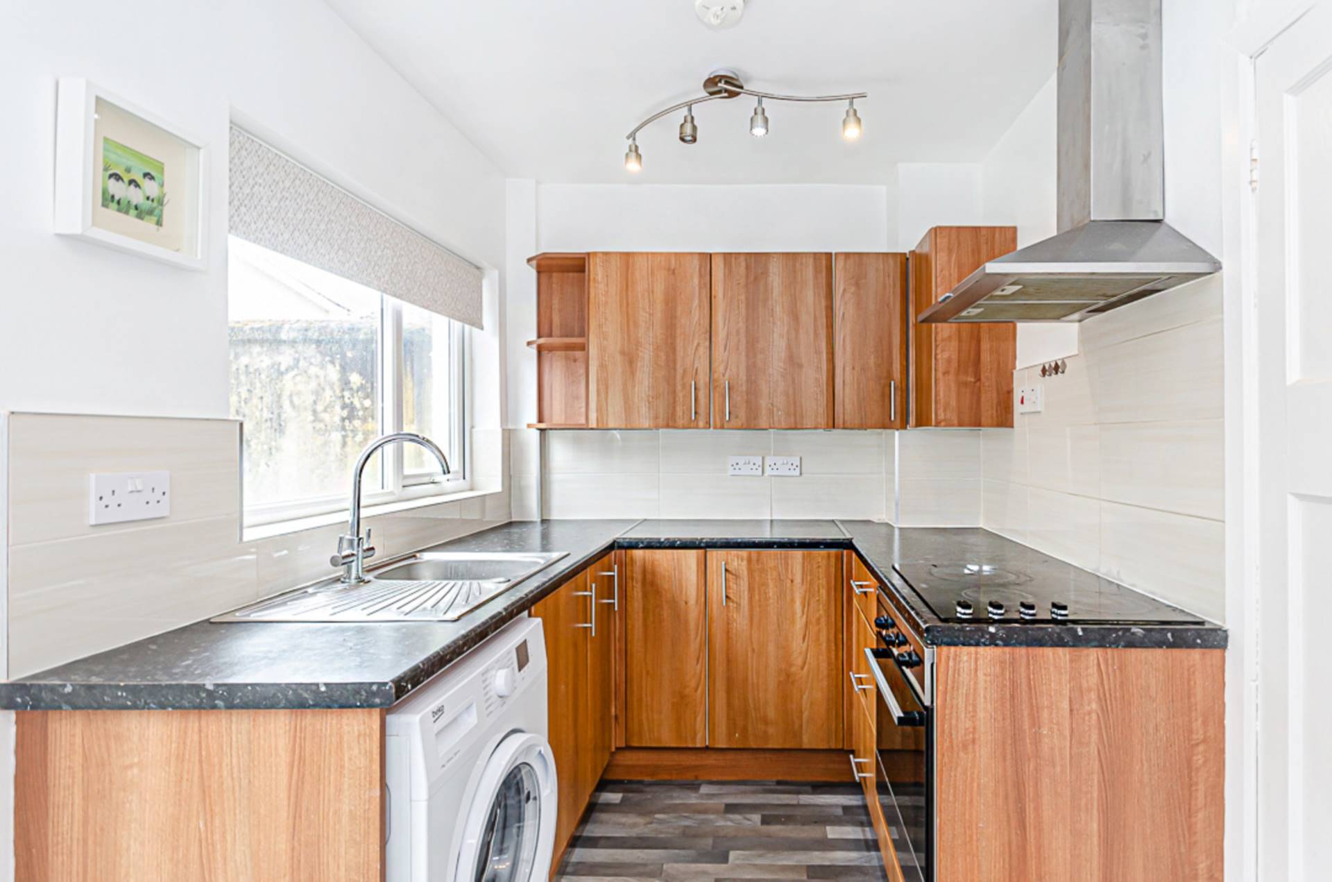 Range of high and low level fitted units, stainless steel integrated oven, ceramic hob, stainless steel extractor canopy, part tiled walls, spotlights, plumbing for washing machine and space for dining area