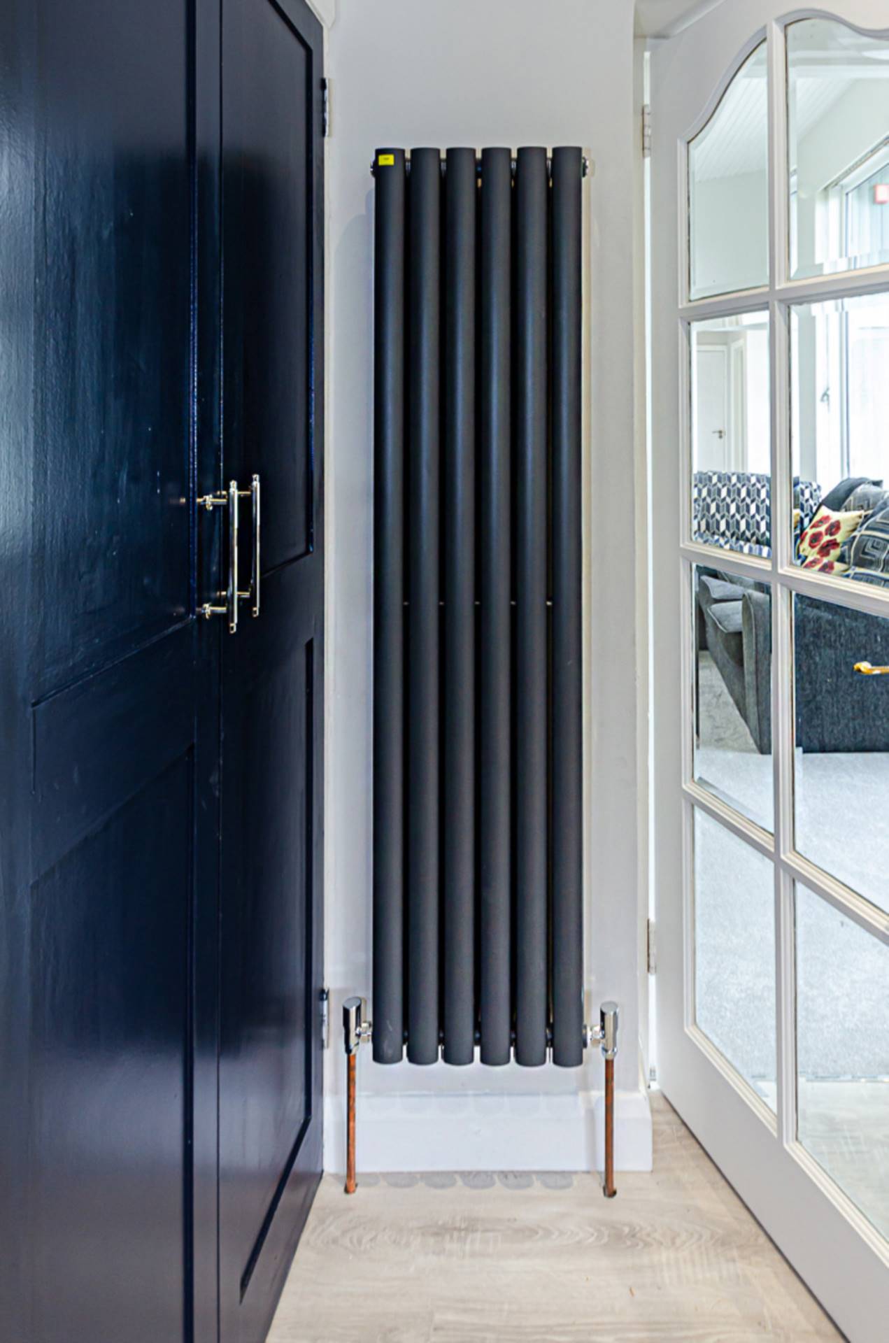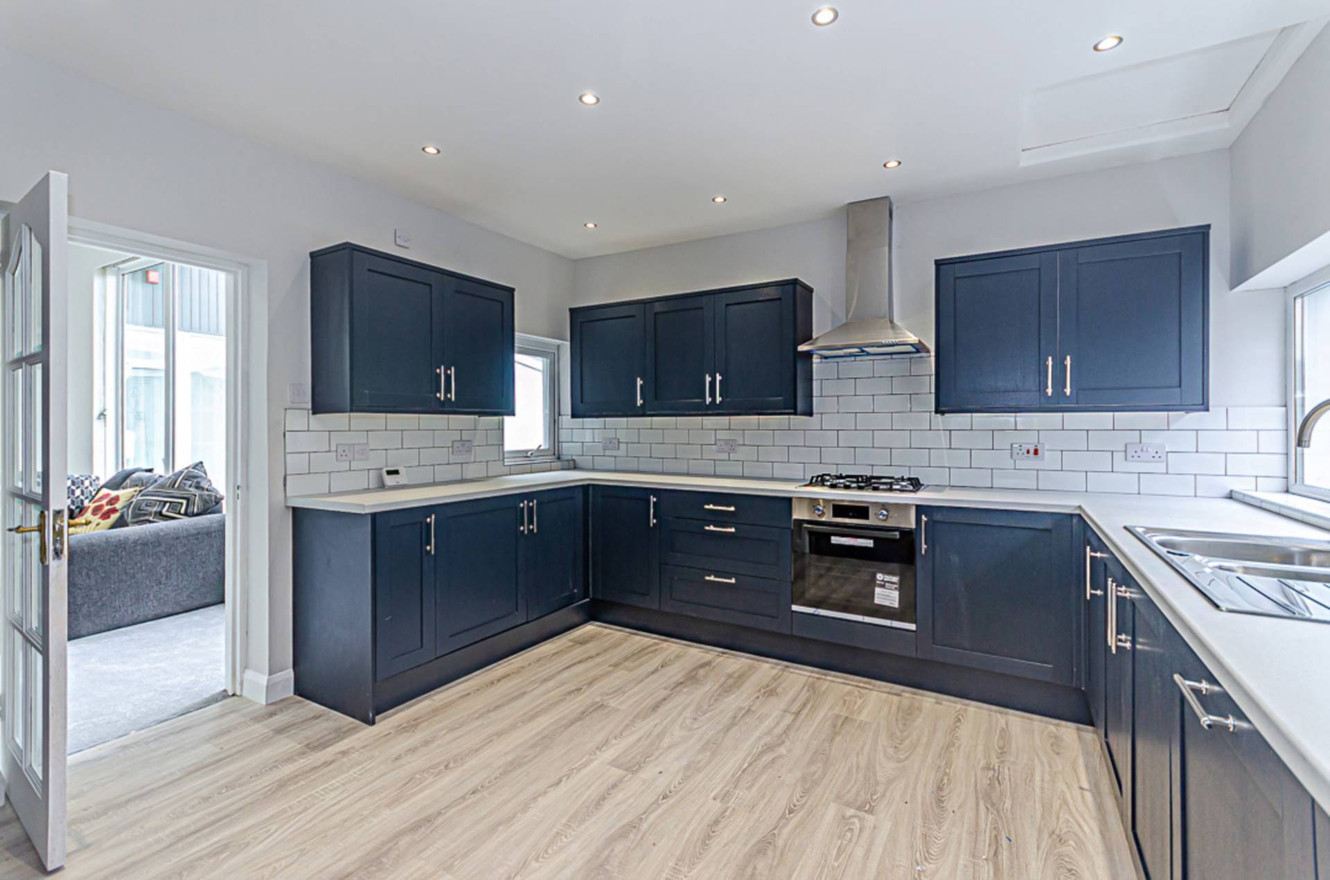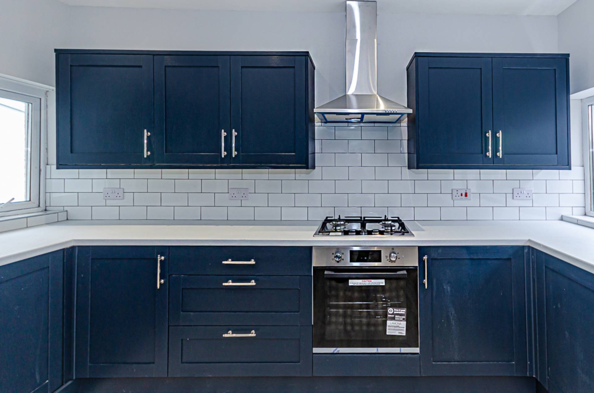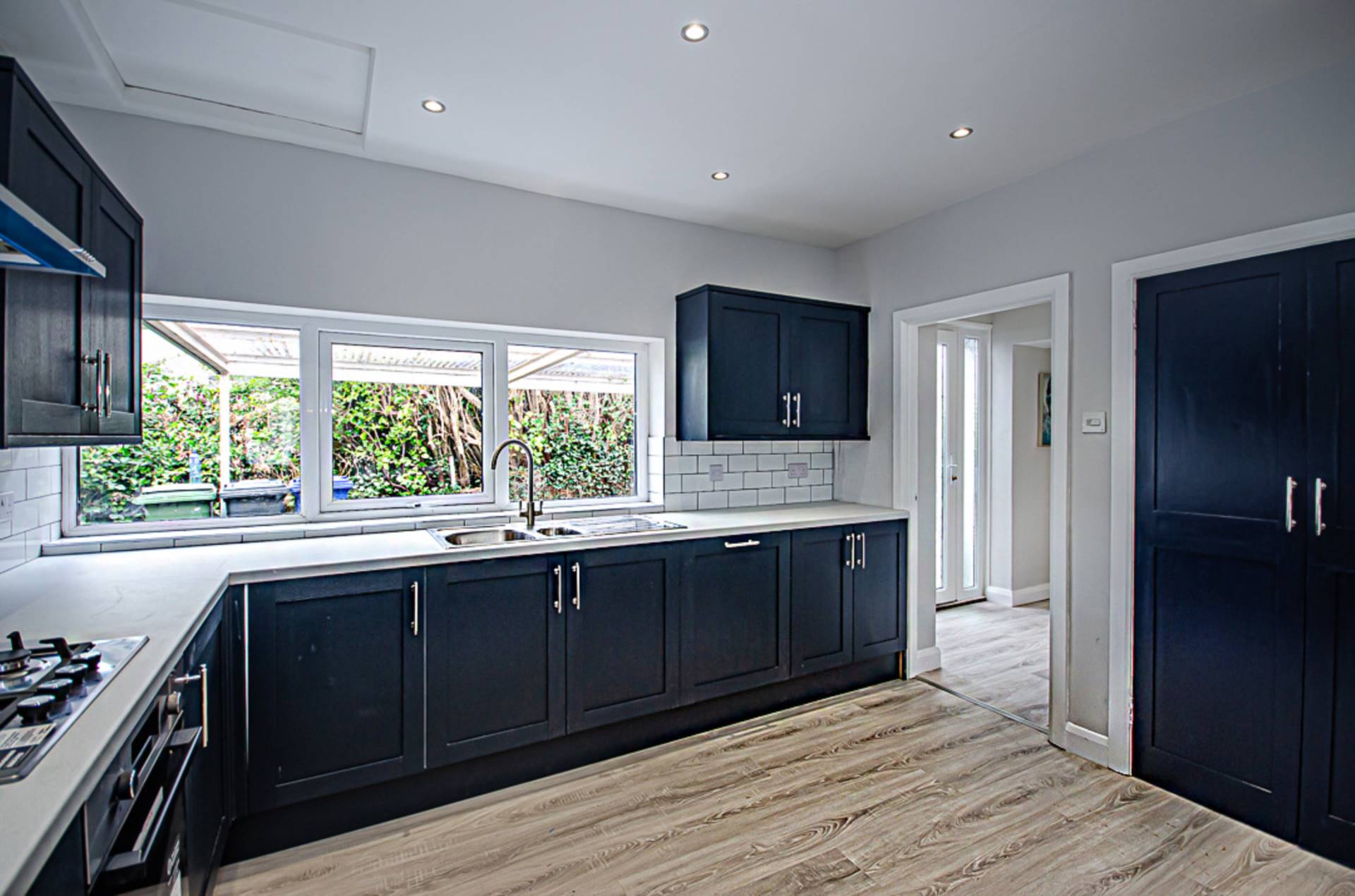 Newly fitted kitchen with range of high and low level fitted units in navy finish, stainless steel oven, gas hob, stainless steel extractor canopy, stainless steel bowl and a half sink, integrated dishwasher, integrated fridge, pantry, part tiled walls, timber laminate floor, grey vertical radiator and recessed spotlights