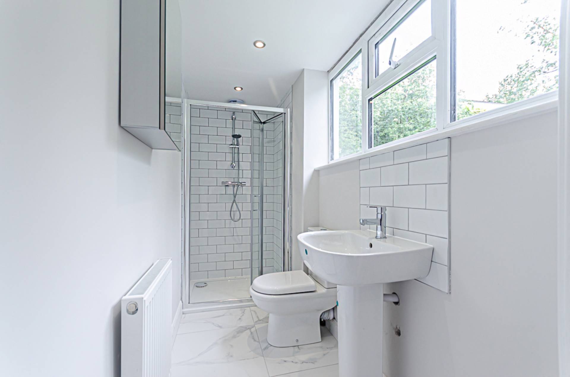 Newly fitted shower room - tiled shower enclosure with thermostatic shower, wash hand basin, W.C, part tiled walls, marble effect ceramic tiled floor, recessed spotlights and extractor fan