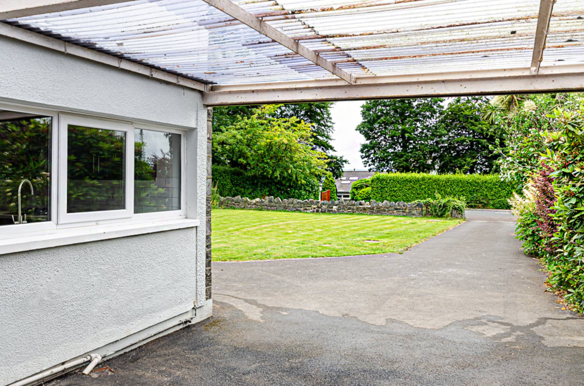 Corner site protected by trees. Front garden in lawn with driveway for multiple cars, car port and outside storeroom. Rear garden in lawn, paving, tiled patio with garden shed