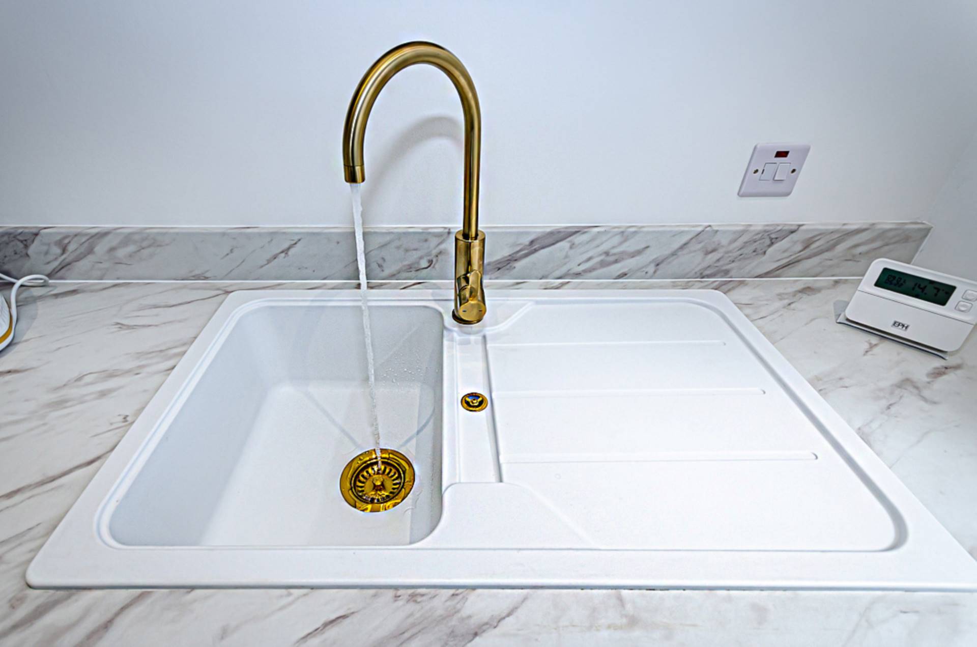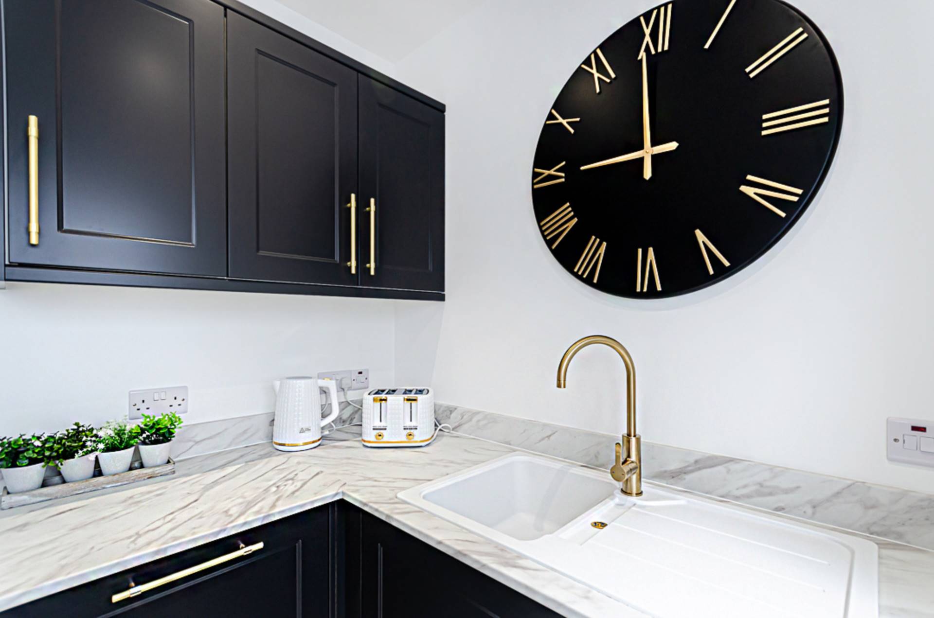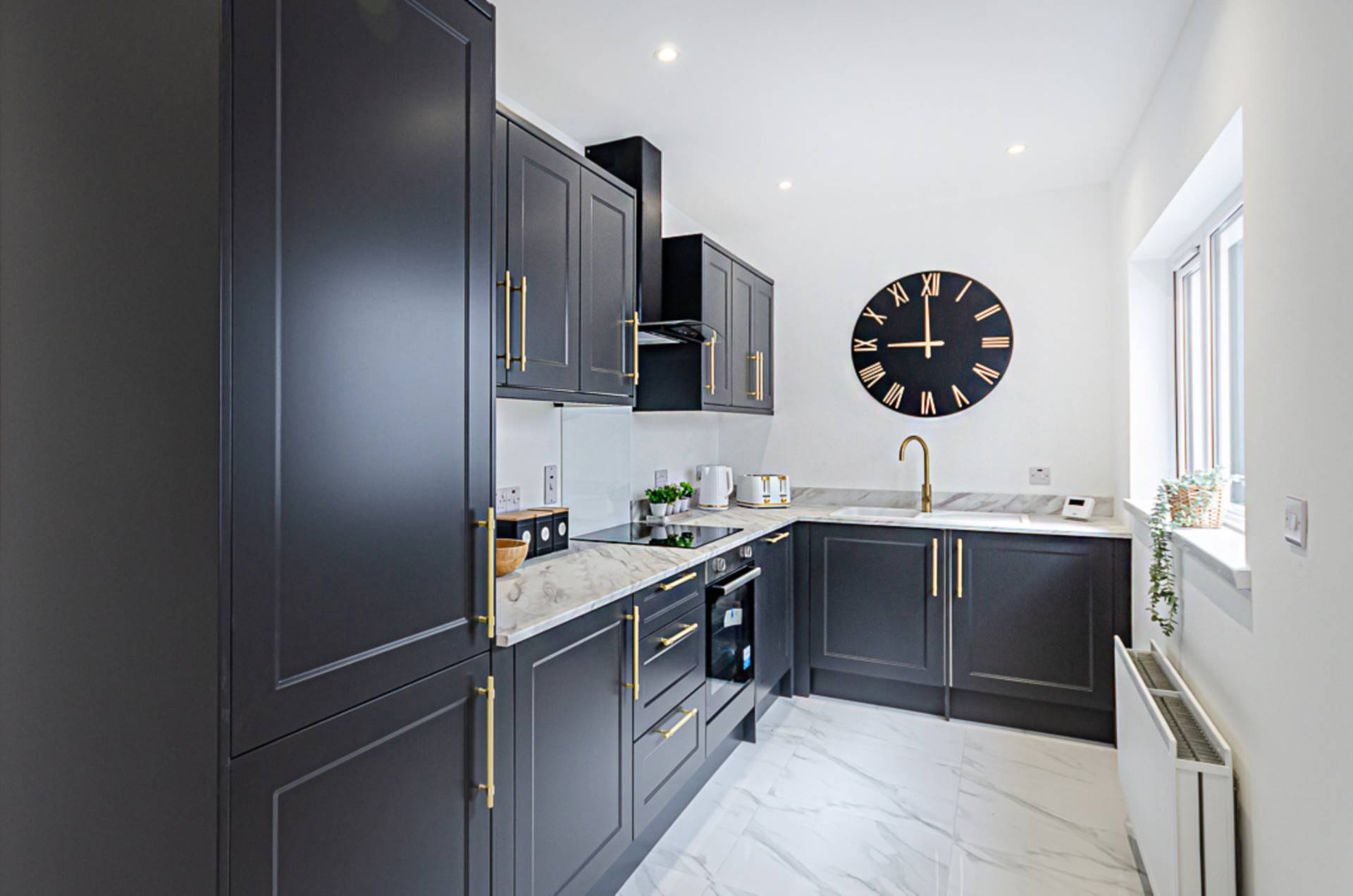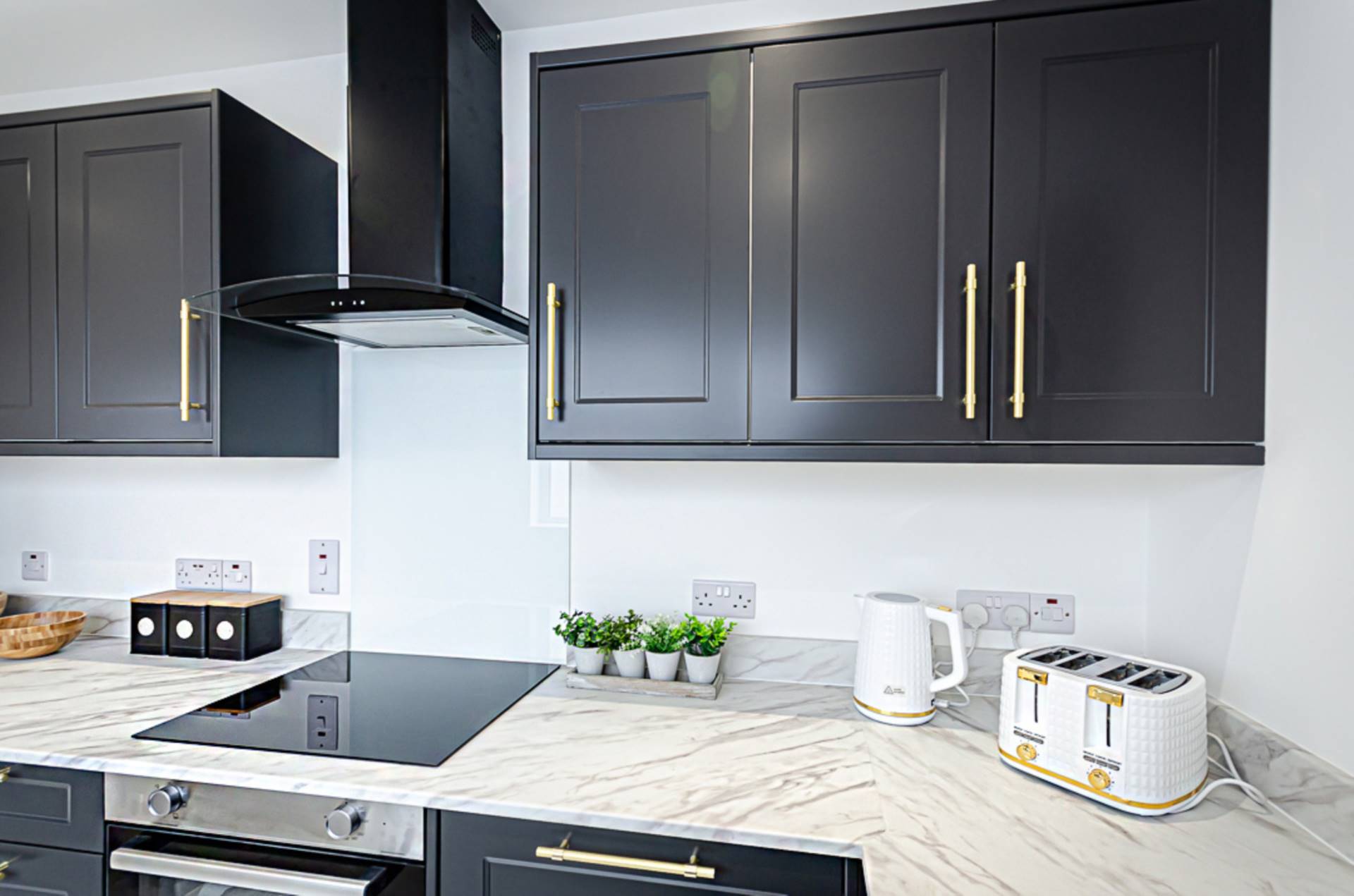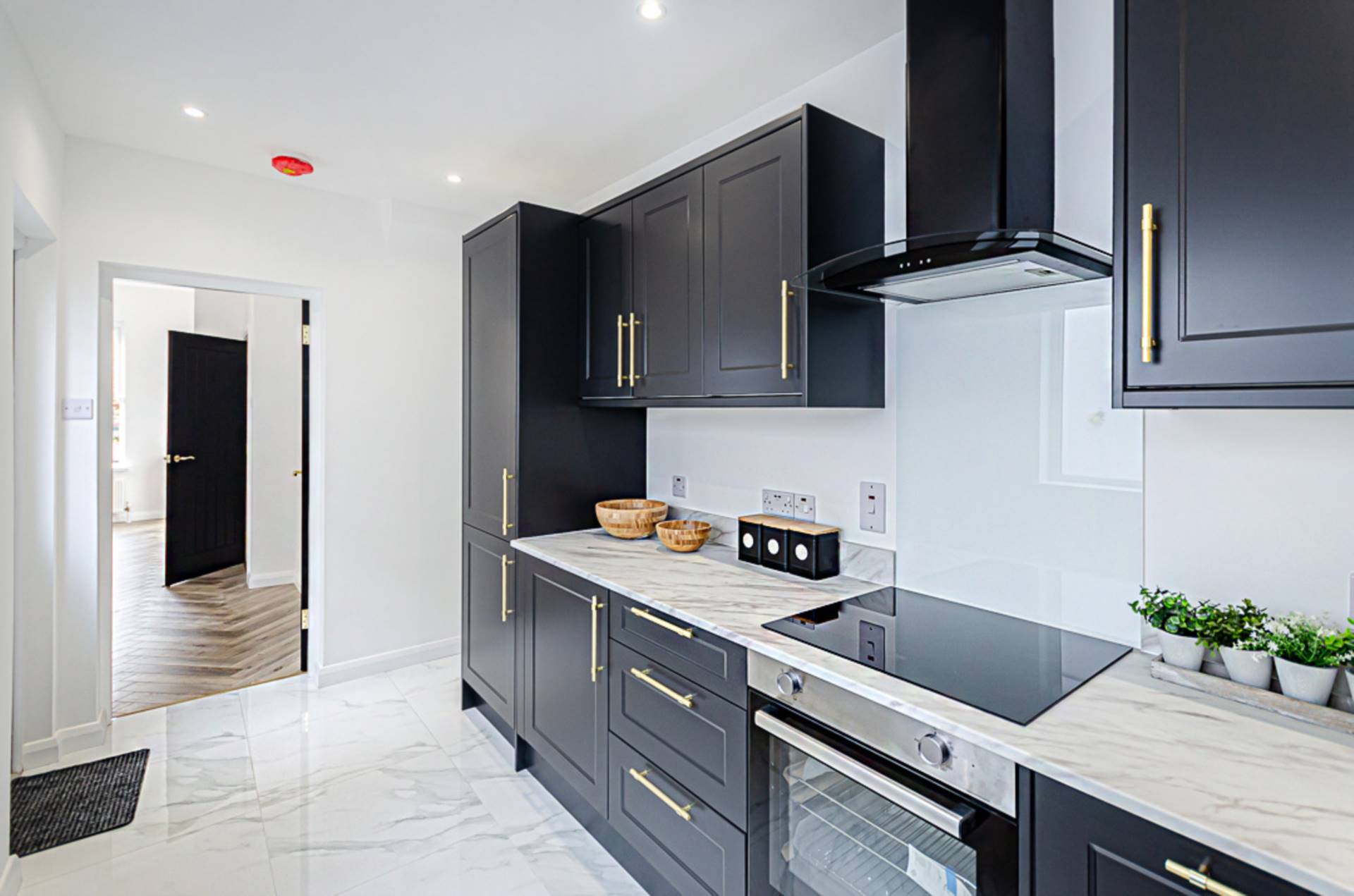 Contemporary newly fitted kitchen with high and low level units, stainless steel oven, ceramic hob, glass splashback, black and glass extractor canopy, white sink with brass tap and fittings, plumbing for washing machine and dishwasher, porcelain tiled floor and recessed spotlights