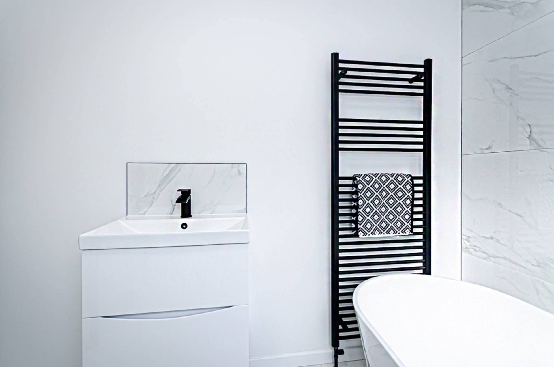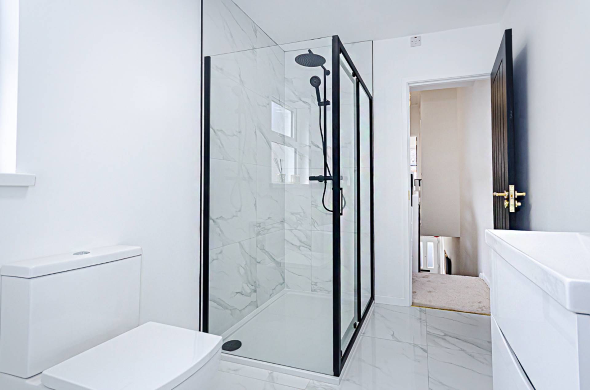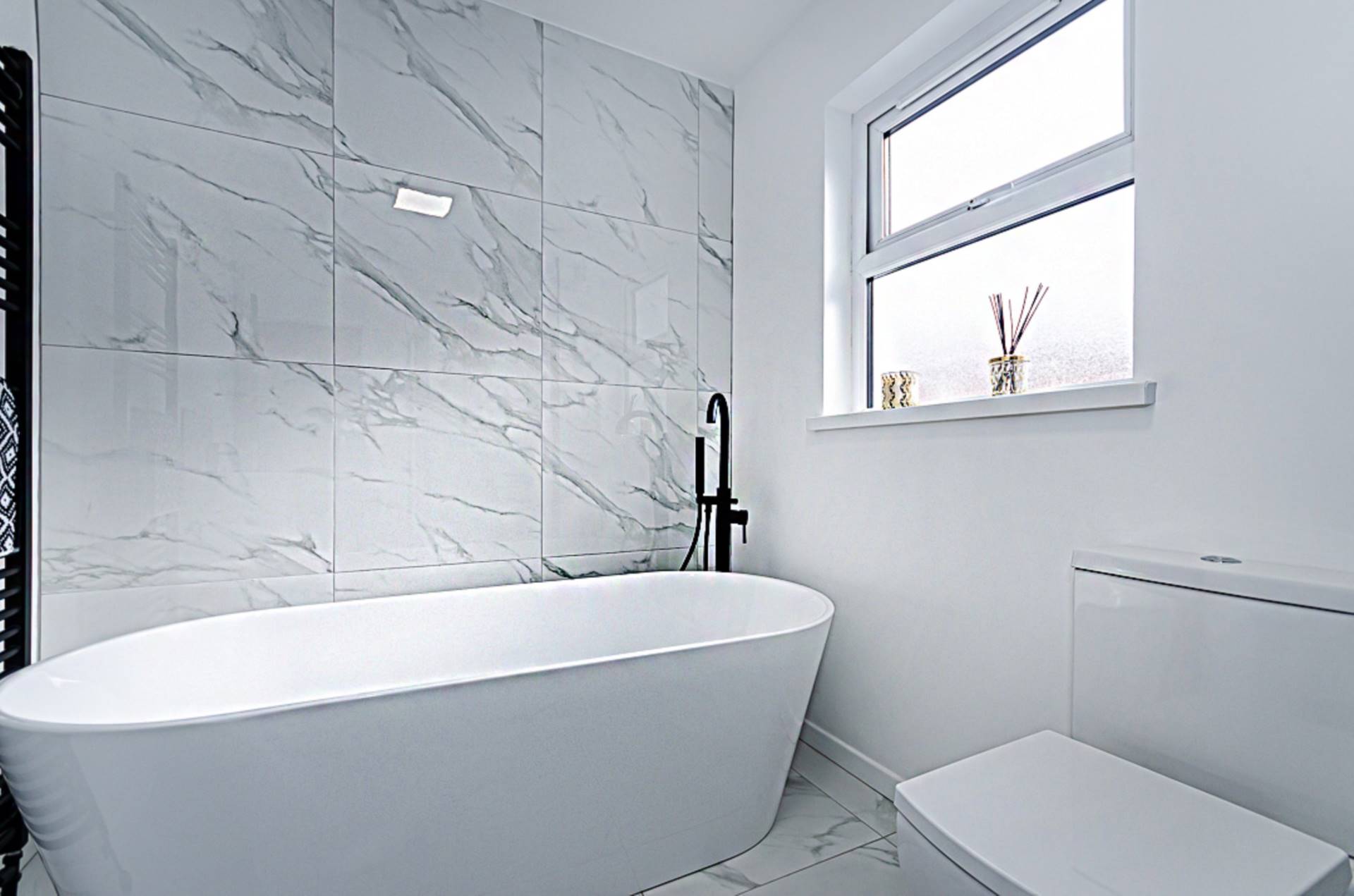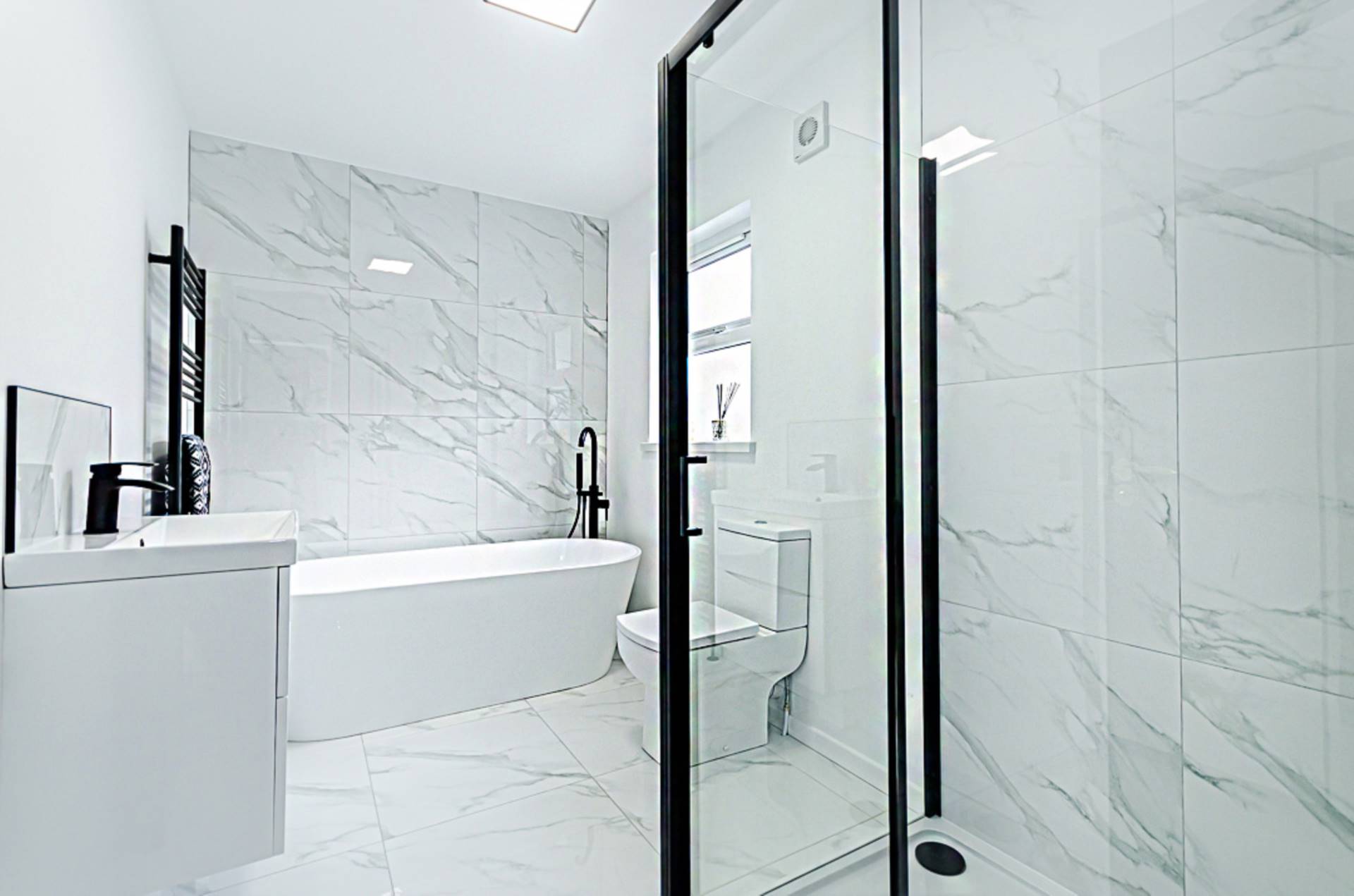 Freestanding bath with black taps and part marble effect porcelain tiled walls, wash hand basin in wall hung vanity unit with drawers, black tap and fittings and splashback, W.C, large shower cubicle with black thermostatic shower, dual shower heads and marble effect porcelain tiling, marble effect porcelain floor tiling, recessed spotlights and extractor fan