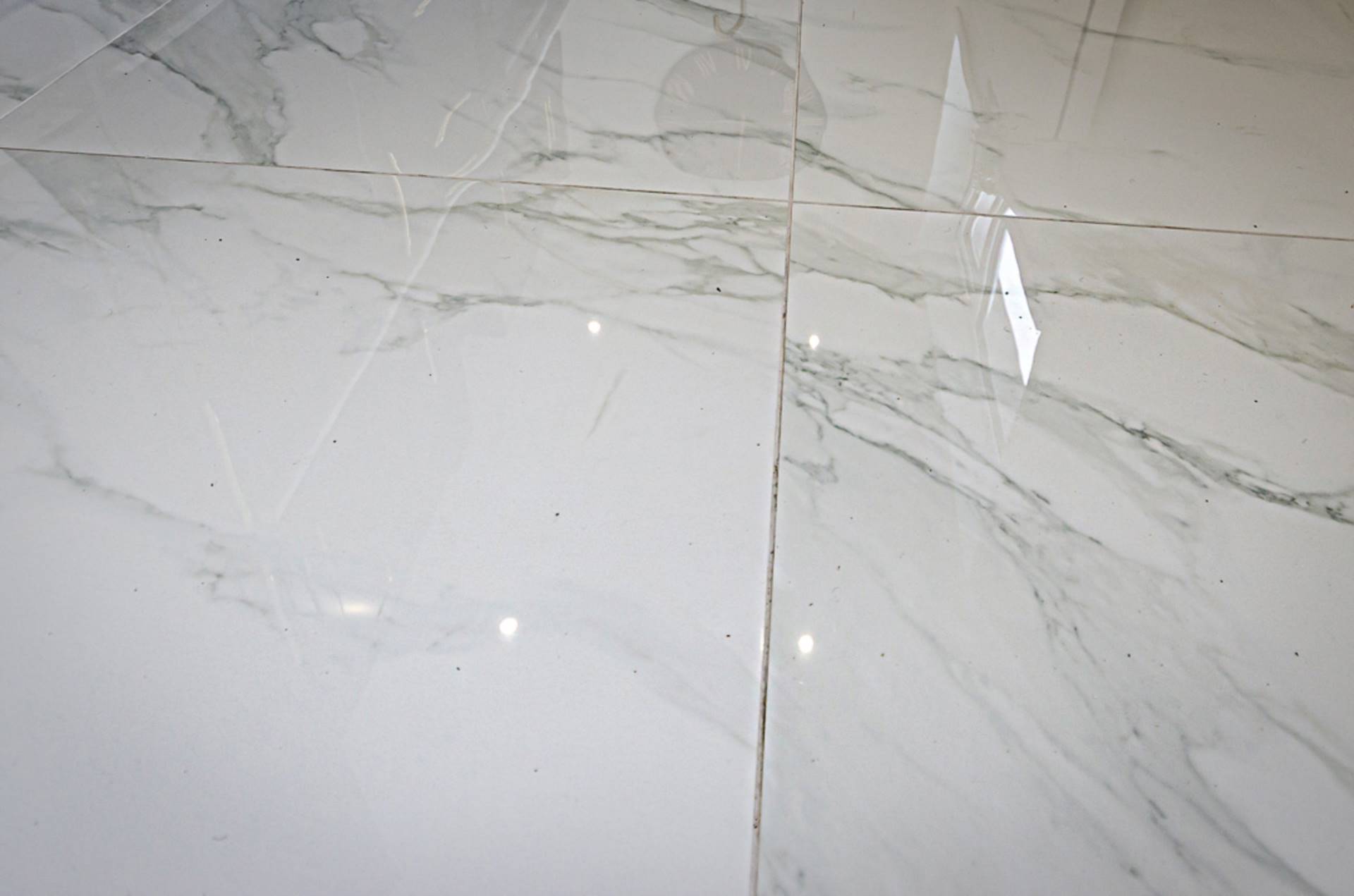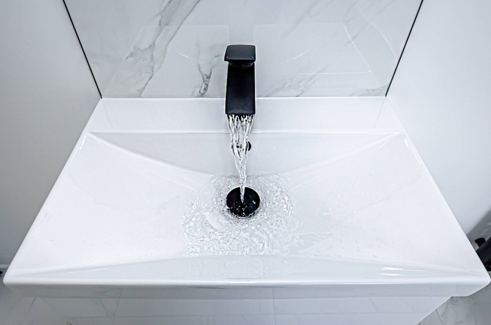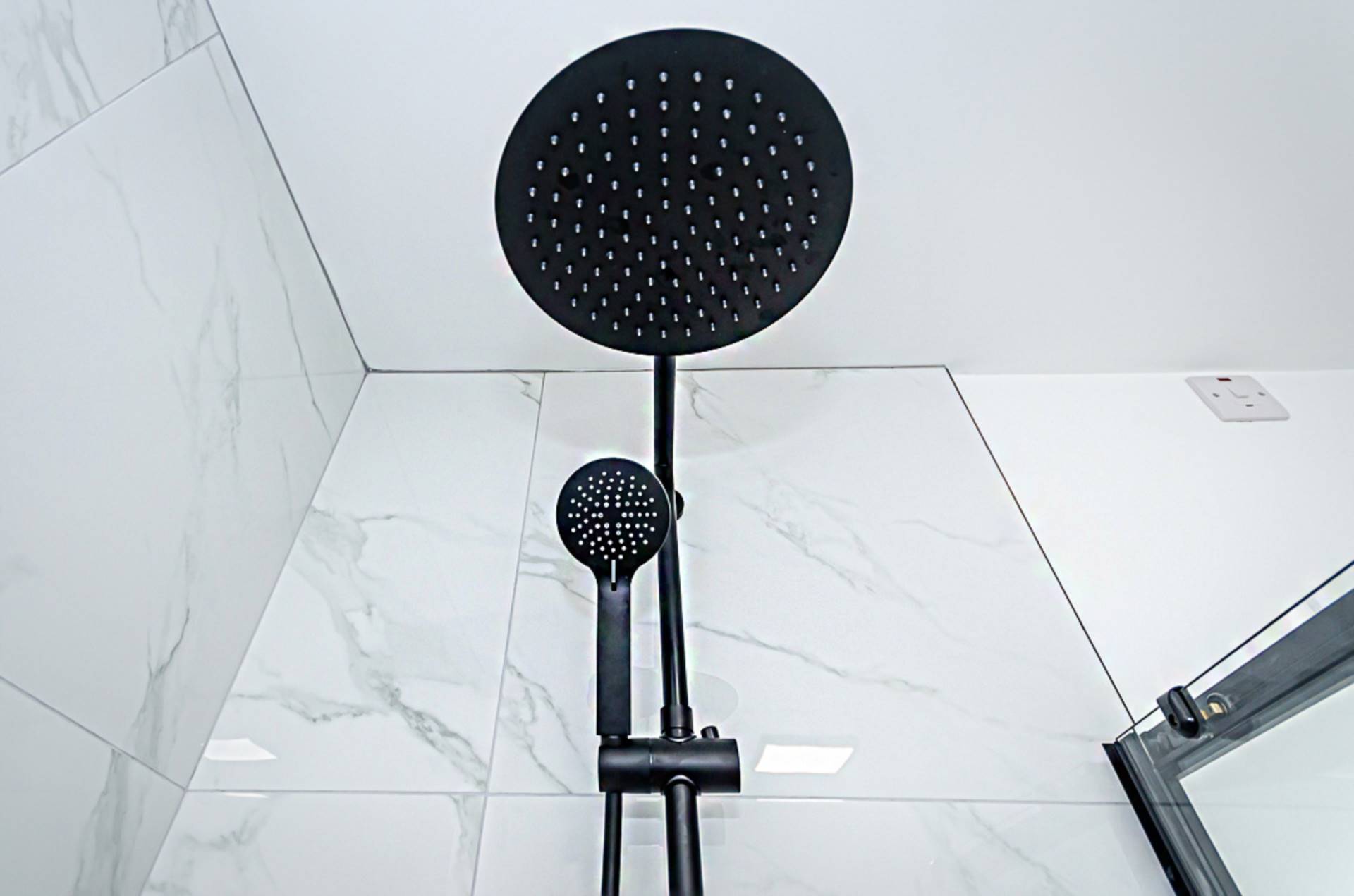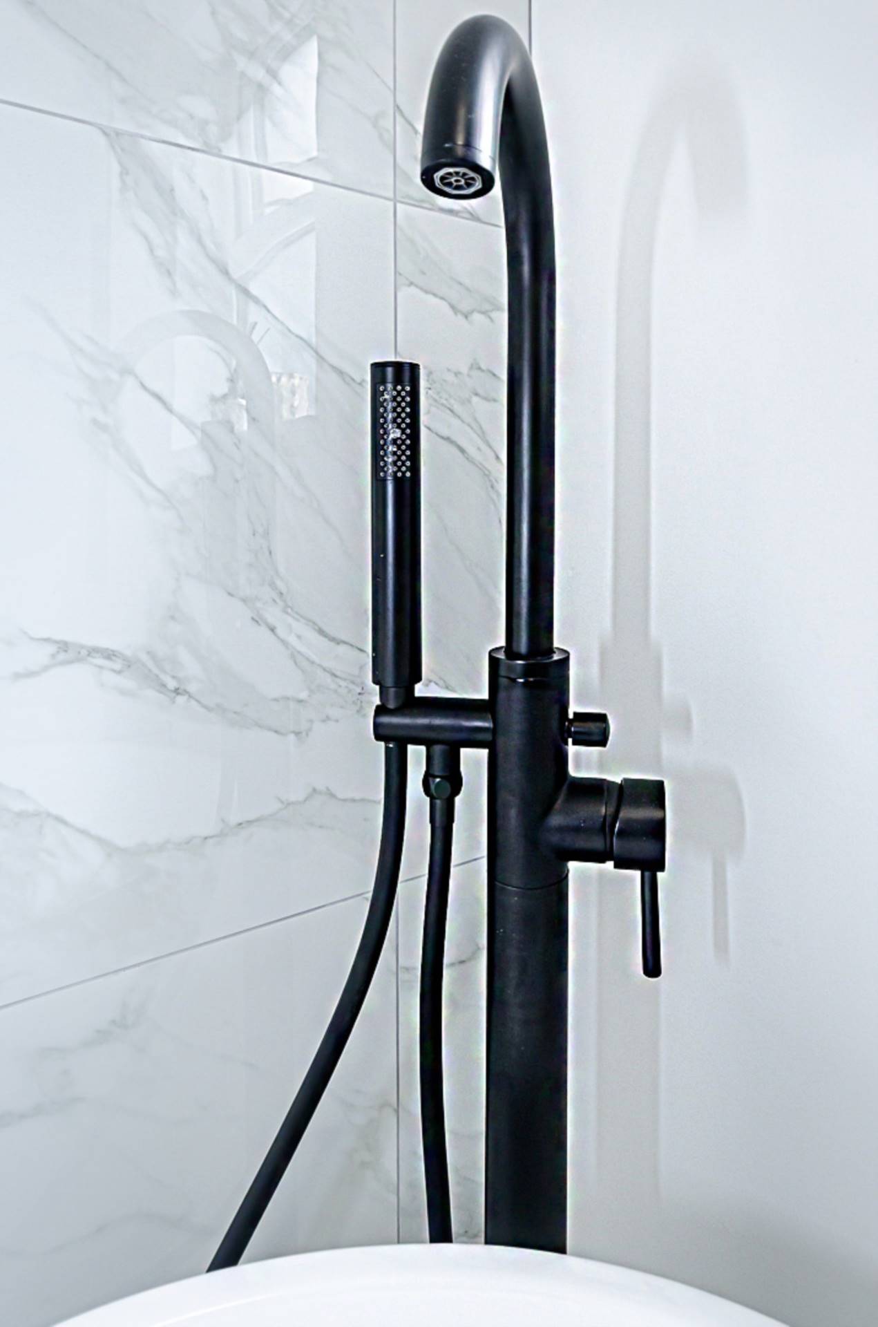 Freestanding bath with black taps and part marble effect porcelain tiled walls, wash hand basin in wall hung vanity unit with drawers, black tap and fittings and splashback, W.C, large shower cubicle with black thermostatic shower, dual shower heads and marble effect porcelain tiling, marble effect porcelain floor tiling, recessed spotlights and extractor fan