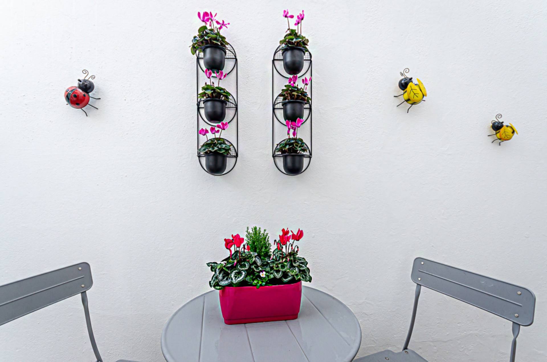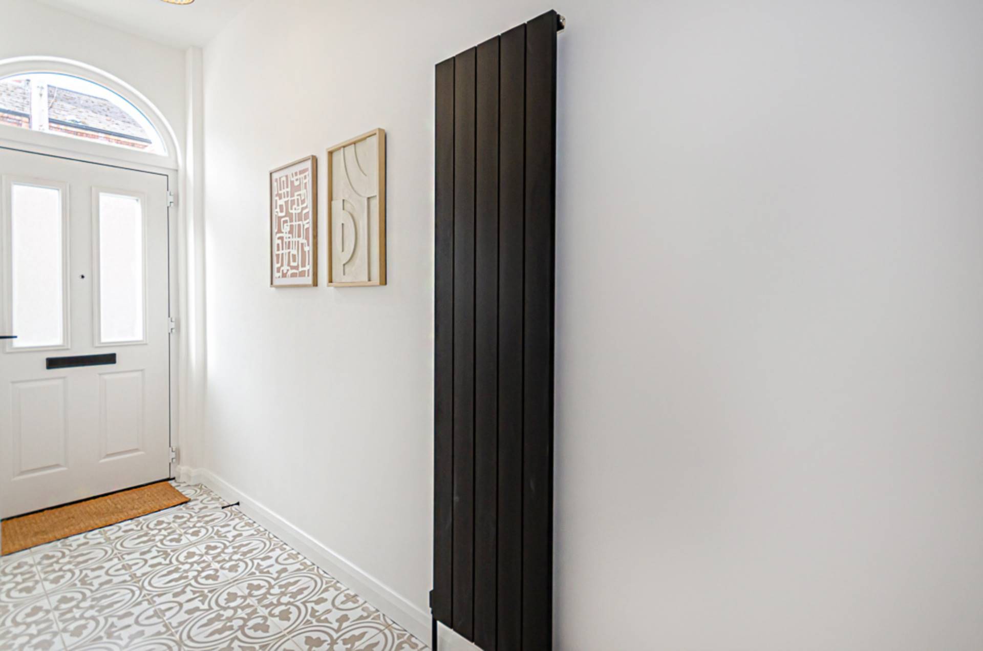 Black vertical radiator and decorative ceramic tiled floor