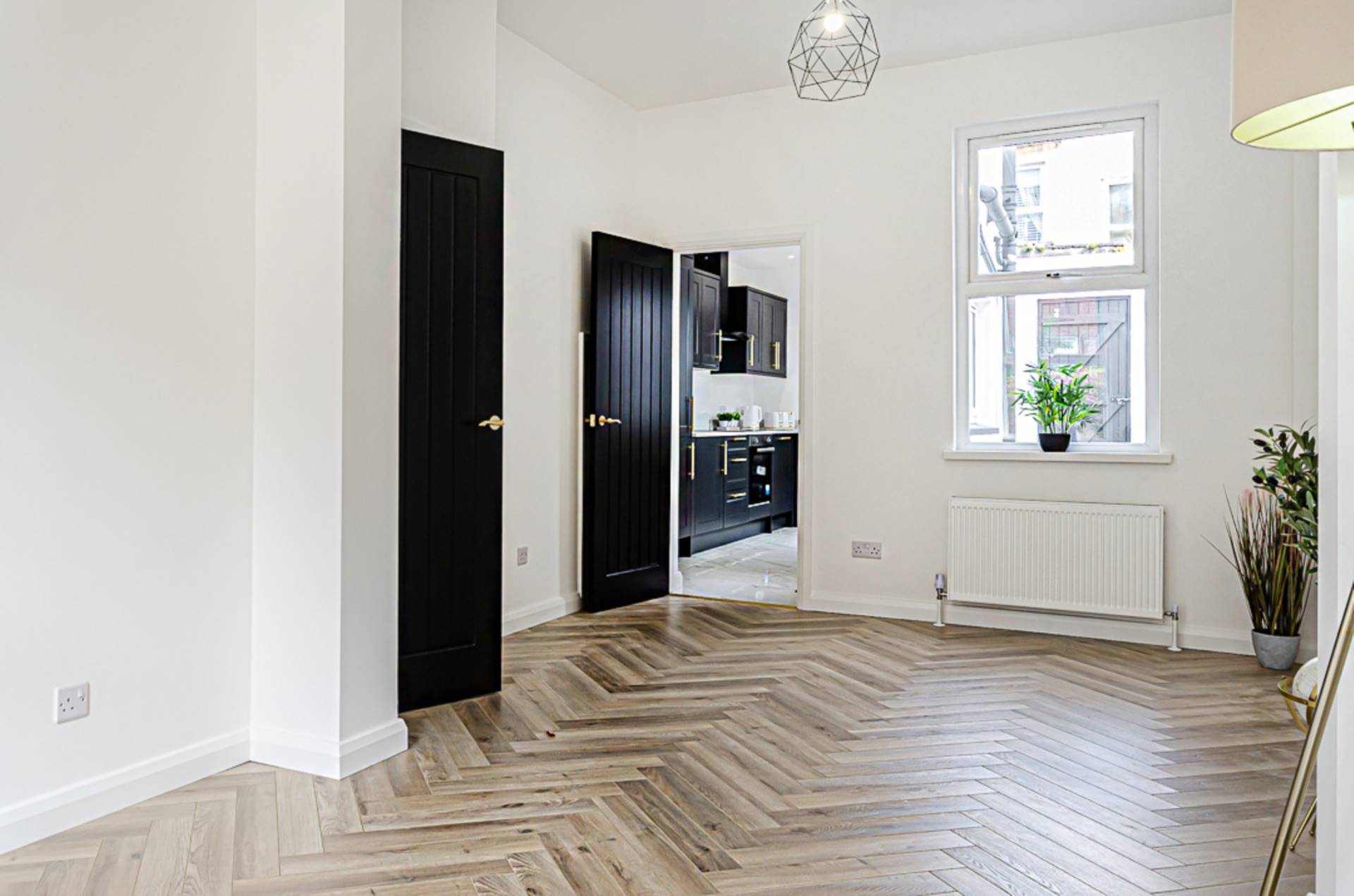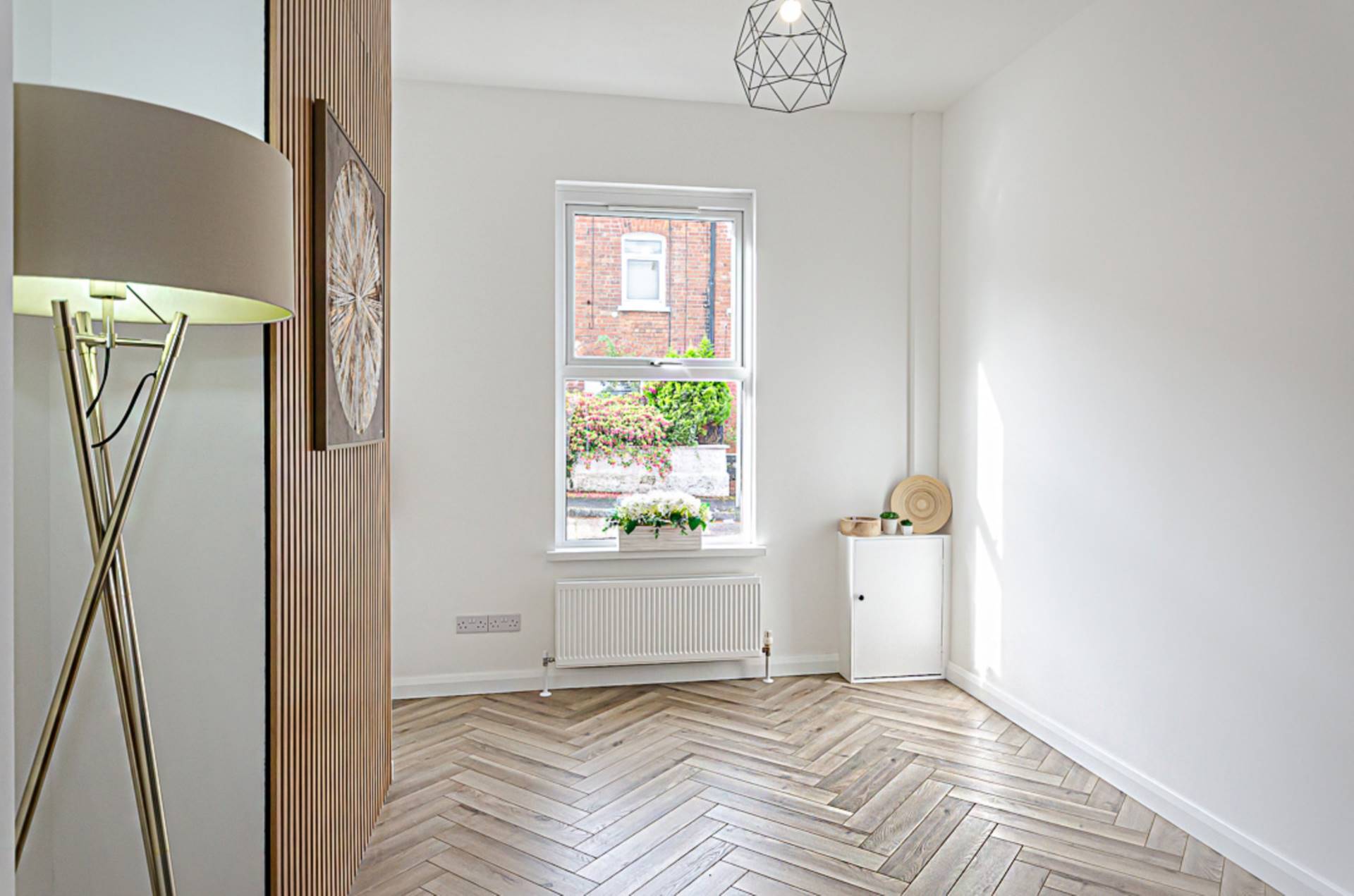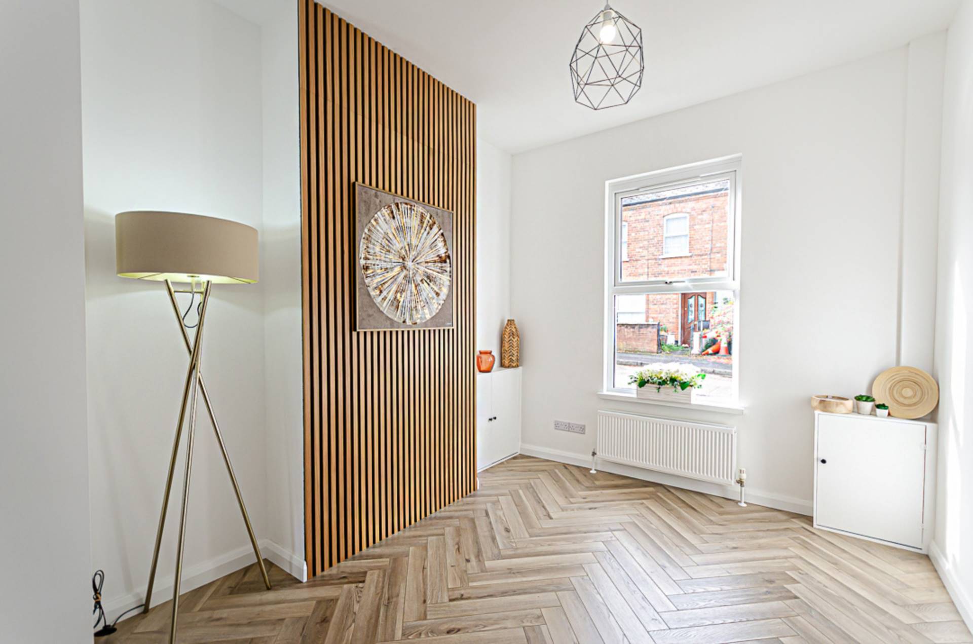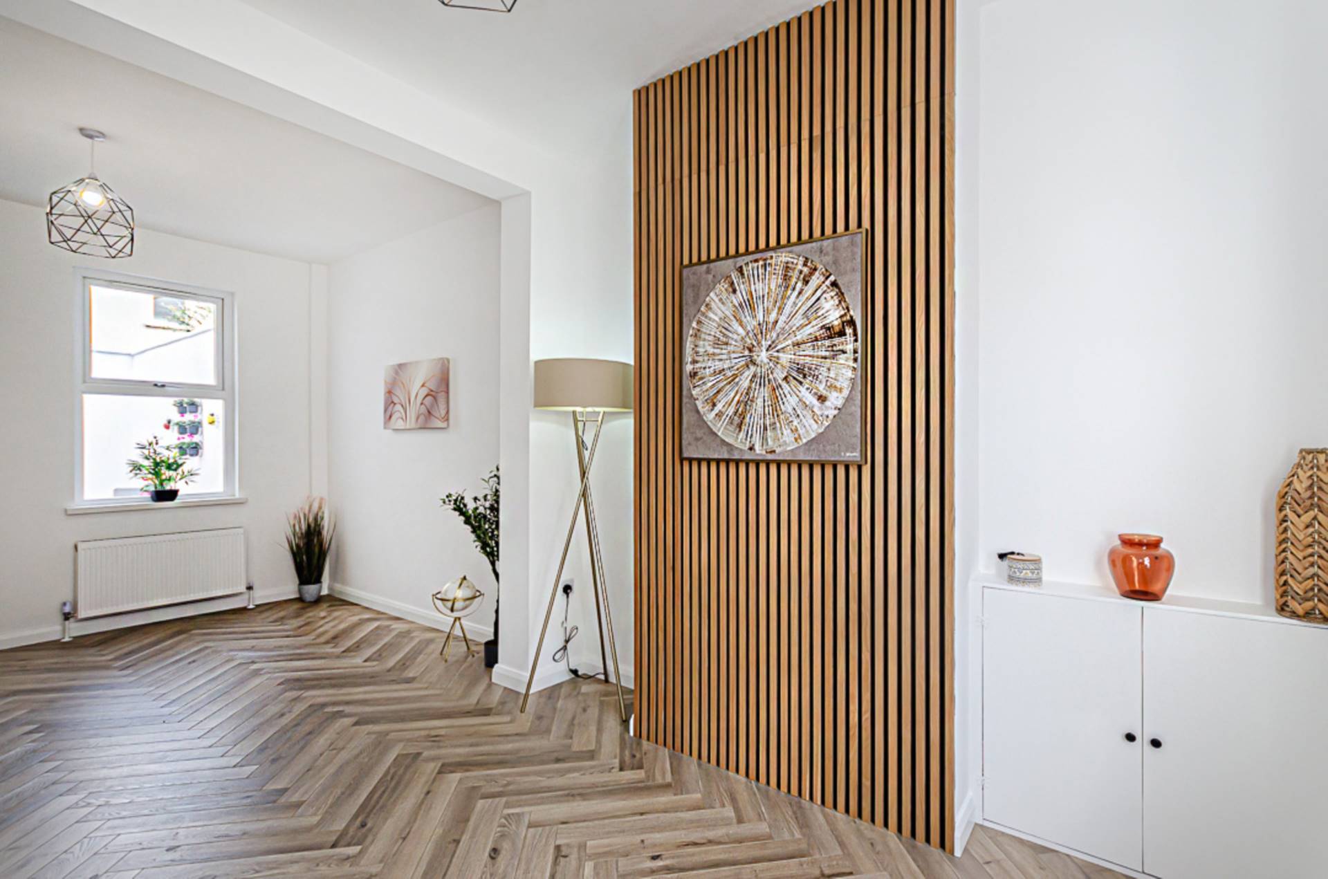Feature chimney breast and herringbone timber laminate floor
