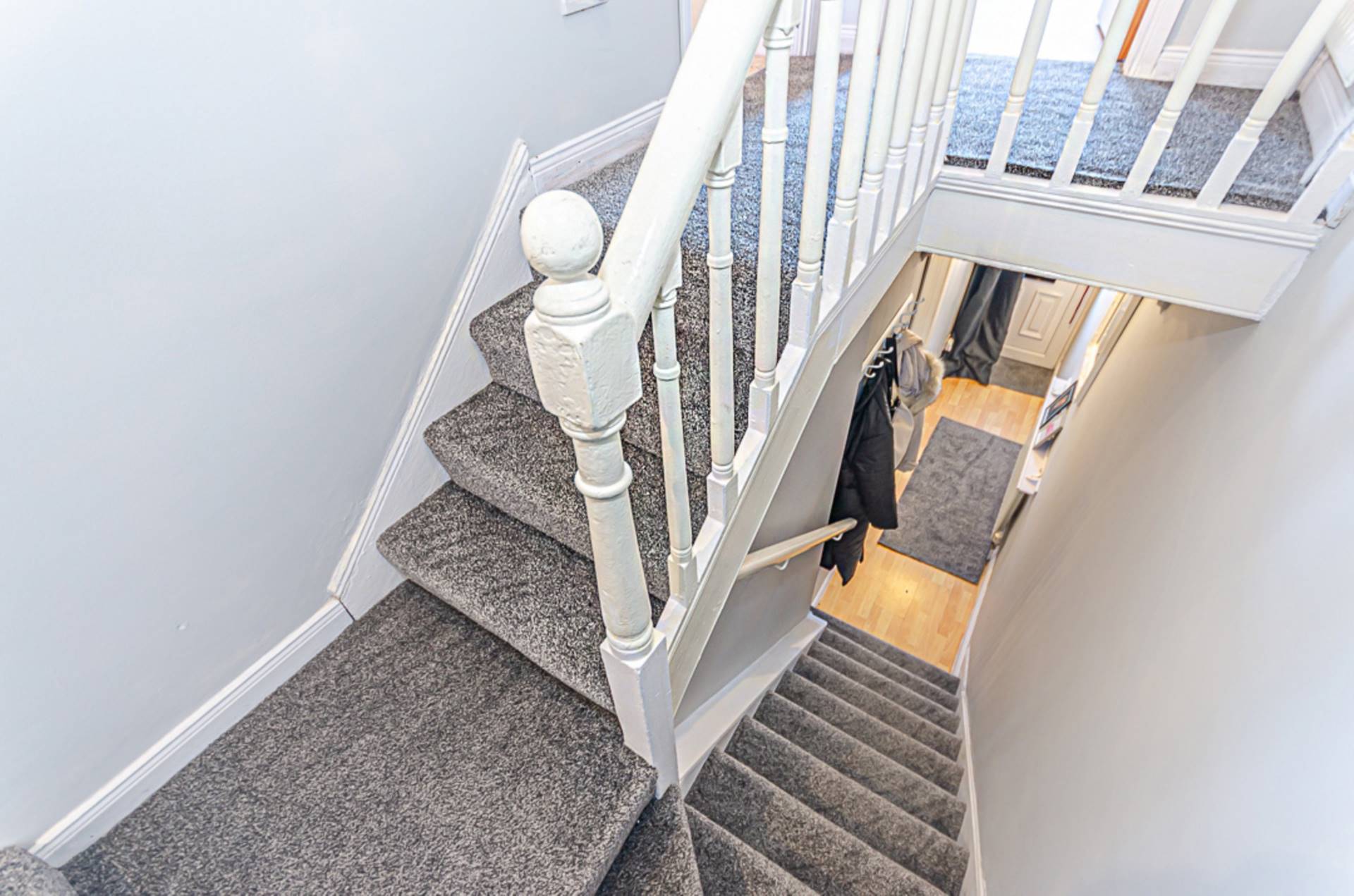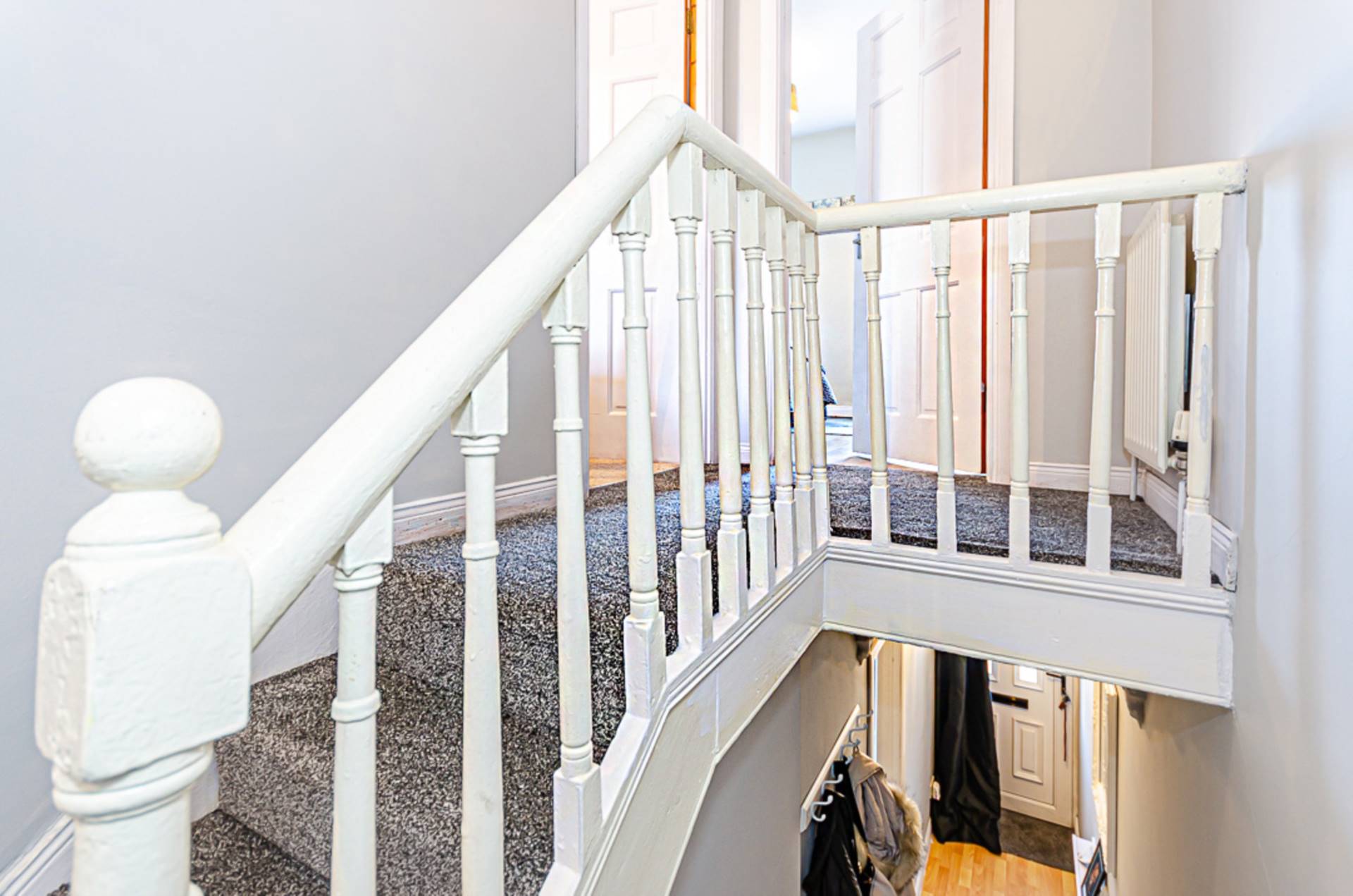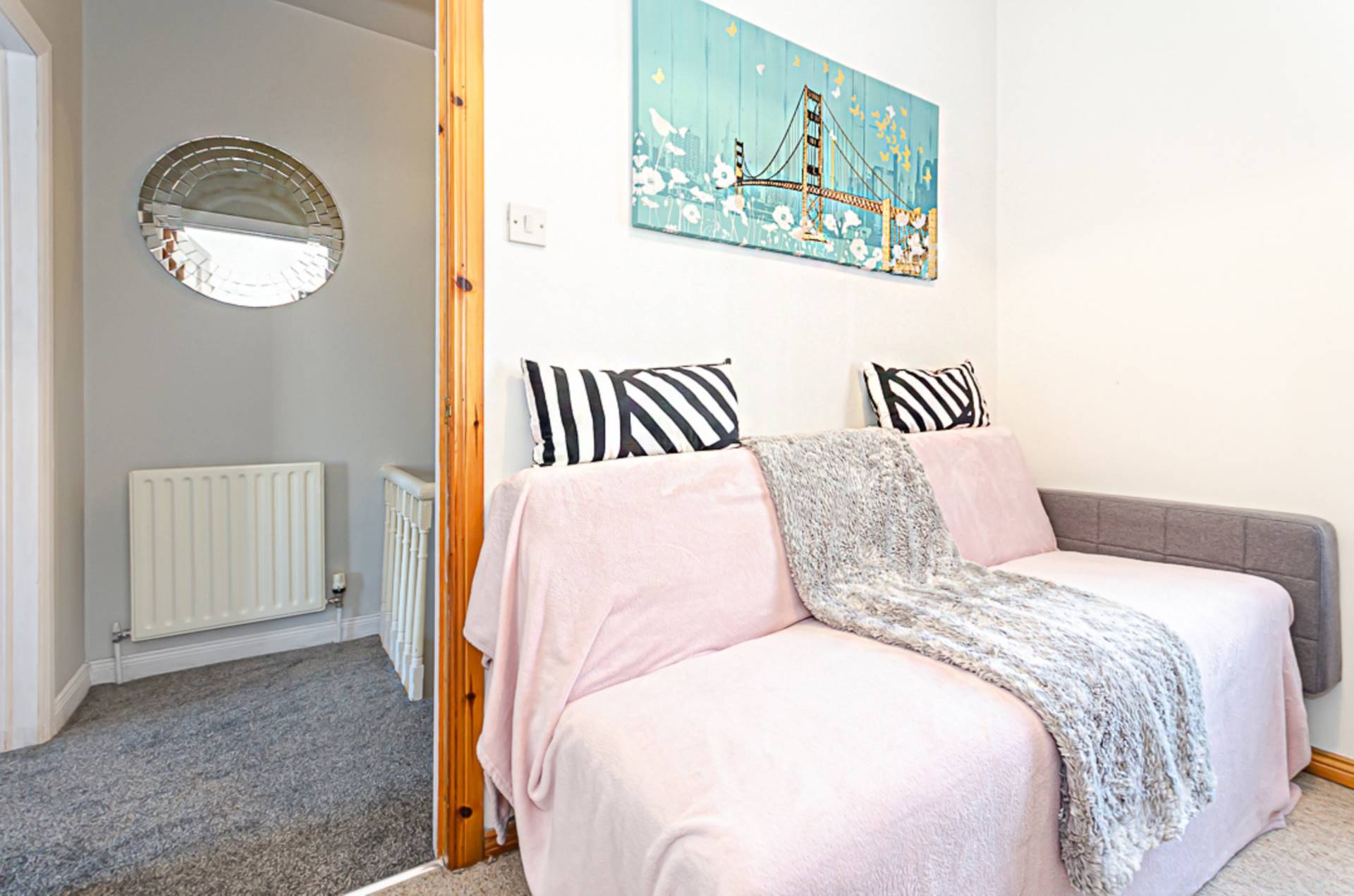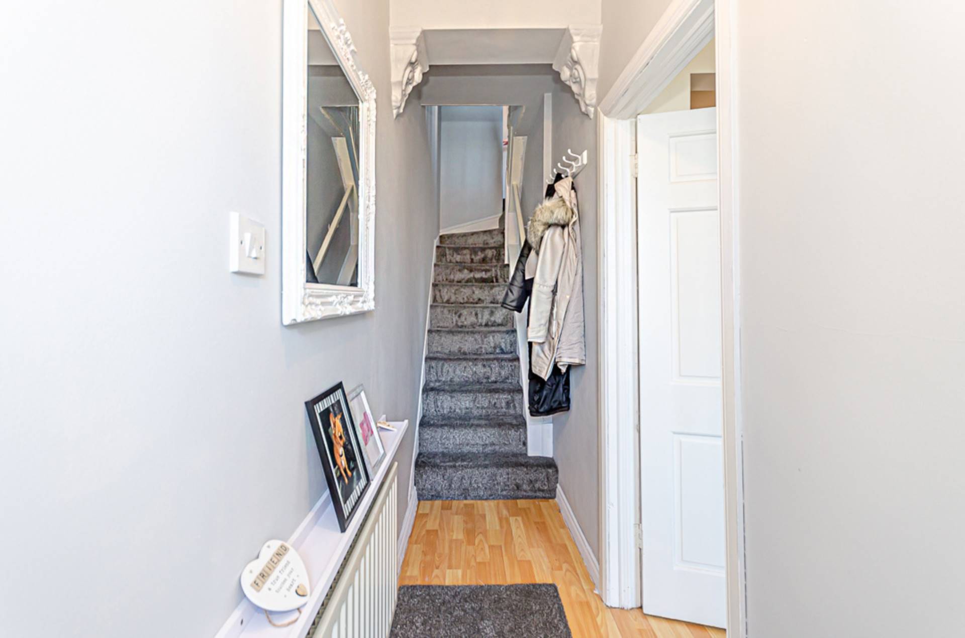 Bay window, cast iron fireplace with wooden surround and tiled hearth, storage under stairs and timber laminate floor