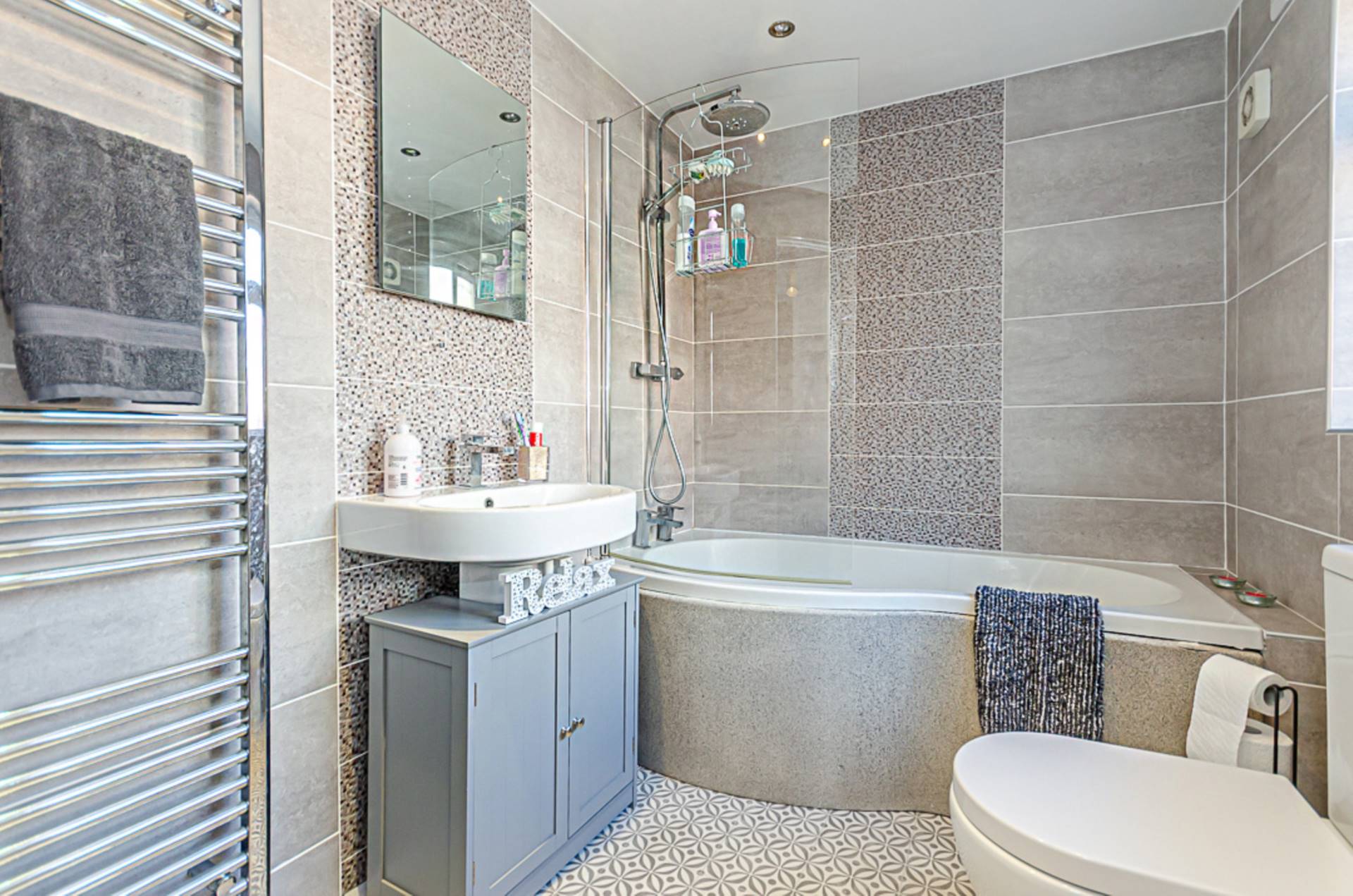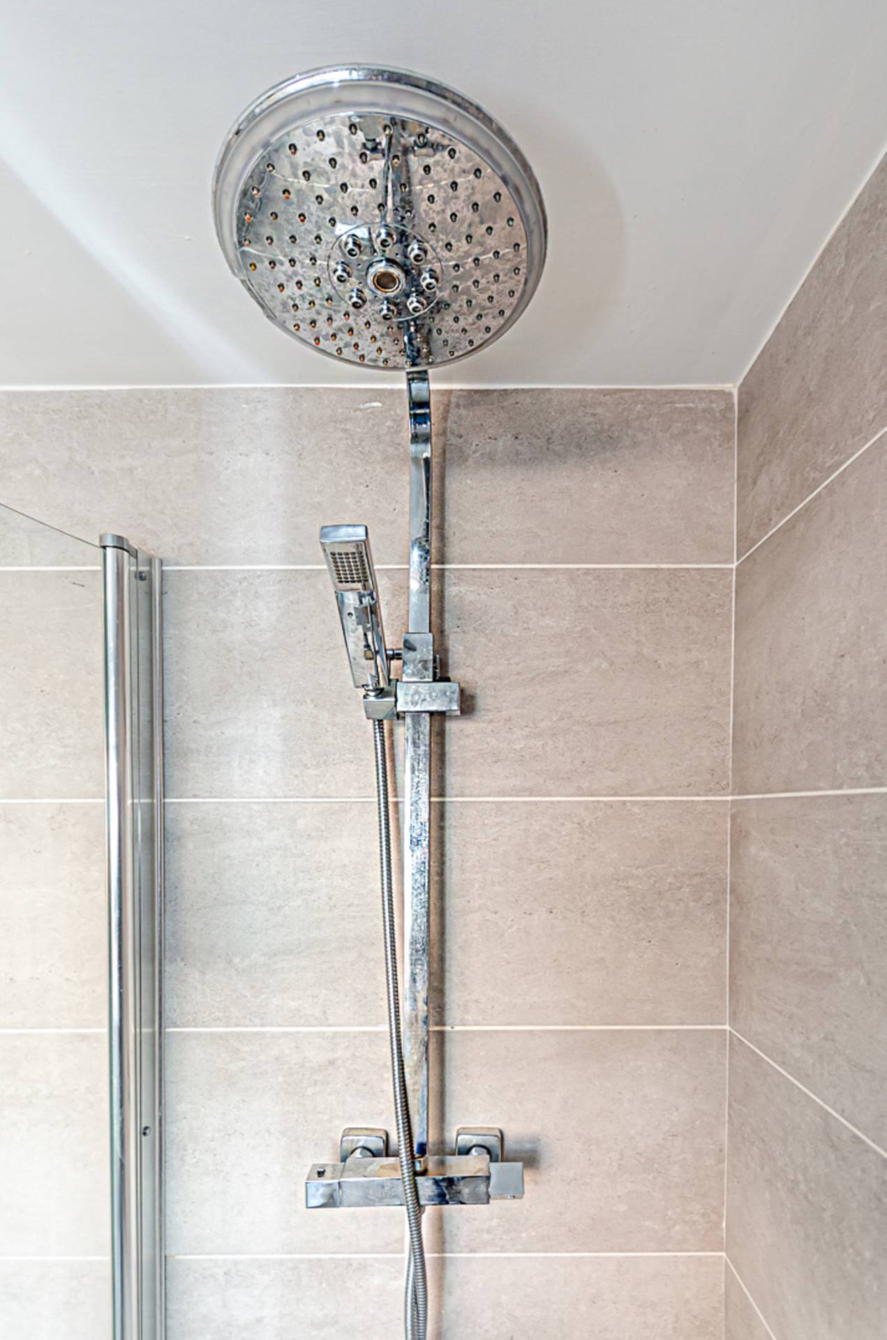 Curved shower bath unit with thermostatic shower (Dual shower heads), shower screen, wash hand basin and W.C., chrome towel rail radiator, modern tiled walls, recessed spotlights and extractor fan