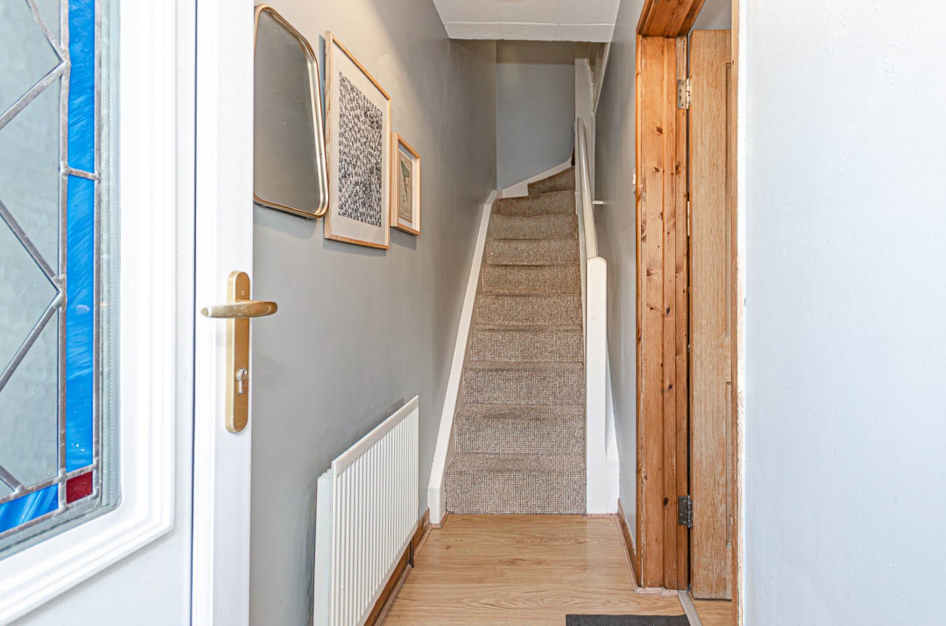 Wood burner in hole in the wall fireplace, storage under stairs and timber laminate floor