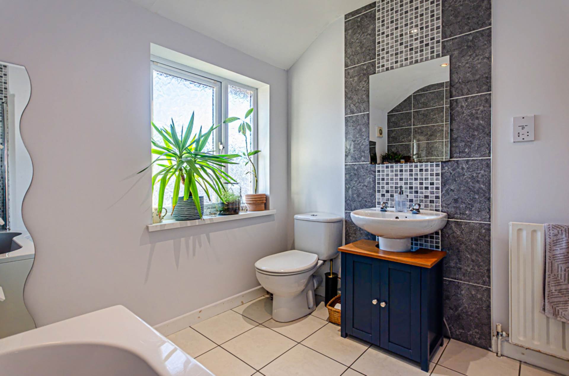 White suite with thermostatic shower and screen over bath, wash hand basin, W.C., contemporary wall tiling, ceramic tiled floor, recessed spotlights and extractor fan