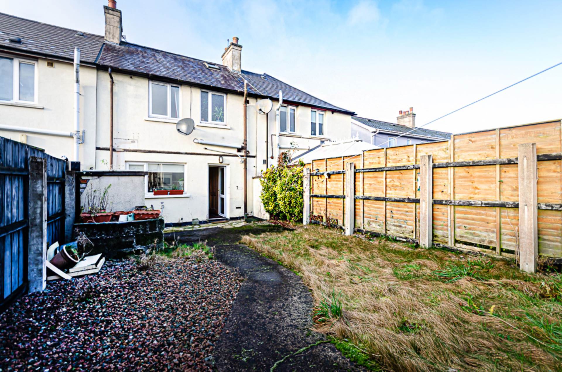 Front garden in path and small stones. Rear garden in concrete area, lawn and small stones, with outside storage