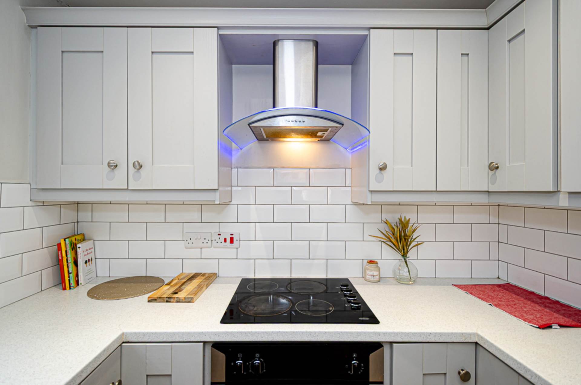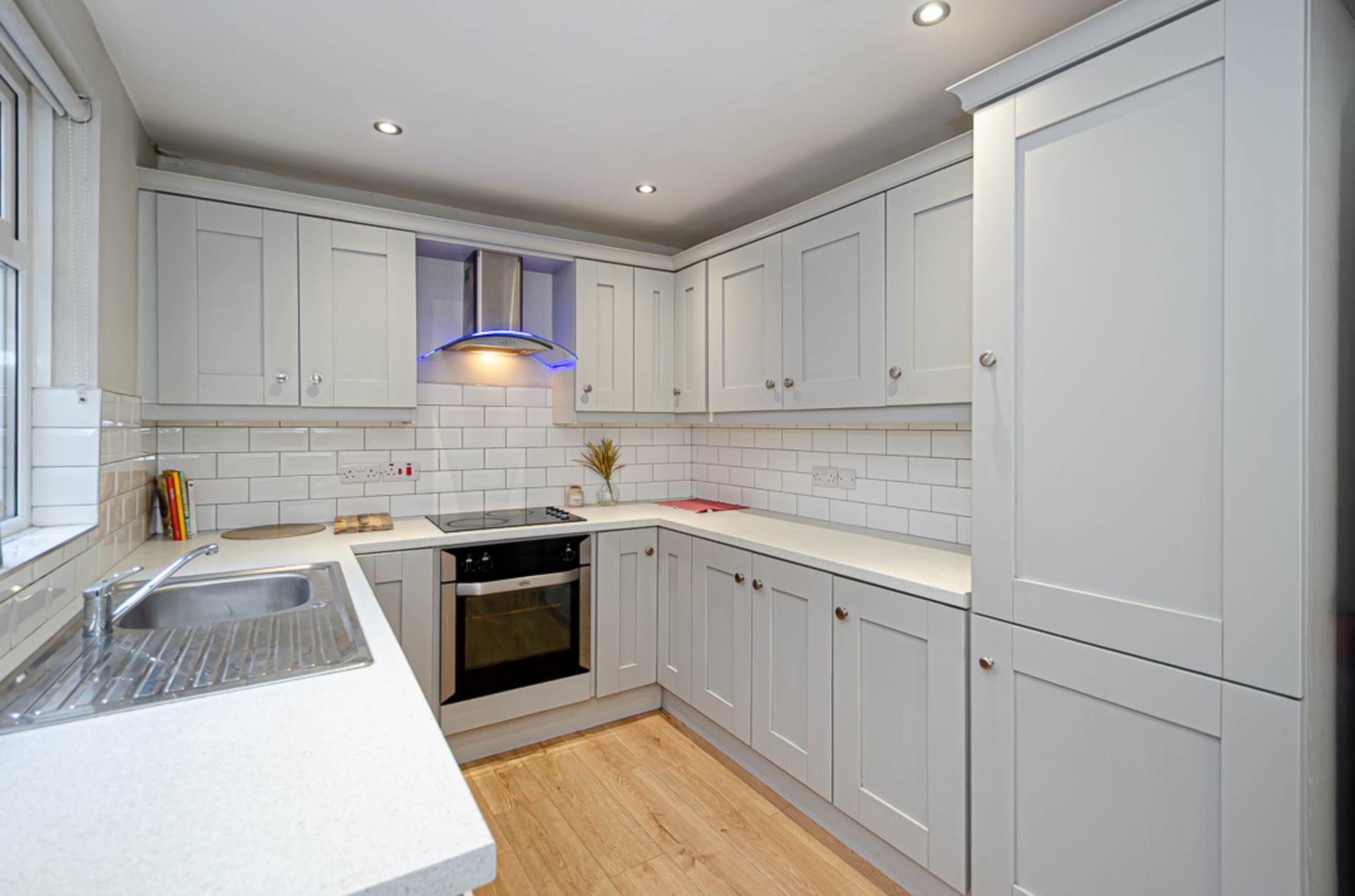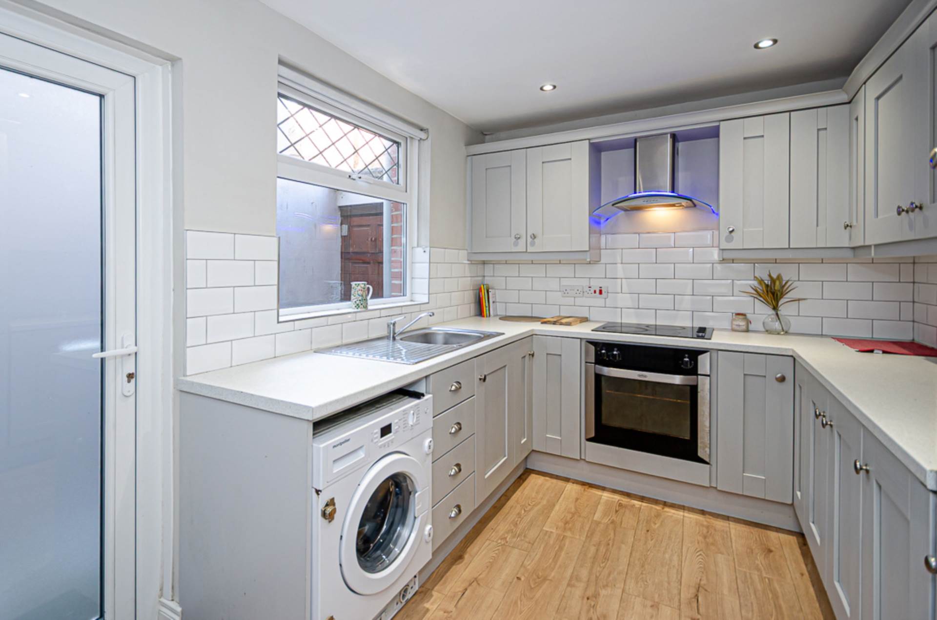 Range of high and low level fitted units, stainless steel oven, ceramic hob, stainless steel and glass extractor fan, part tiled walls, timber laminate floor, integrated fridge freezer, recessed spotlights and plumbed for washing machine