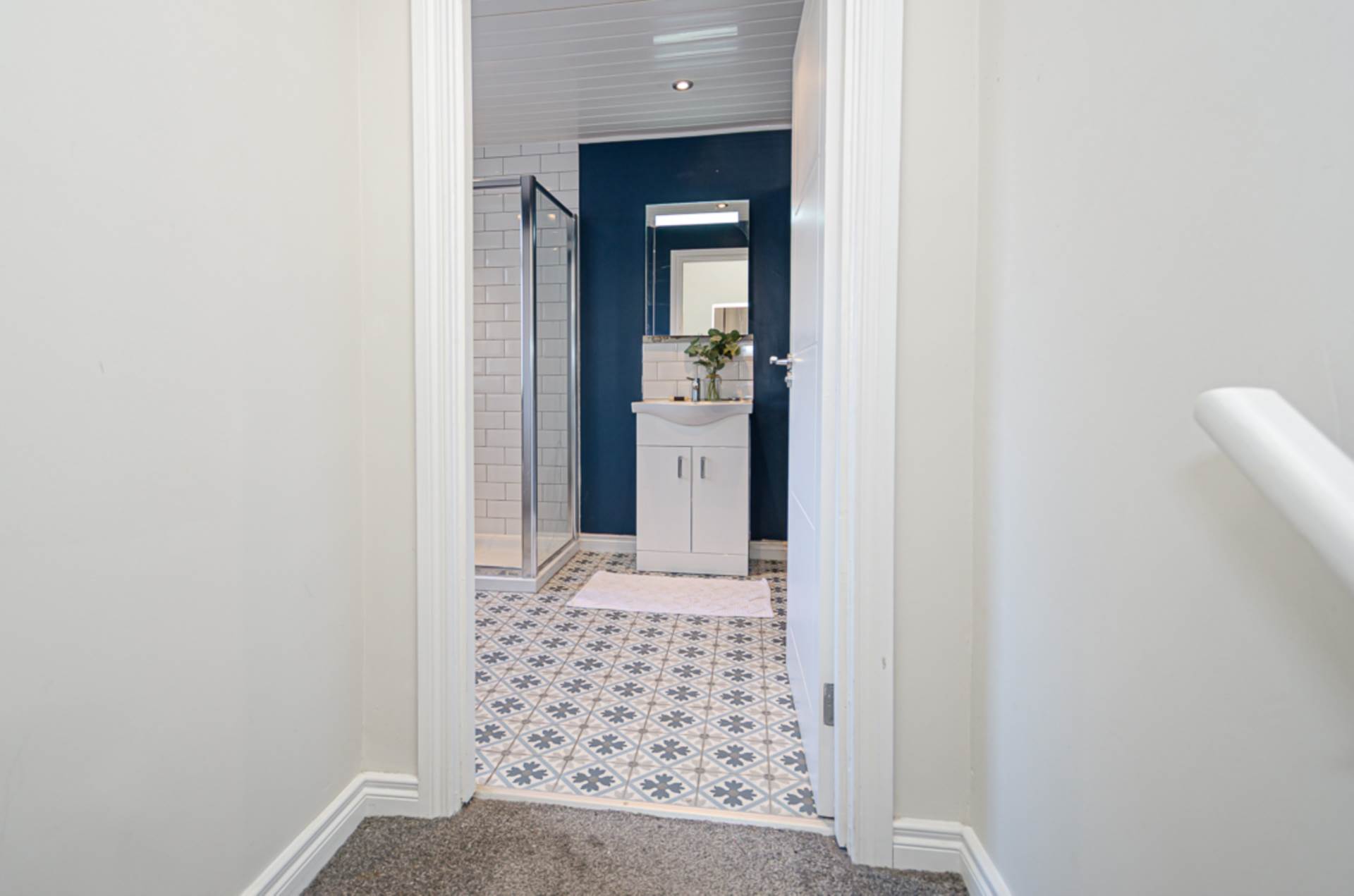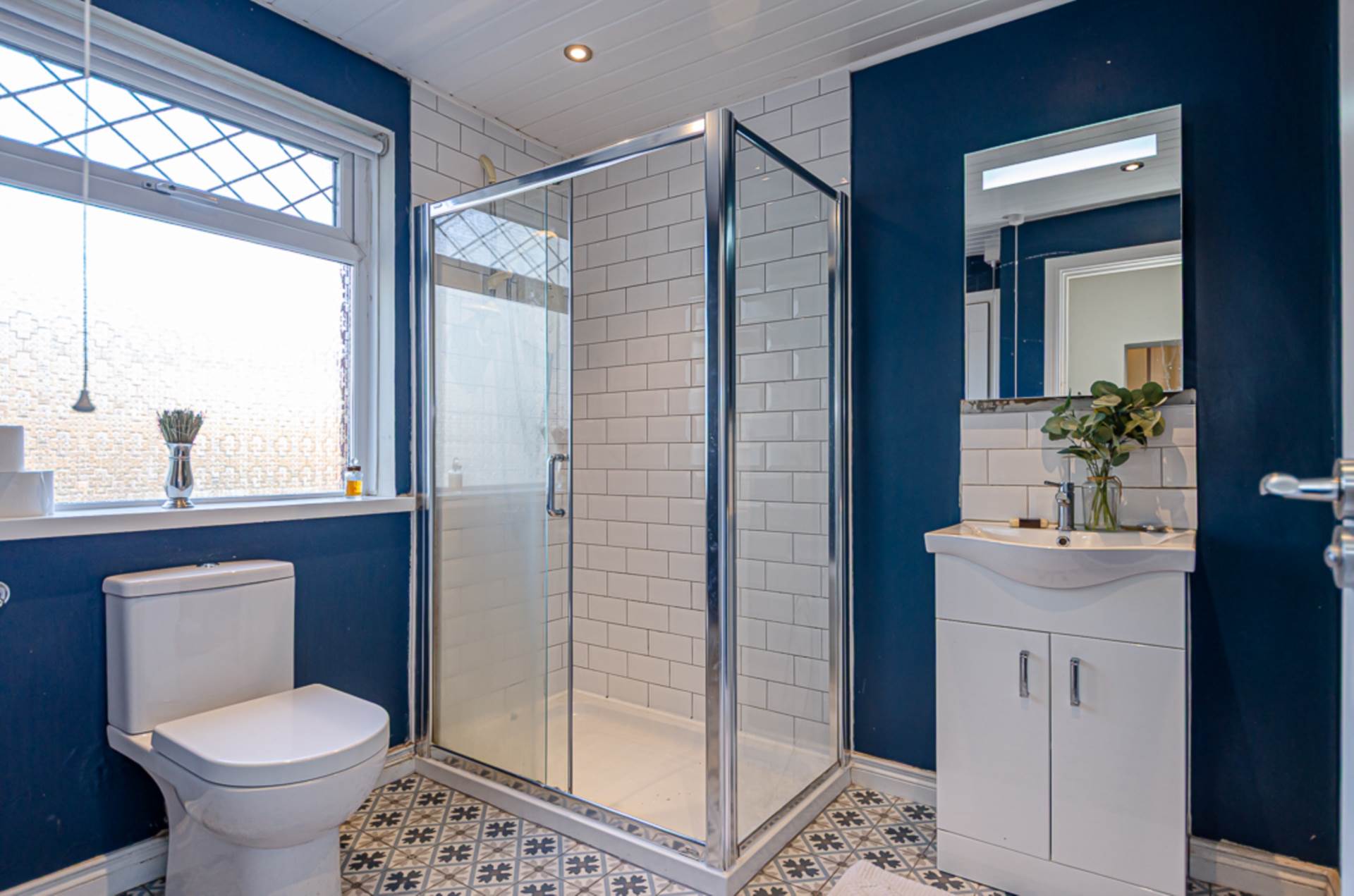 Large shower cubicle with electric shower and sliding door, wash hand basin in vanity unit, W.C., part tiled walls, decorative tiled floor, and PVC panelled ceiling with recessed spotlights