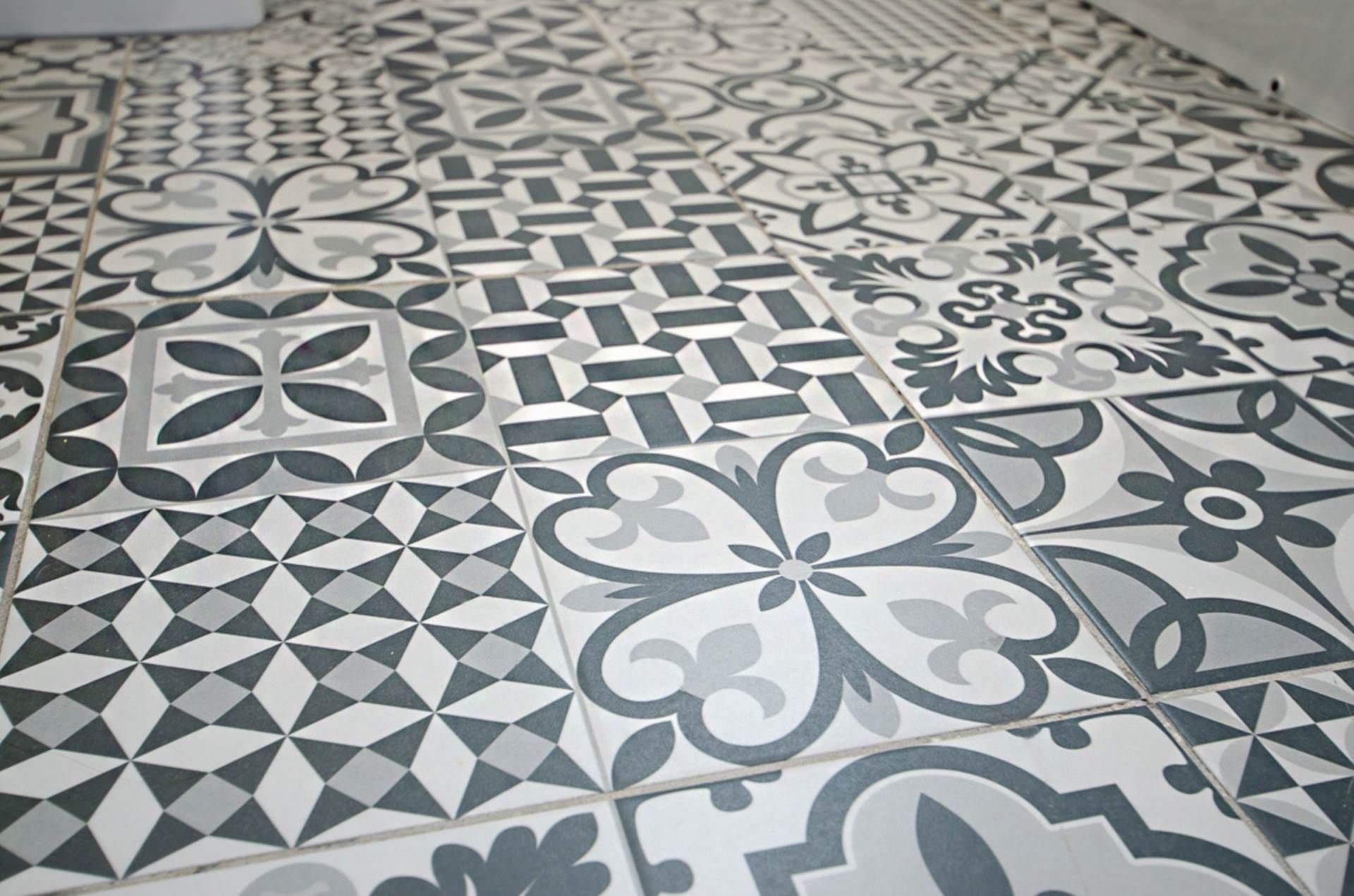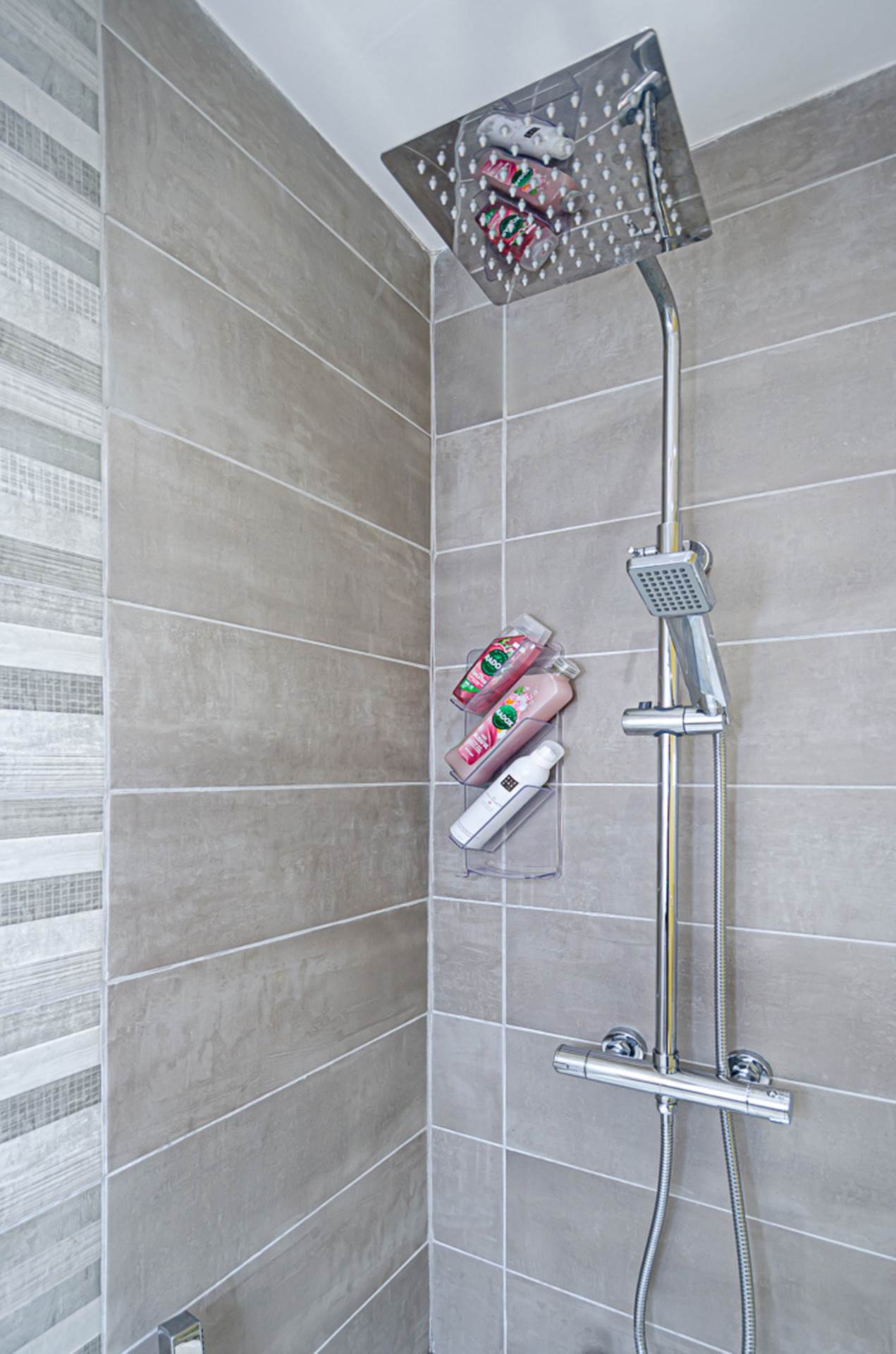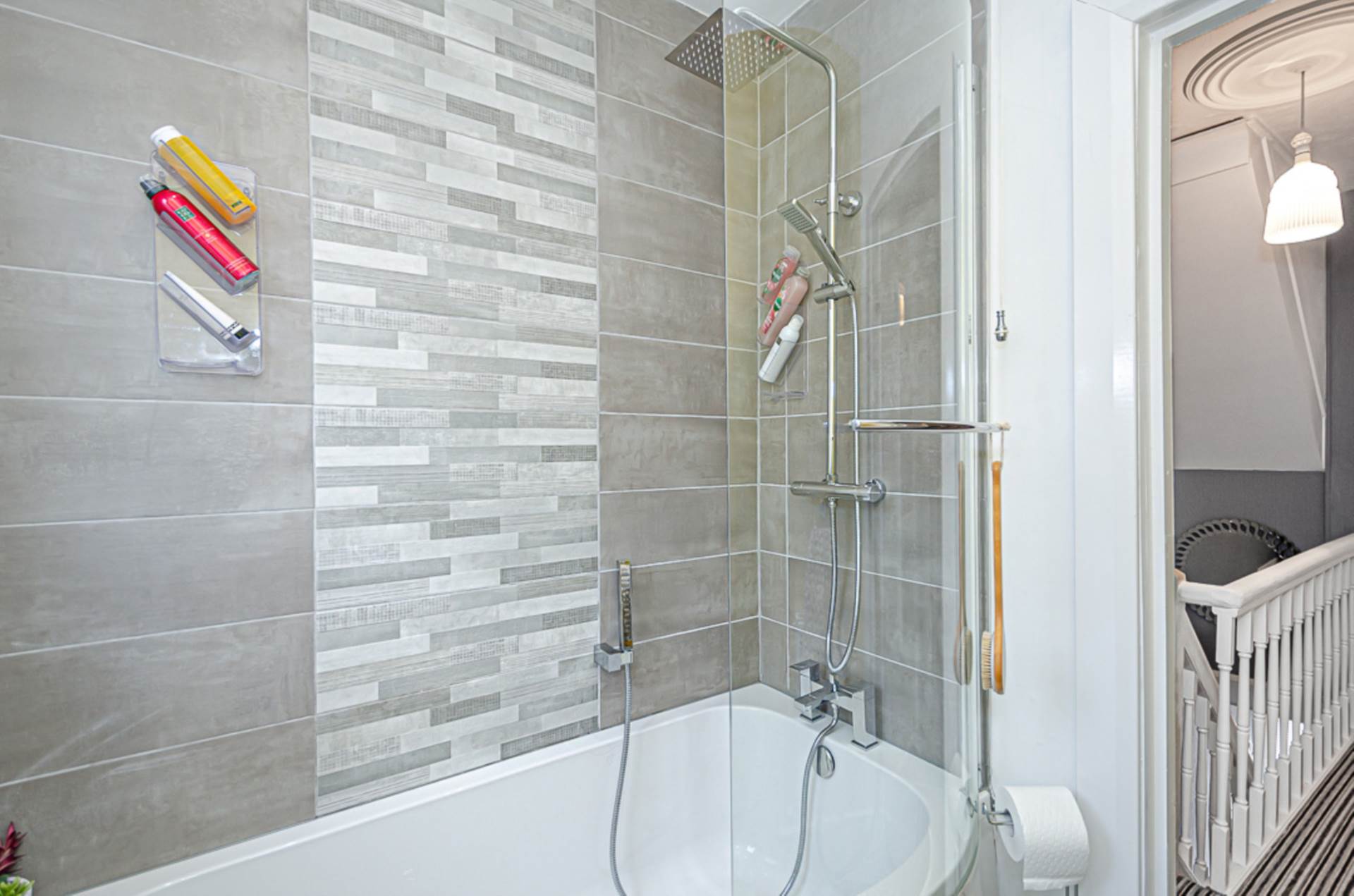 White suite with thermostatic shower (Dual shower heads) and screen over p-shaped bath, wash hand basin in vanity unit, WC, part tiled walls in contemporary tiling, decorative ceramic tiled floor, tiled skirting, recessed spotlights and extractor fan