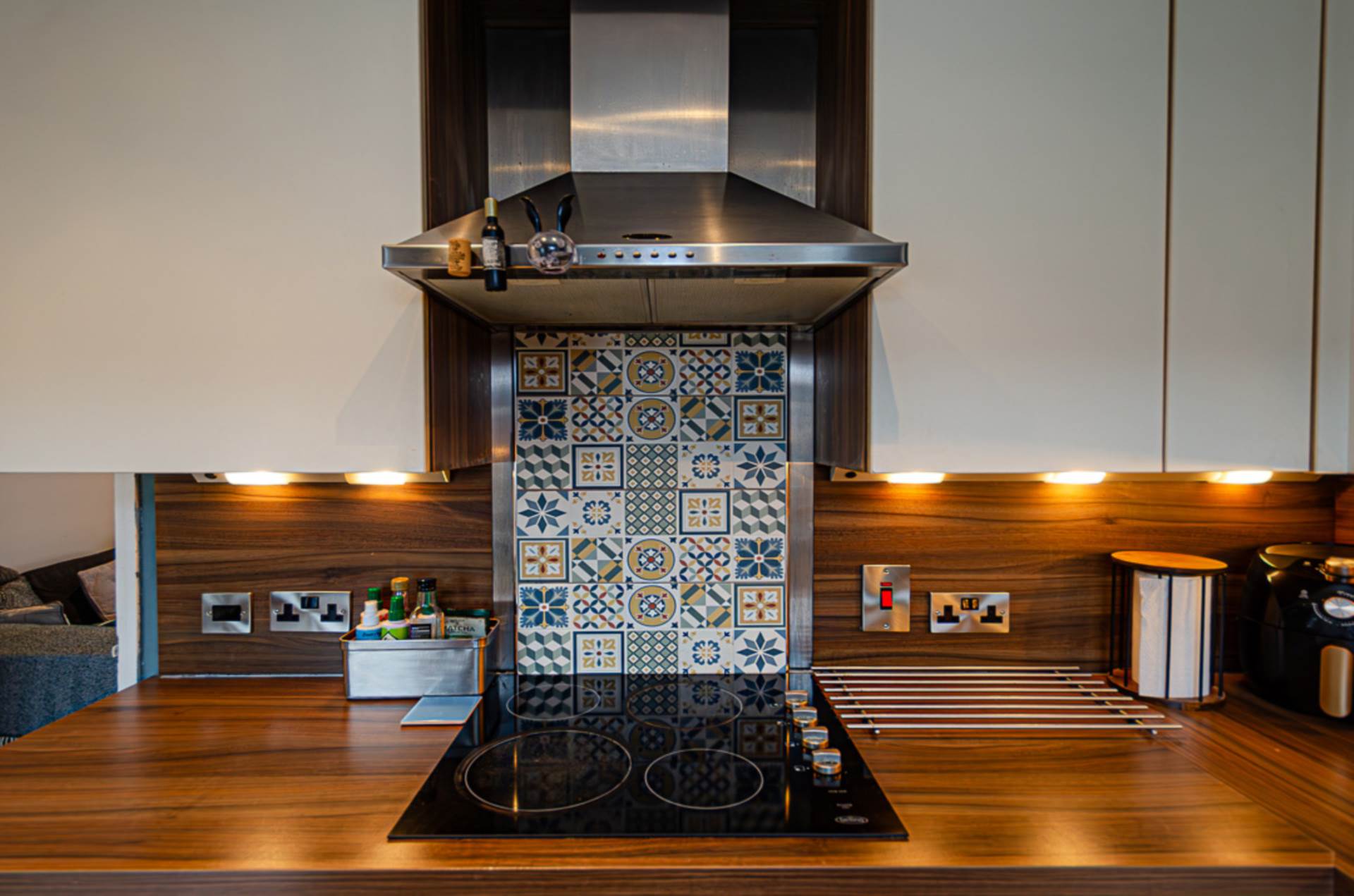 Modern range of fitted high and low level units, built in oven and hob, stainless steel extractor, tiled splashback, stainless steel sink, downlighting, breakfast bar, grey vertical radiator, plumbed for washing machine, plumbed for dishwasher, and decorative ceramic tiled floor