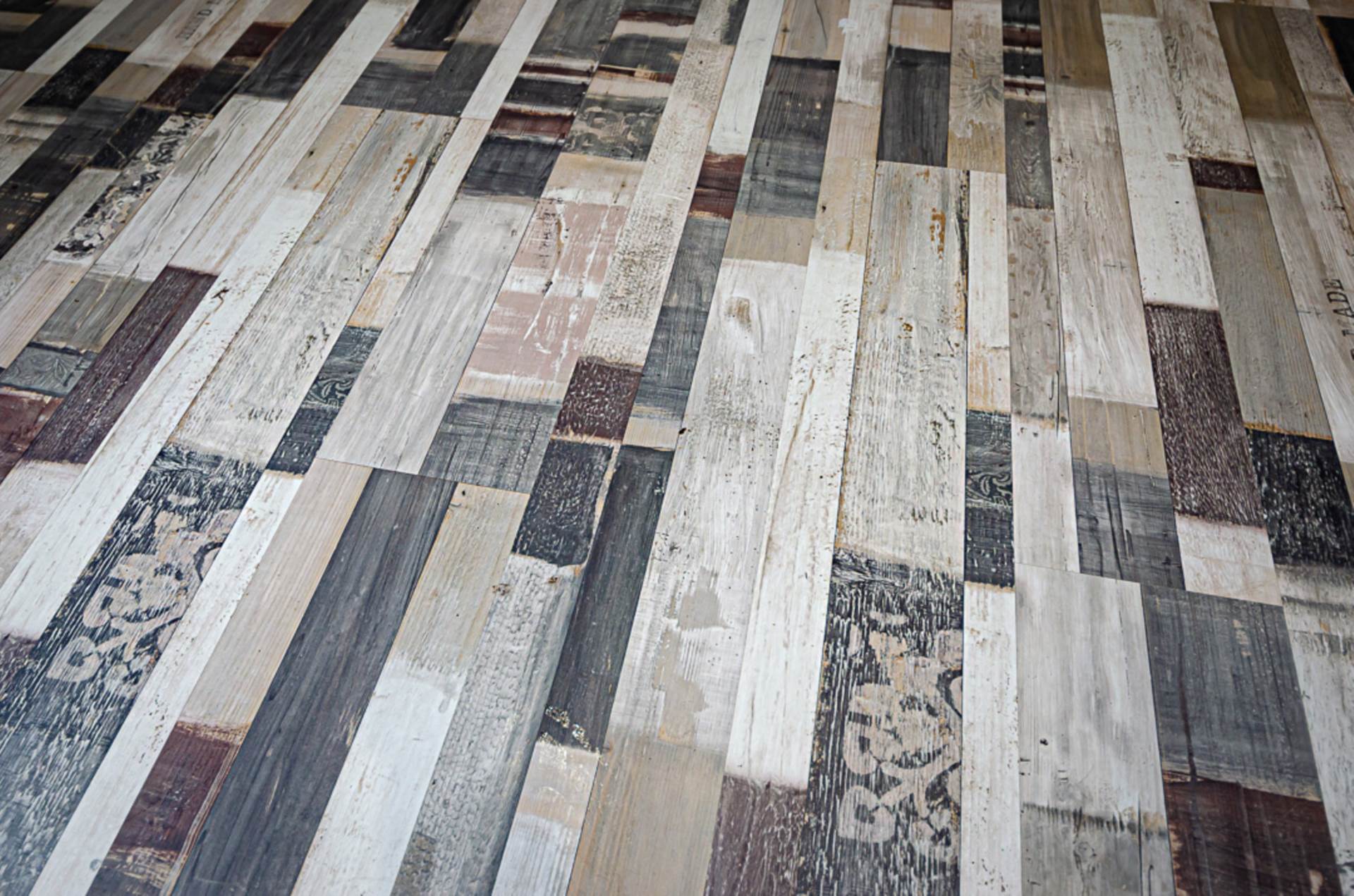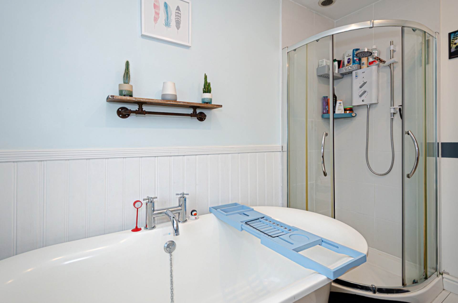 White suite with free standing bath, countertop wash hand basin on vanity unit, W.C., shower cubicle with electric shower and sliding doors, part timber panelled walls and ceramic tiled floor