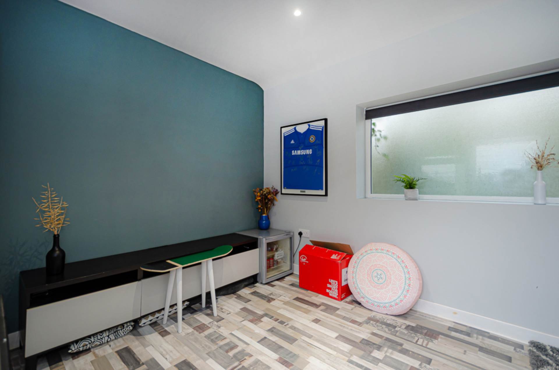 Up and over door, light and power with electric heater. Currently used as a cinema room/ gym