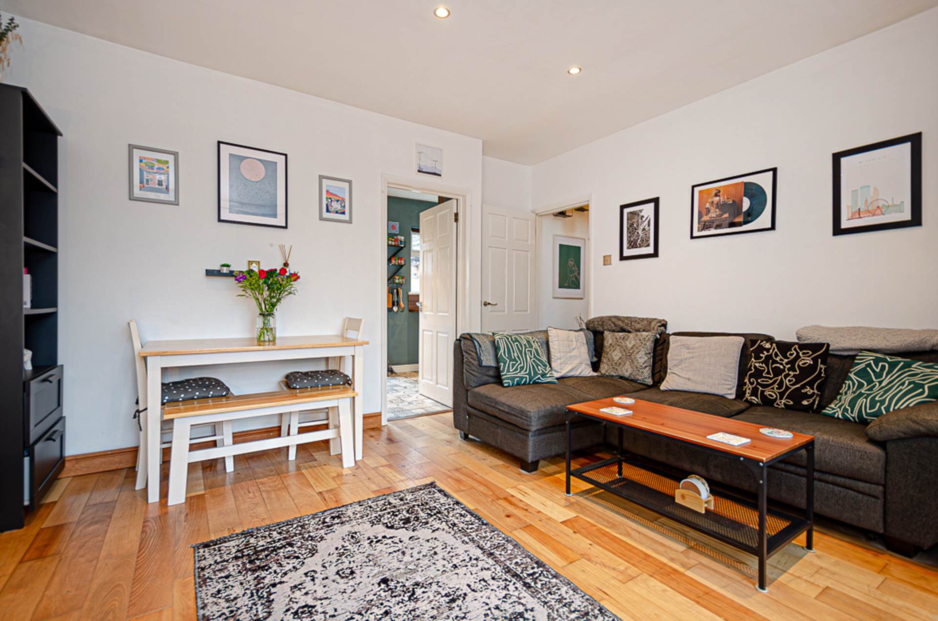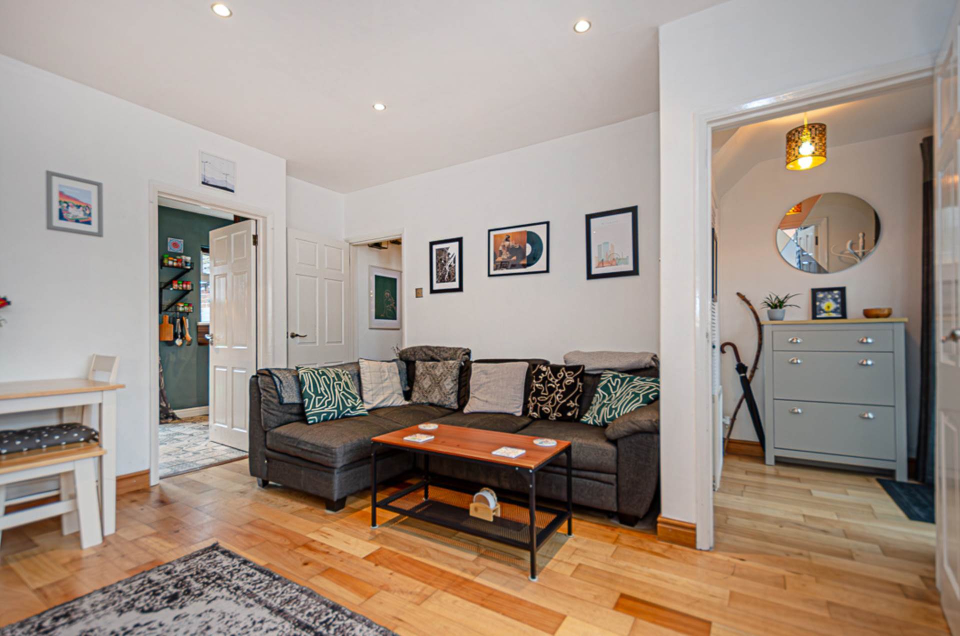 The living room has beautiful hardwood floors and lots of natural light pouring in. The luxury kitchen has decorative tiling, a statement vertical radiator, and storage to spare. The sleek countertops will make it a joy to cook in. Two good-sized bedrooms, a modern bathroom with free standing bath and separate shower cubicle, and very useful floored roofspace complete the interior.