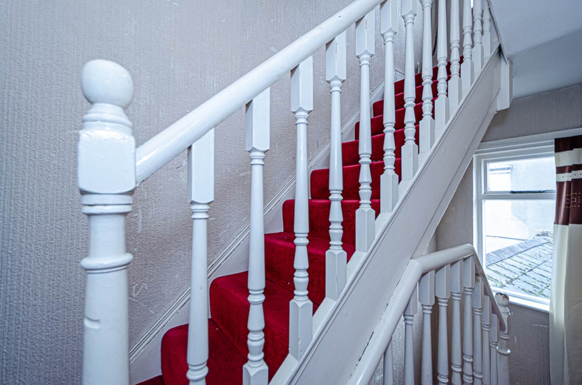 Bay window, feature cast iron fireplace, cornice and storage under stairs