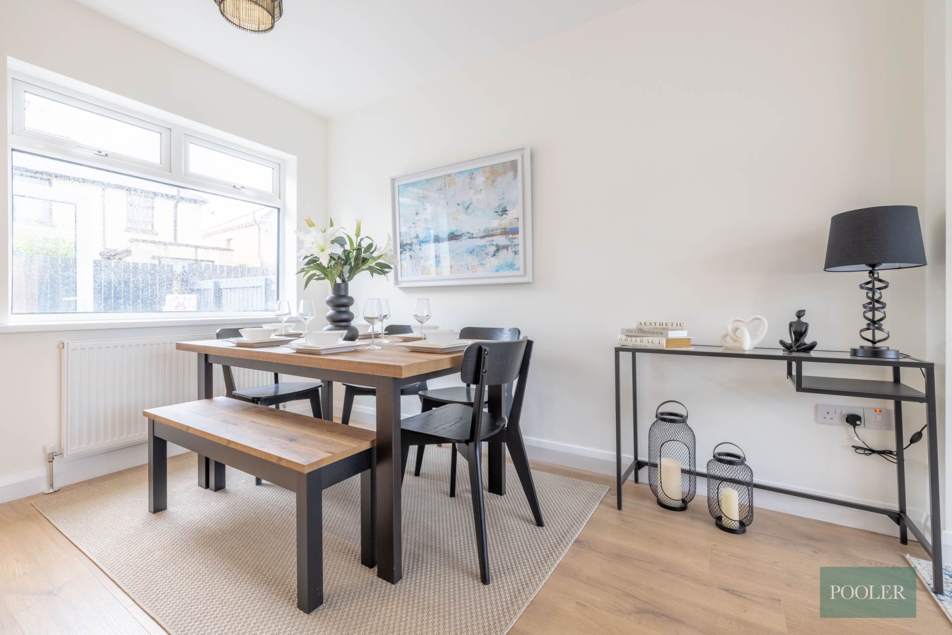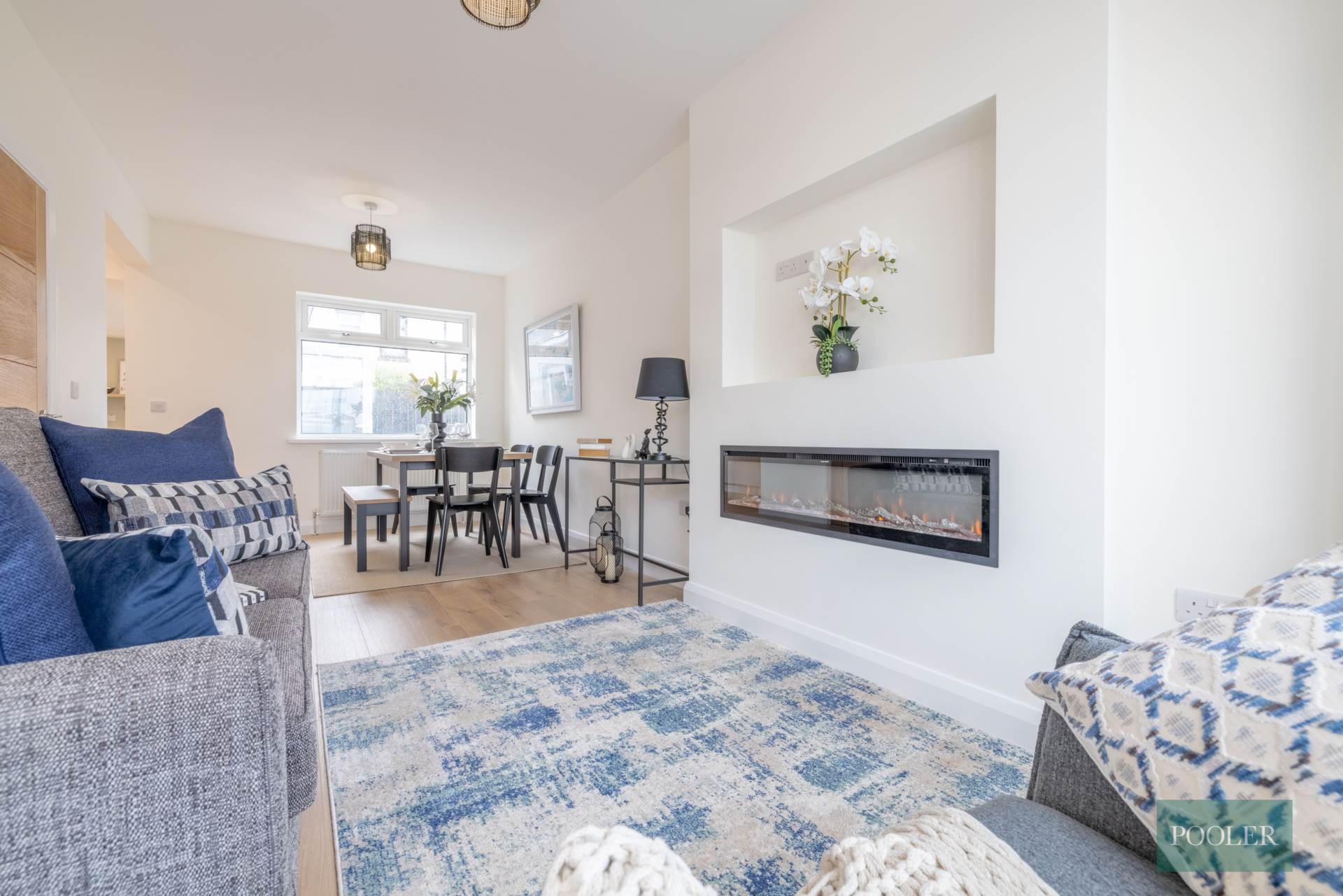 Bay window, modern built-in electric fire, recess for TV, timber laminate floor, and open to..