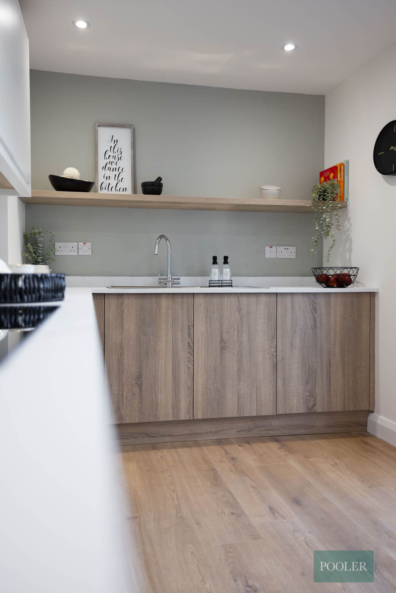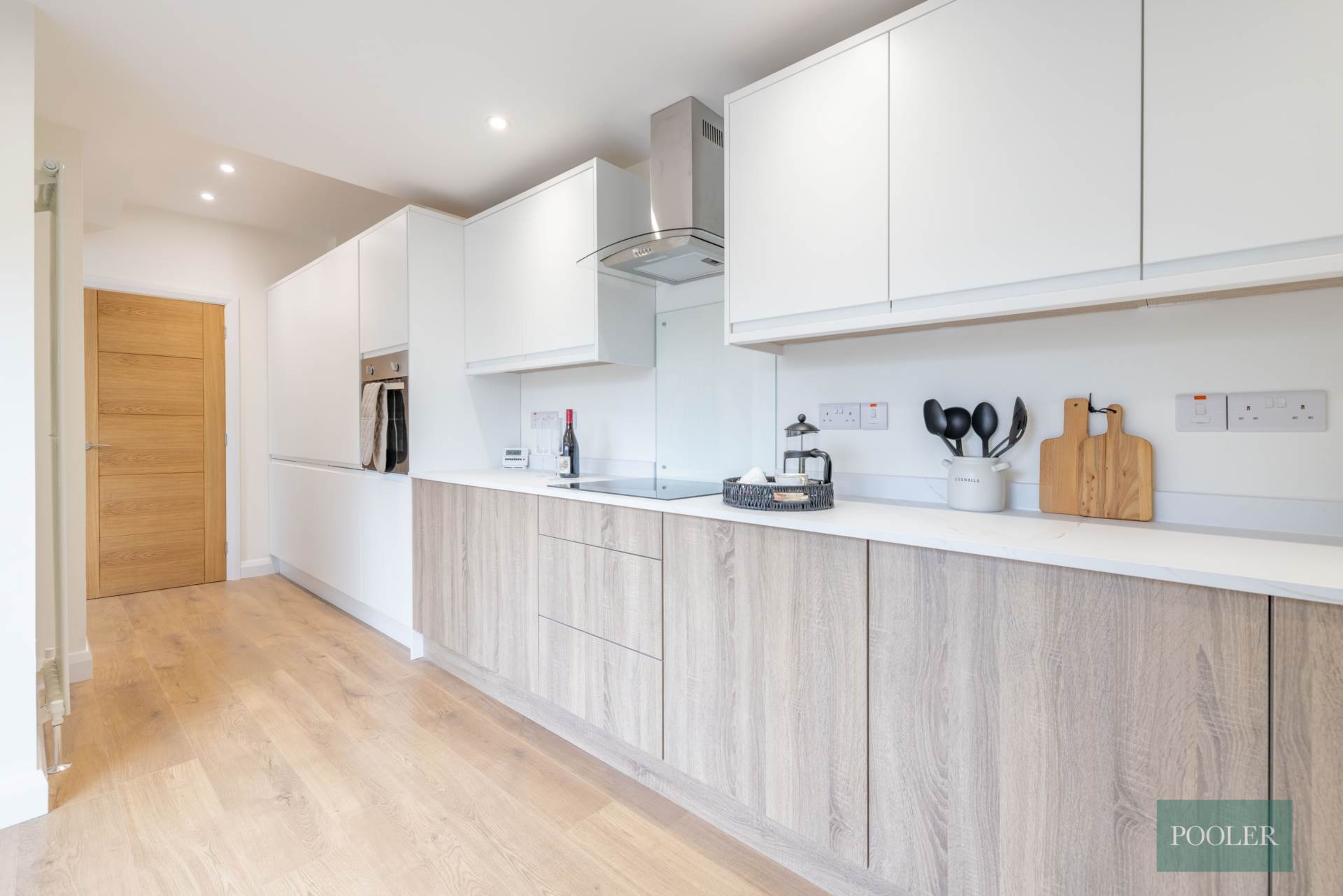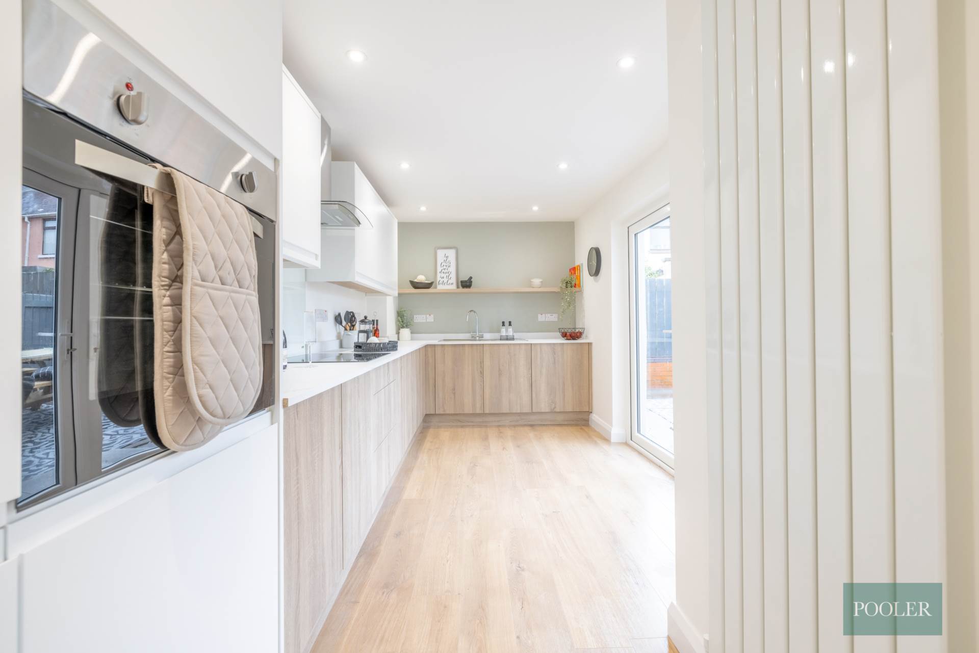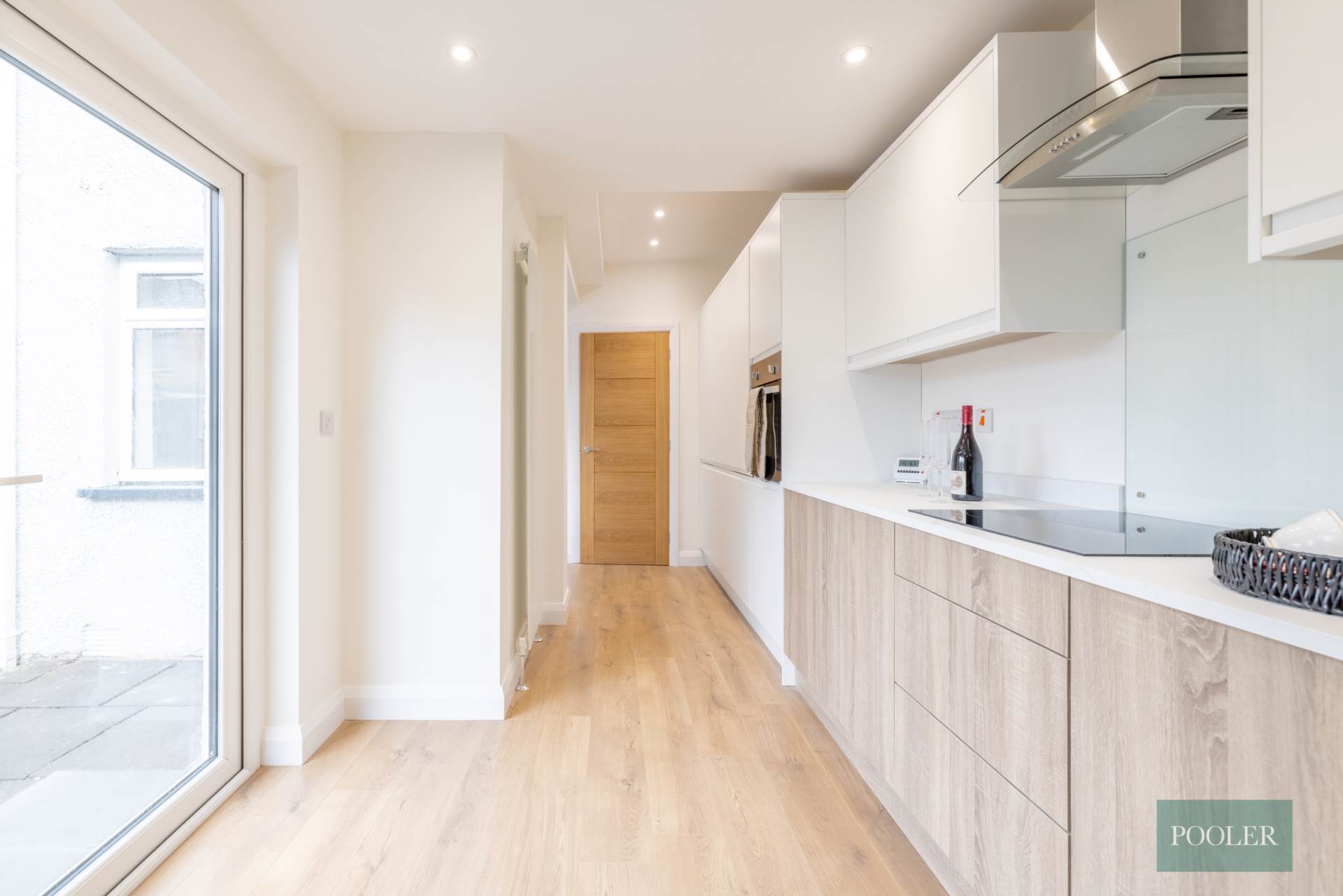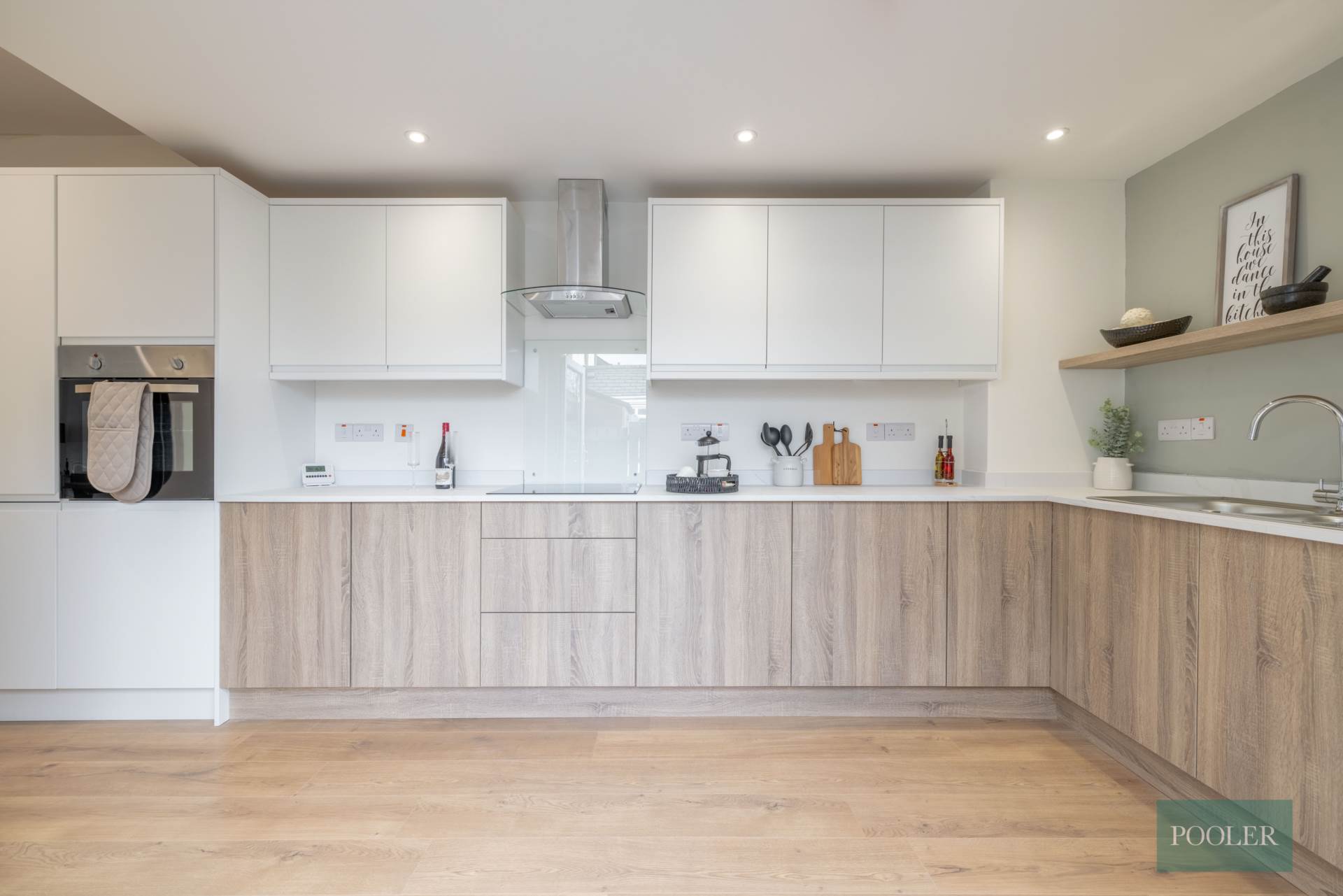 Newly fitted range of units in white and timber finish, integrated stainless steel oven, ceramic hob, glass splash back, stainless steel and glass extractor canopy, integrated fridge freezer, integrated dish washer, stainless steel bowl and a half sink, recessed spotlights, timber laminate floor, and French doors to garden