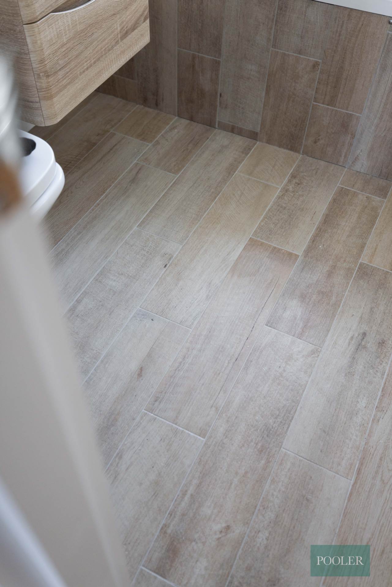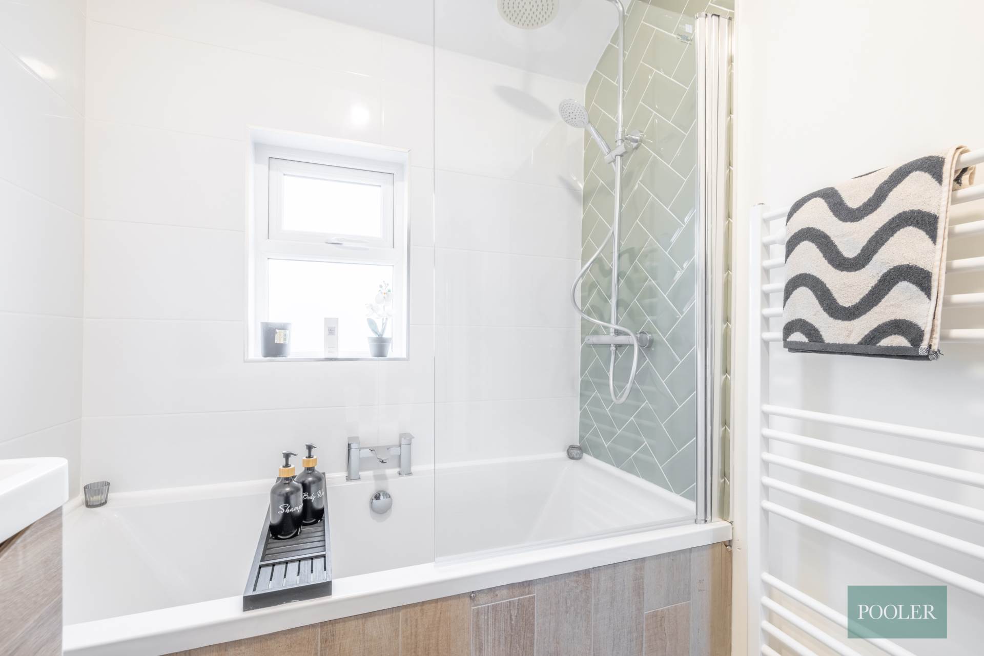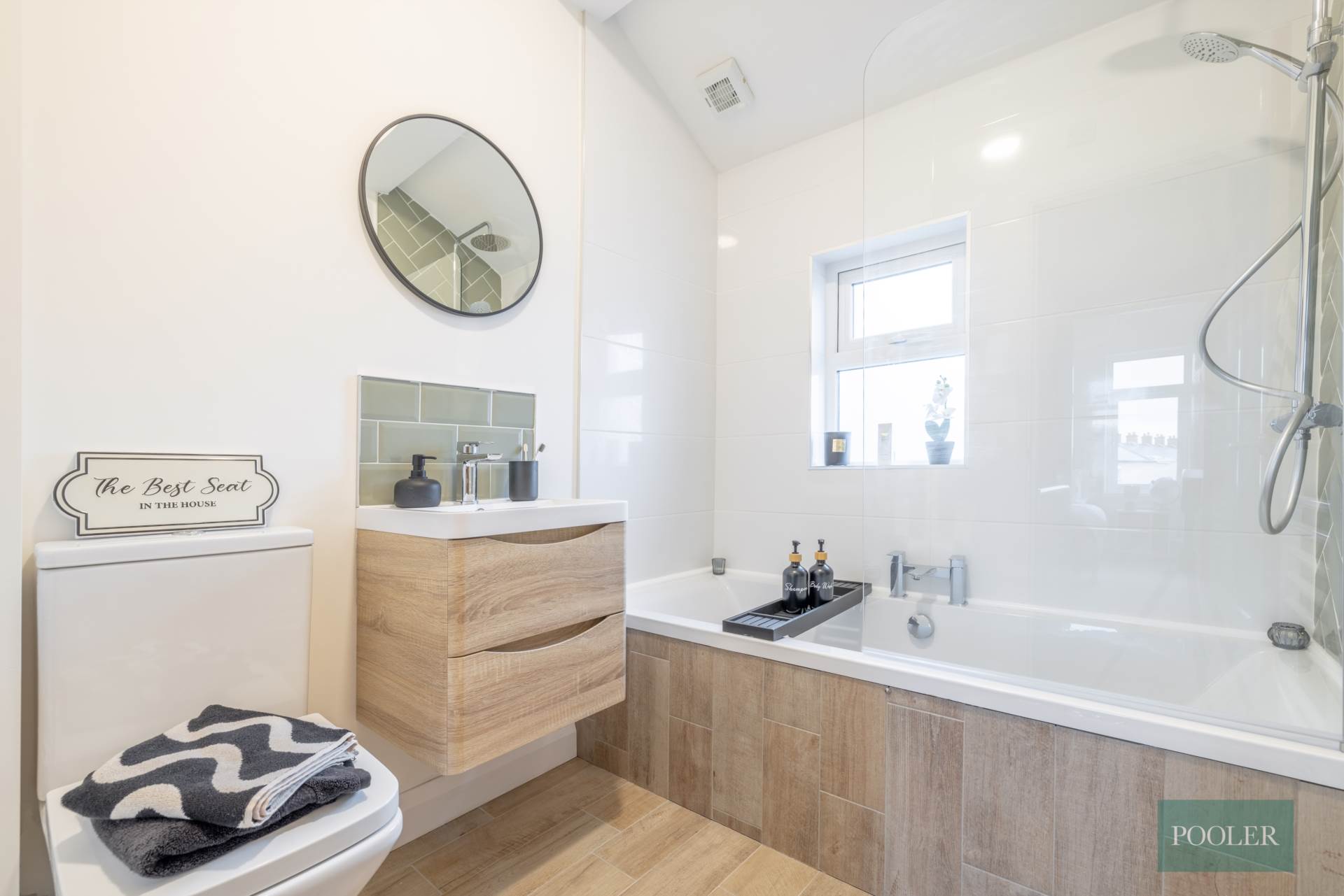 Newly fitted bathroom - white suite with thermostatic shower and screen over bath, herringbone tiling to bath, wash hand basin in timber two drawer vanity unit with tiled splash back, W.C., wood effect ceramic tiled floor and tiled bath panel, white towel rail radiator, and extractor fan