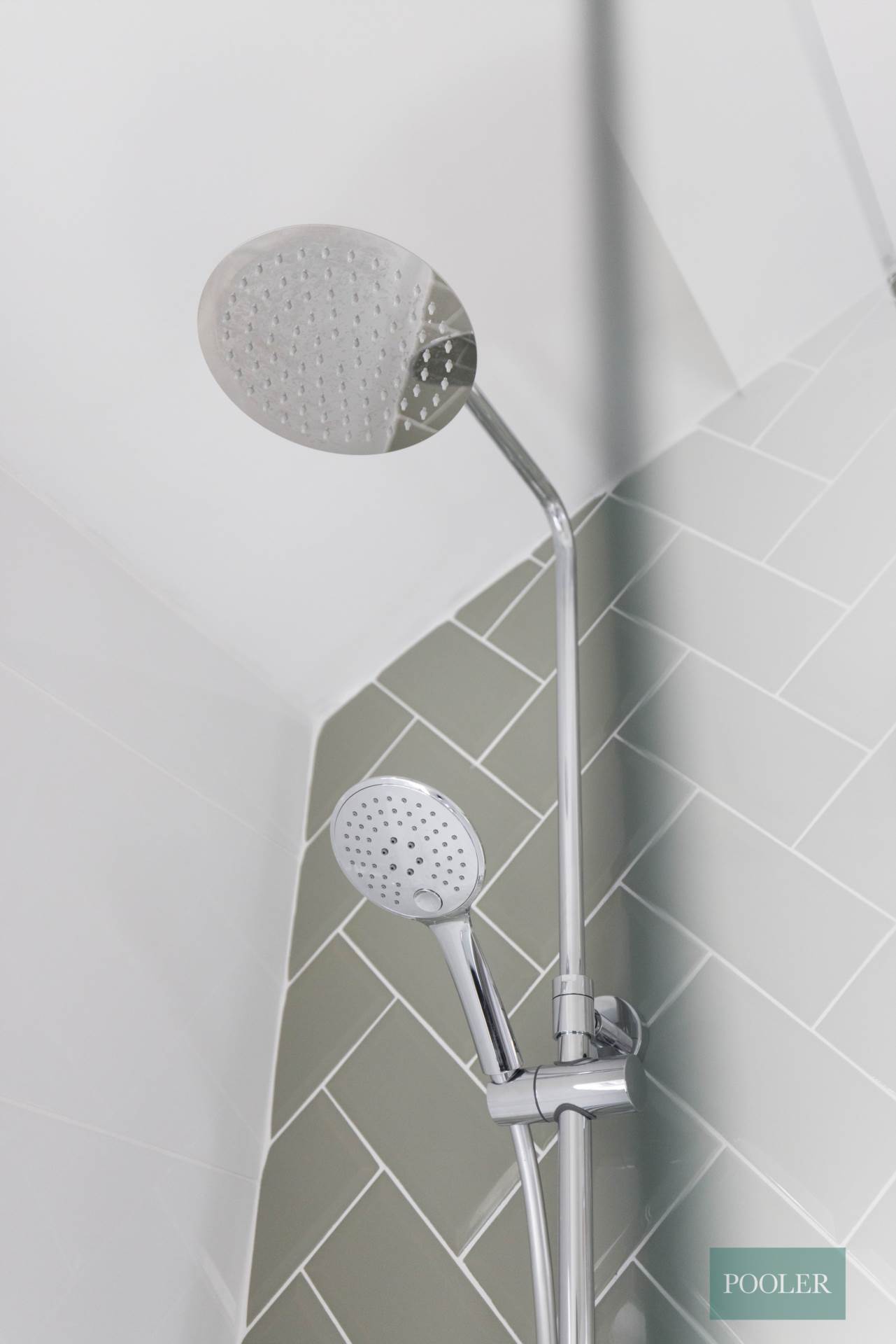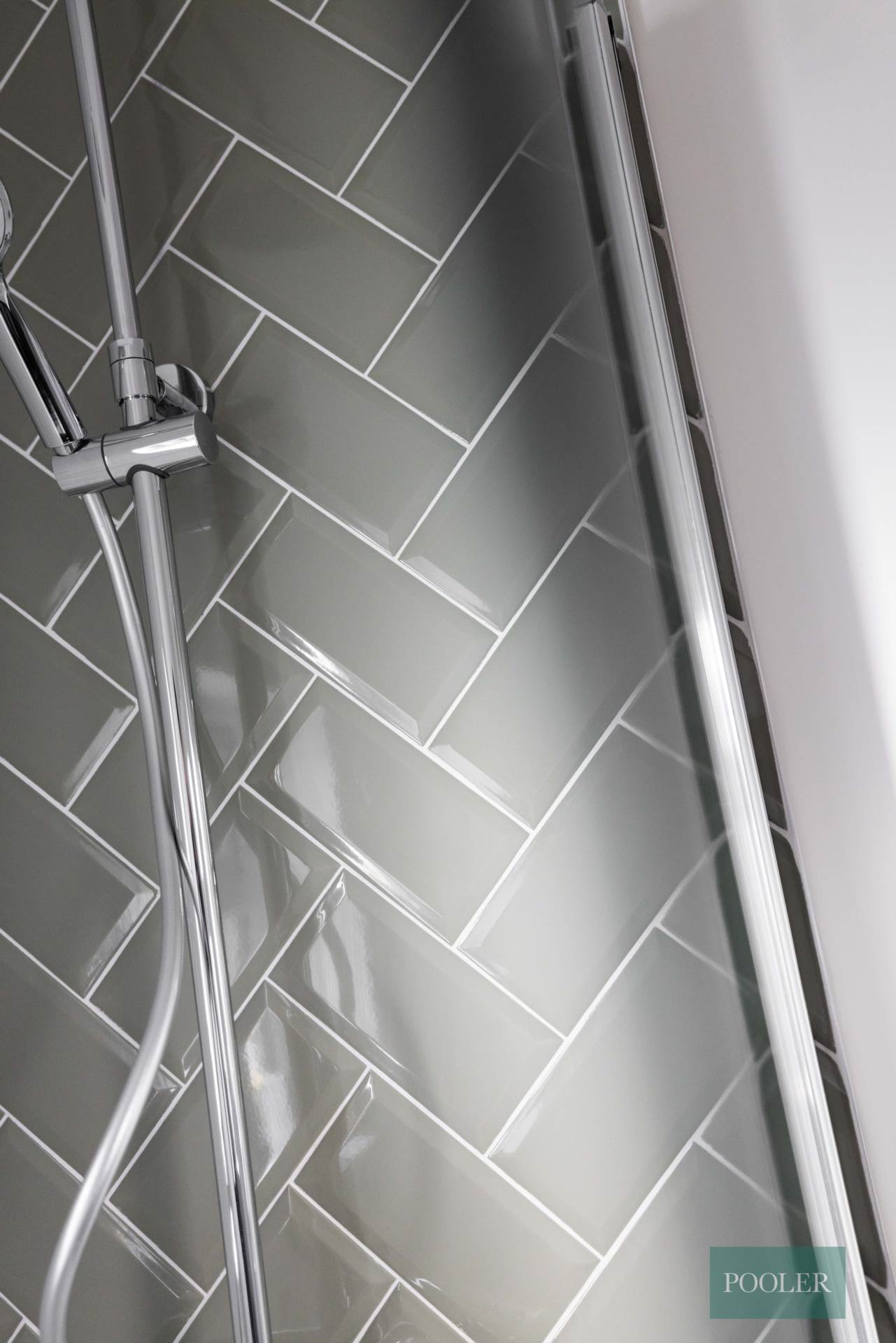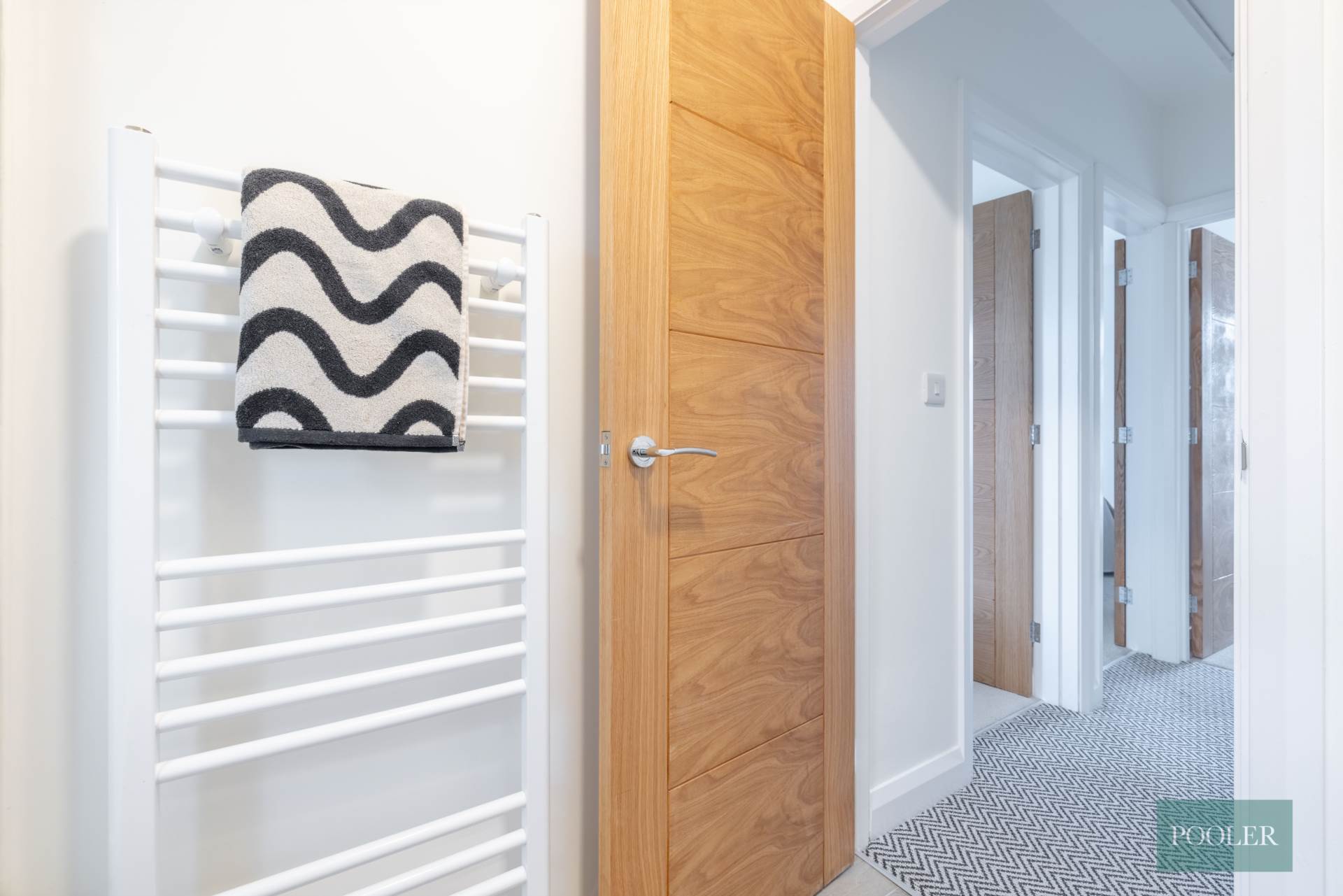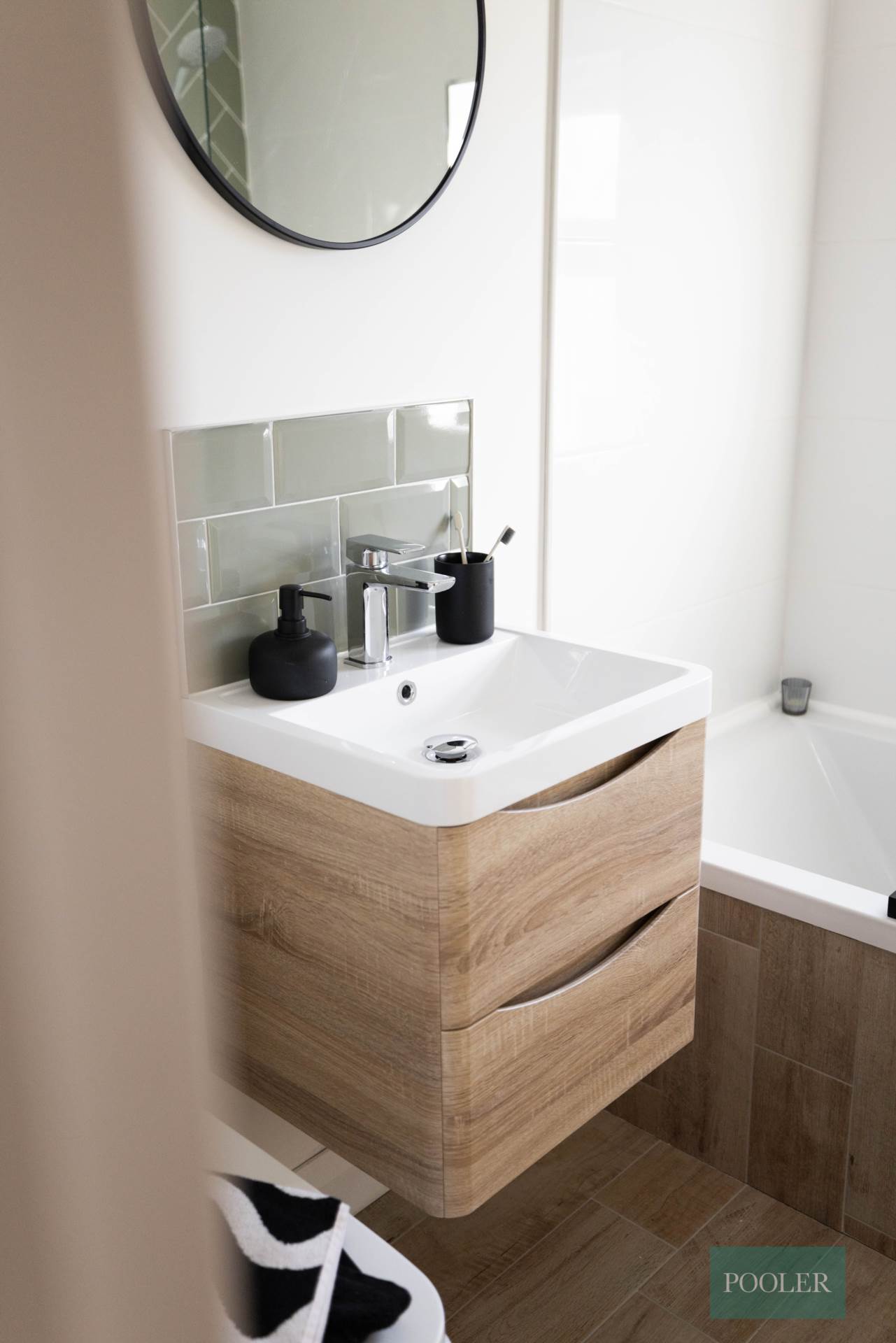 Newly fitted bathroom - white suite with thermostatic shower and screen over bath, herringbone tiling to bath, wash hand basin in timber two drawer vanity unit with tiled splash back, W.C., wood effect ceramic tiled floor and tiled bath panel, white towel rail radiator, and extractor fan