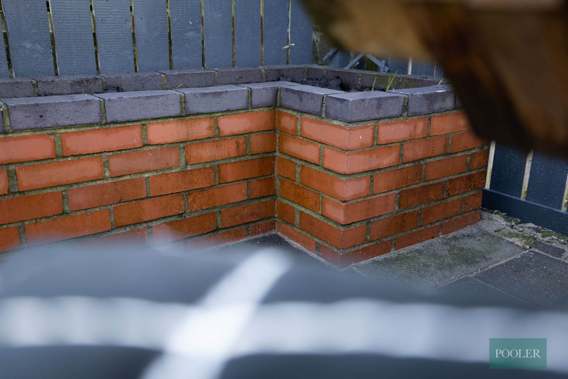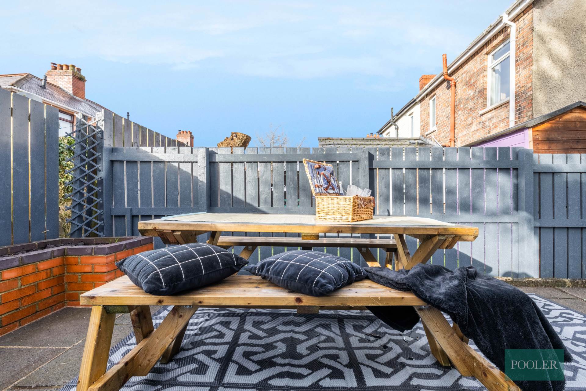 Forecourt and side path in slate chipping and stepping stones. Rear garden in paving, brick flower bed and gas boiler in housing. Garden shed