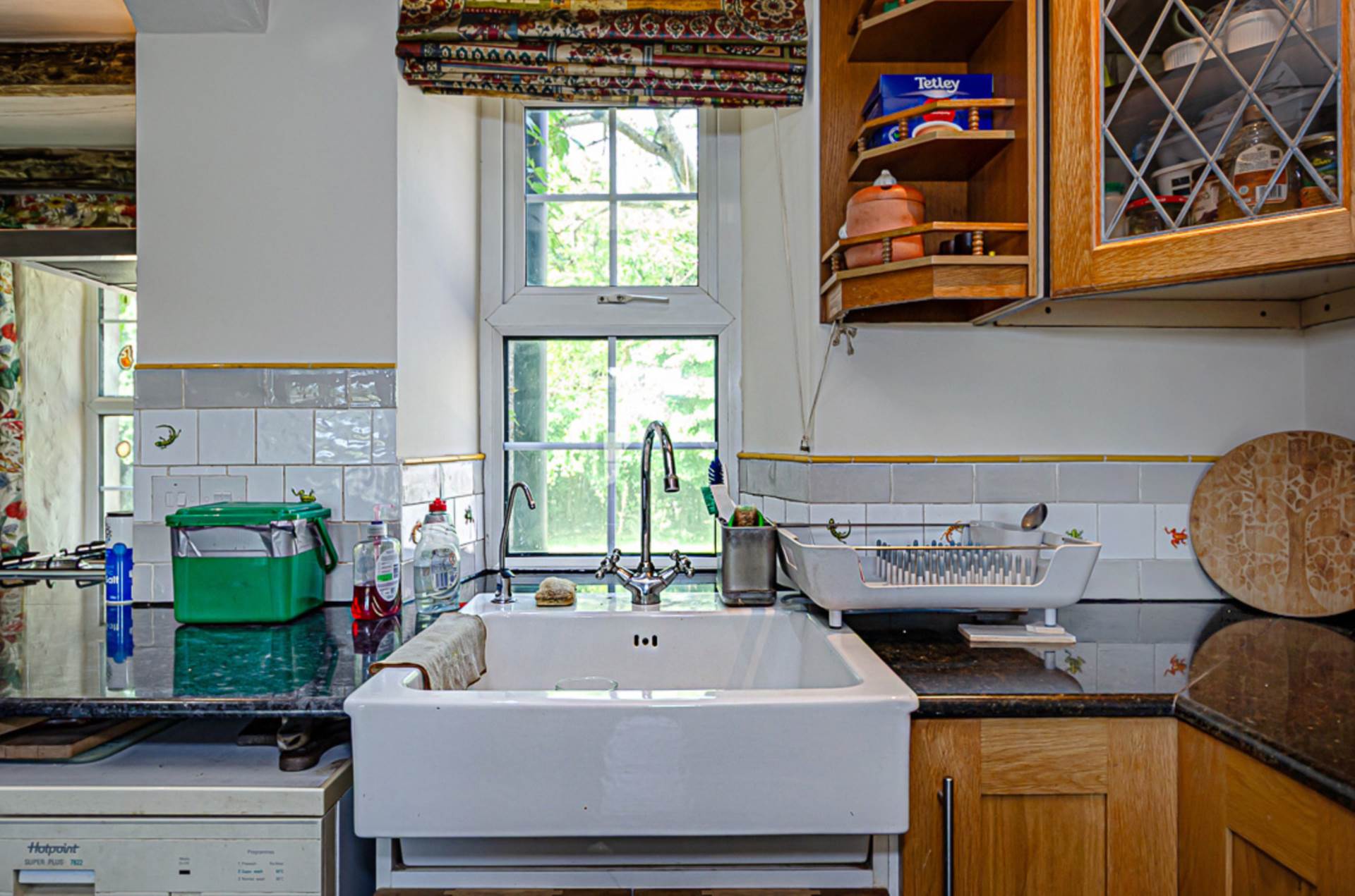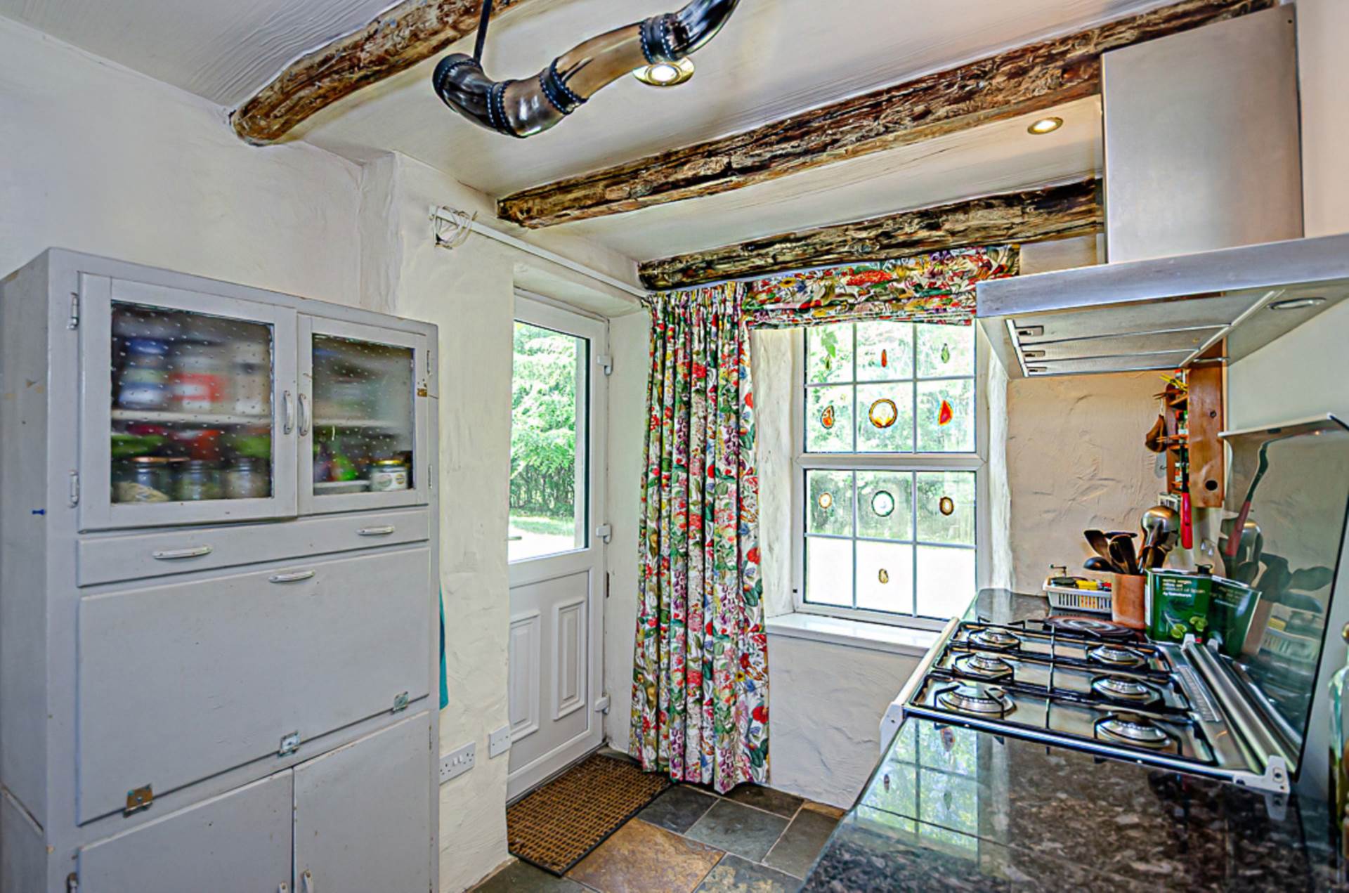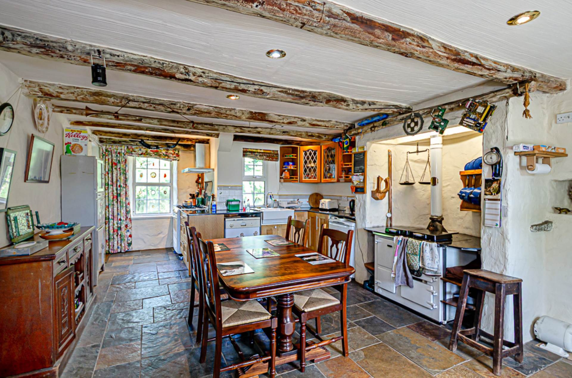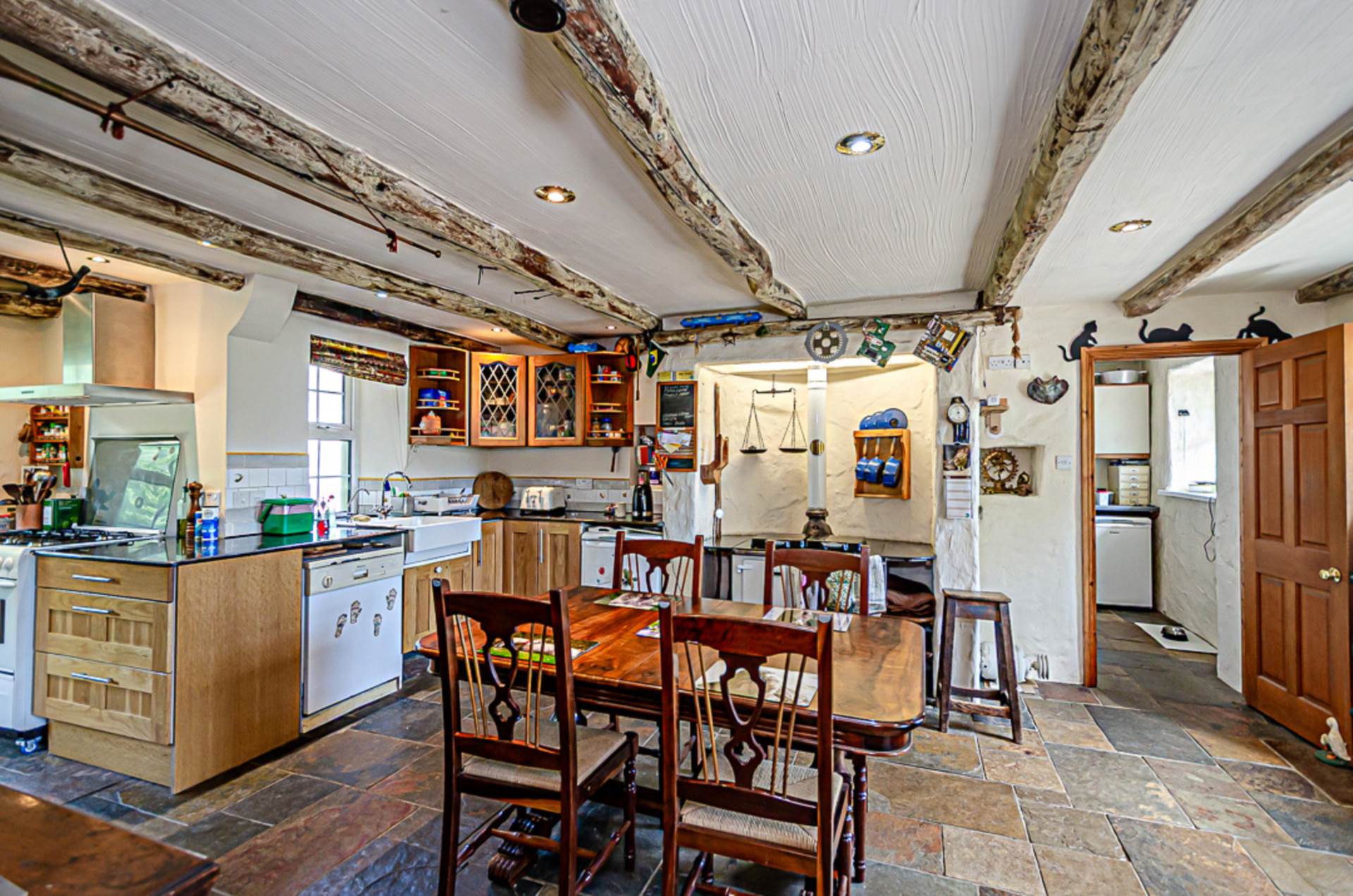 Family kitchen - 23'9" (7.24m) Max x 14'3" (4.34m)Range of high and low level Oak units with Indian granite worktops and glazed display cupboards. Oil fired ESSE range with double oven, 2 hot plates and bespoke surrounding granite worktop with shelving below. Additional space for a gas and electric range cooker with stainless steel extractor fan above. Belfast-type sink and plumbing for dishwasher. Exposed original cottage walls and original beams, Chinese slate floor, part tiled walls and recessed spotlights. Space for table and chairs and large desk. U.P.V.C. back door to paving at rear