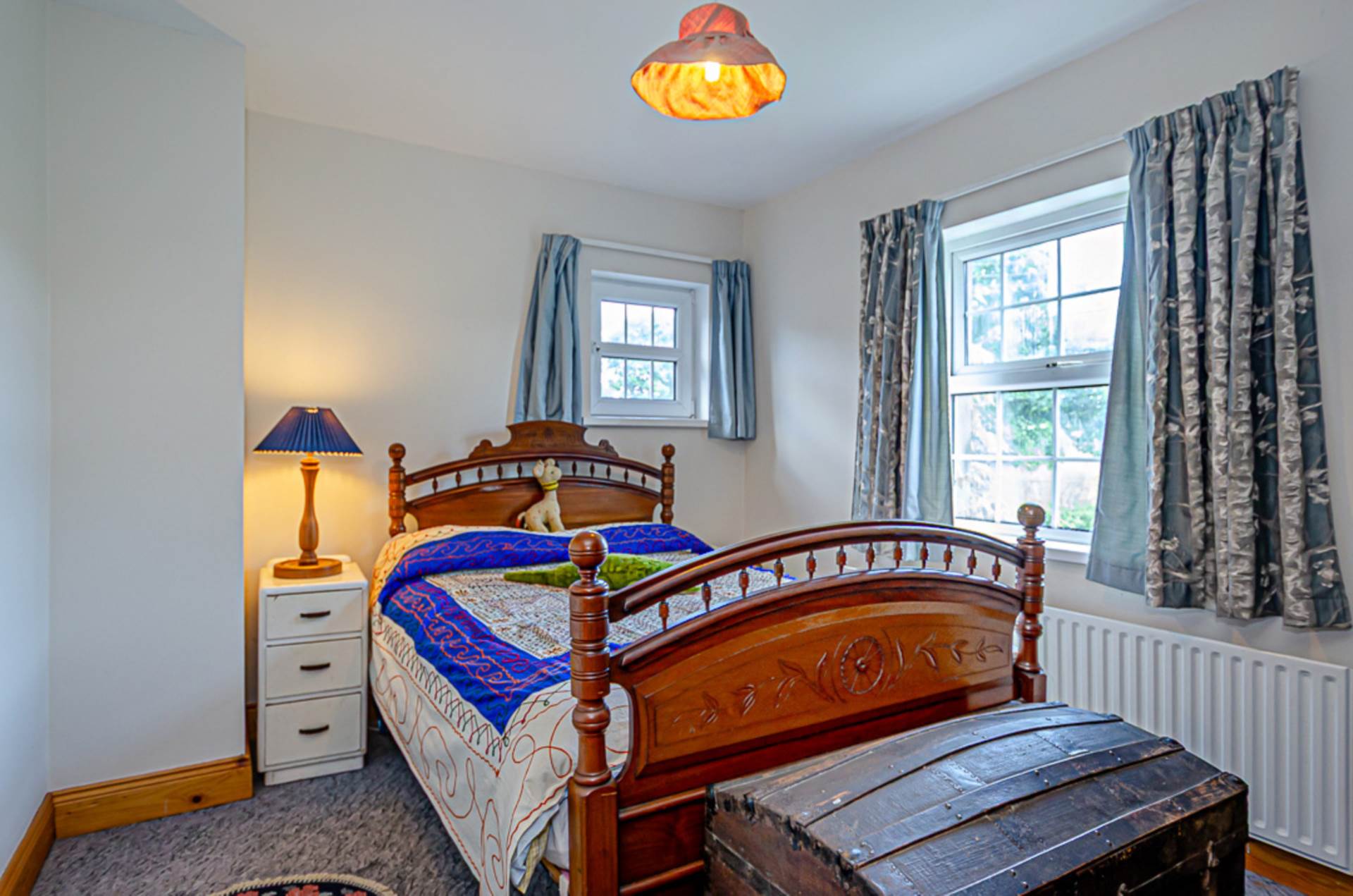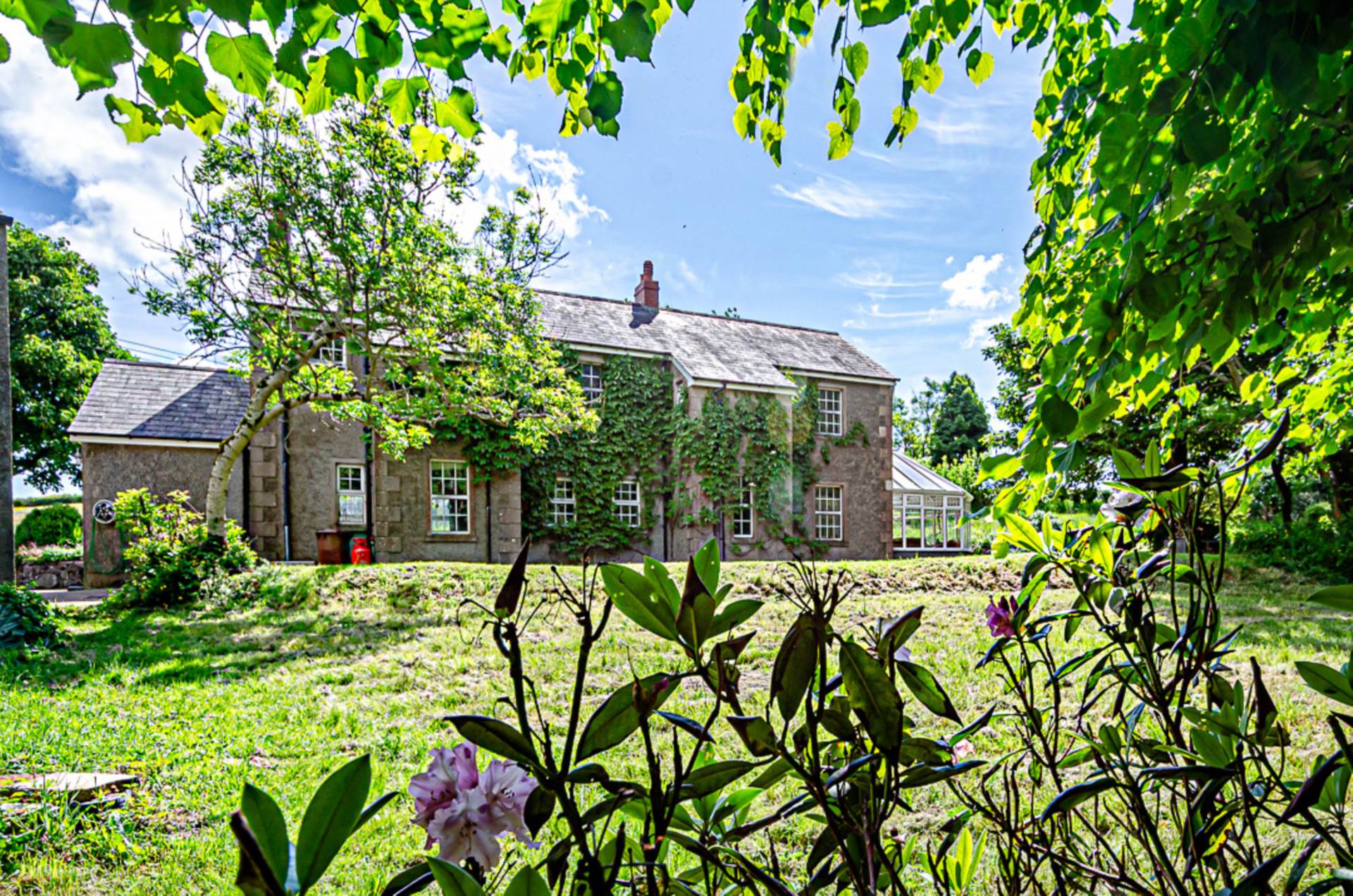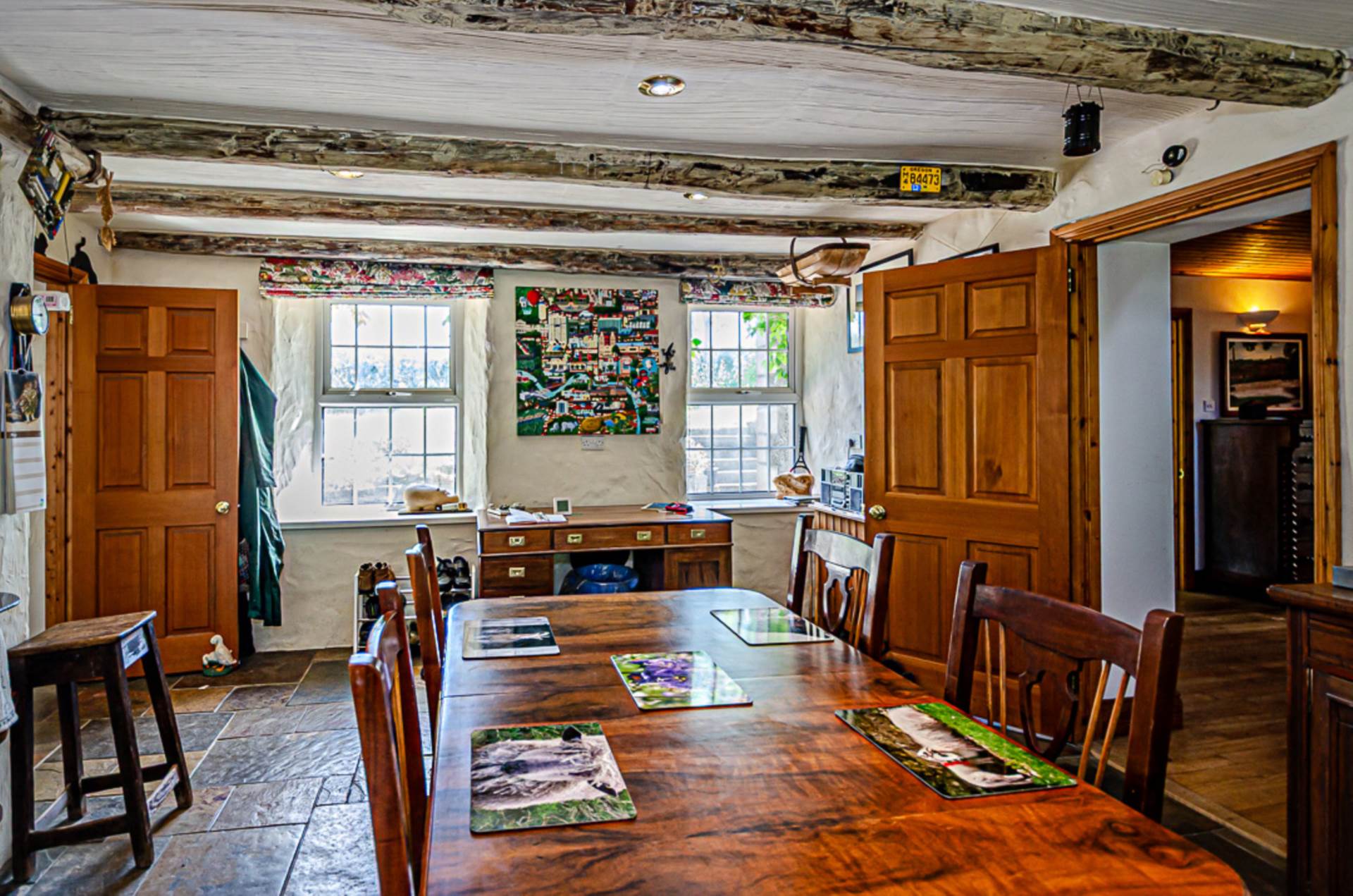 The current family home has been lovingly renovated and extended, featuring original walls and beams and deep recessed windows. The extension has been built to match the original thick walls and deep window reveals and includes a replica fanlight above the front door. Even a curved corner outside the utility room has been retained. This was to facilitate the passage of a horse and cart as it travelled up the long entrance lane, through the yard and around the house to a basalt quarry that was located at the edge of the, now forested, land.