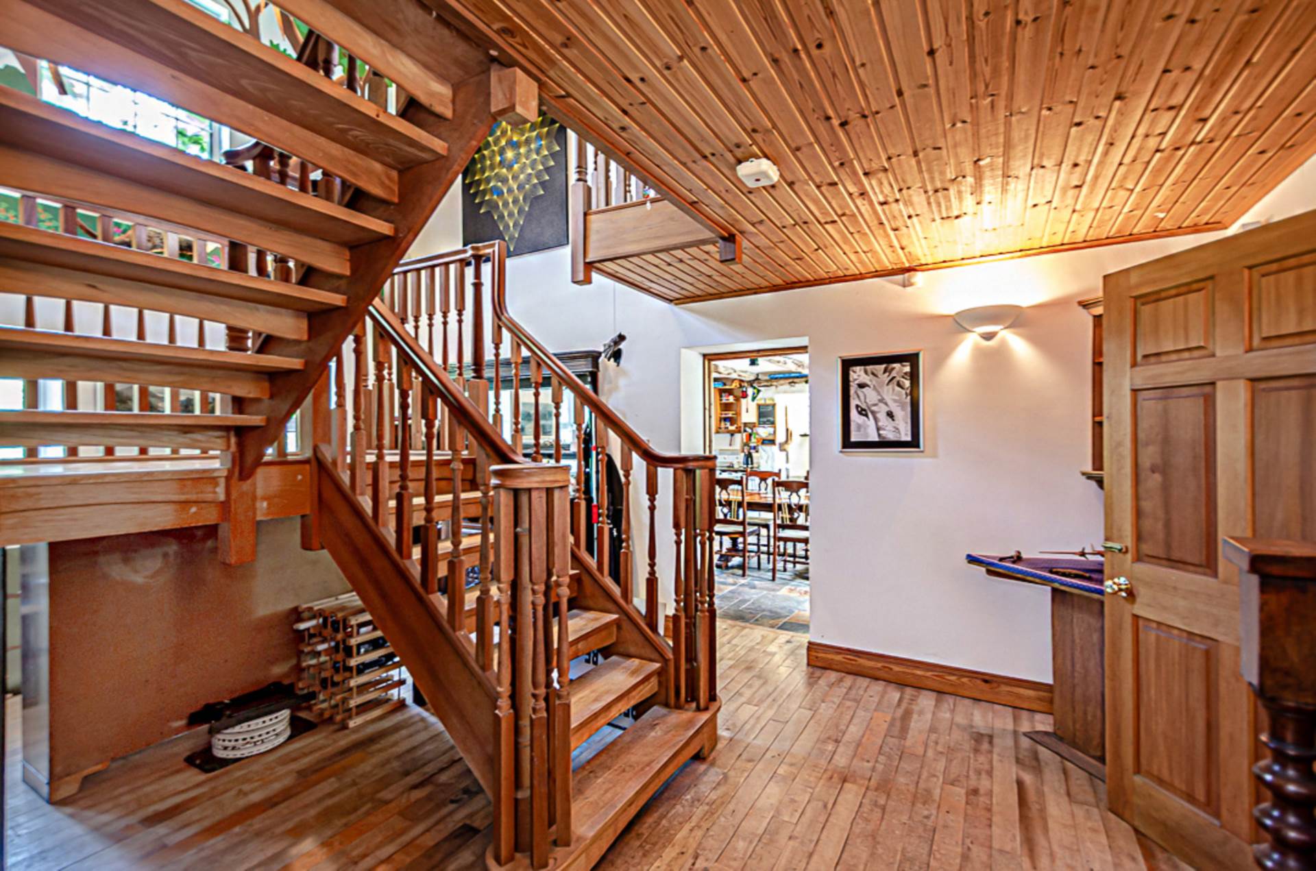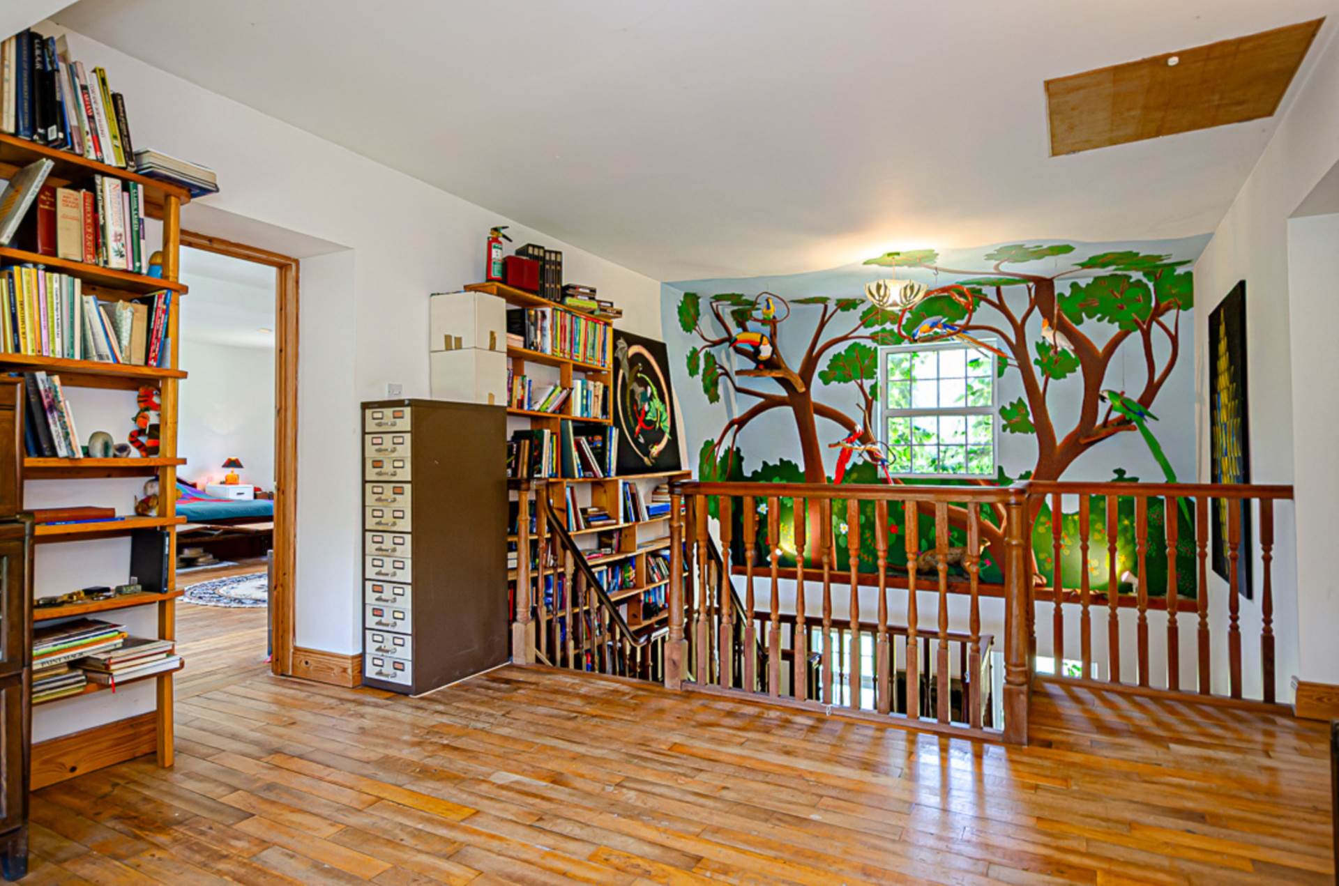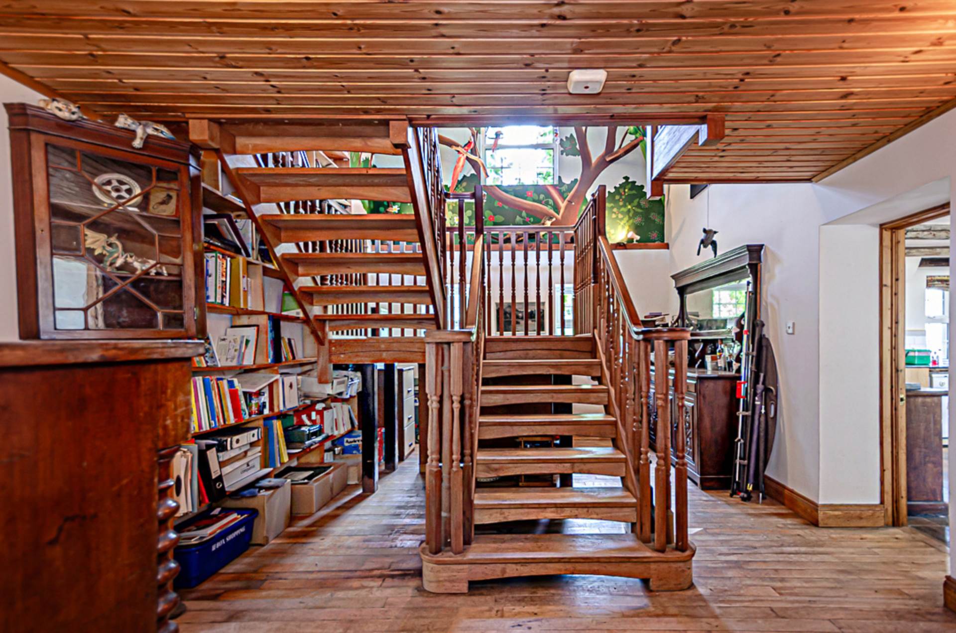 Entrance hall - 18'3" (5.56m) x 12'2" (3.71m)Double height hallway with mezzanine above. Maple wood floor (reclaimed from an old English mill), open timber staircase with mahogany spindles, 18ft high built-in bookcase, timber ceiling and uplighters. Hand-painted mural inspired by Brazil