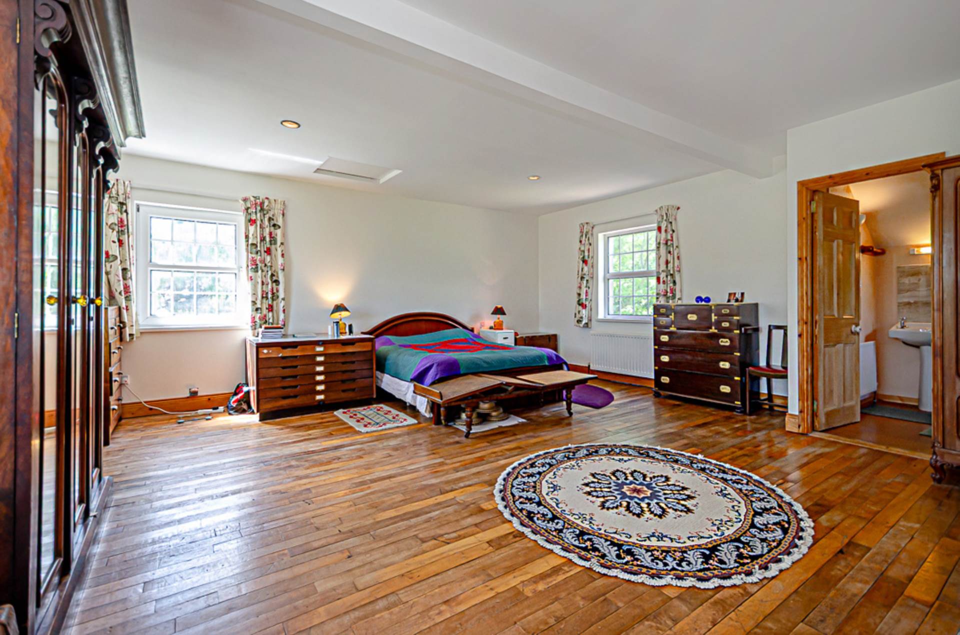 Spacious main bedroom - 20'8" (6.3m) x 19'8" (5.99m)Reclaimed maple wood floor and wood burning stove in alcove, recessed spotlights. Reclaimed door leading to en-suite