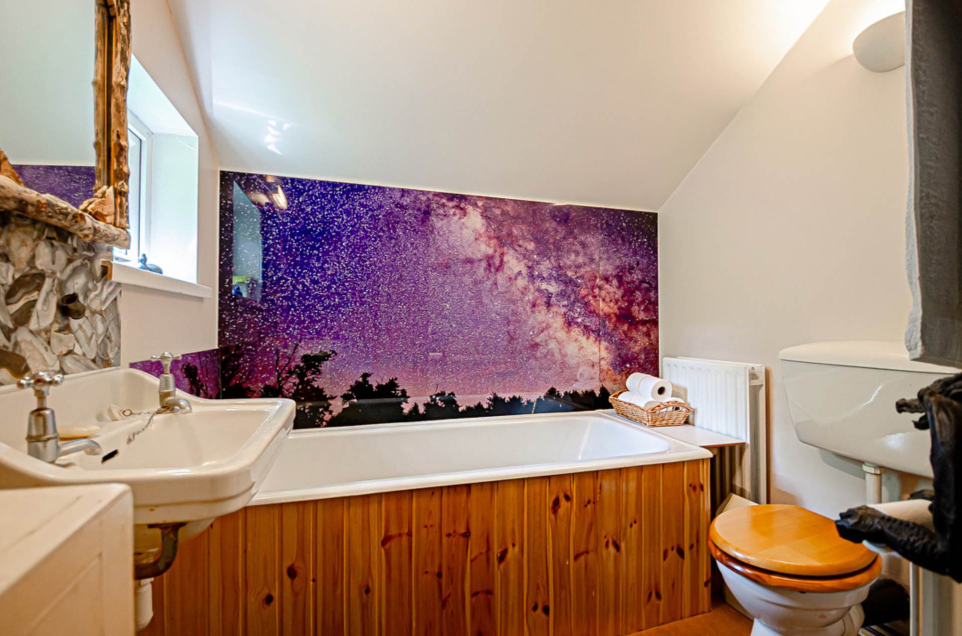The old stone walls still house the family kitchen and utility room. Now, modern but homely oak kitchen units with an oil fired ESSE range and Belfast-type sink fill the space. A Chinese slate floor and granite worktops from India complement the exposed original walls and beams.