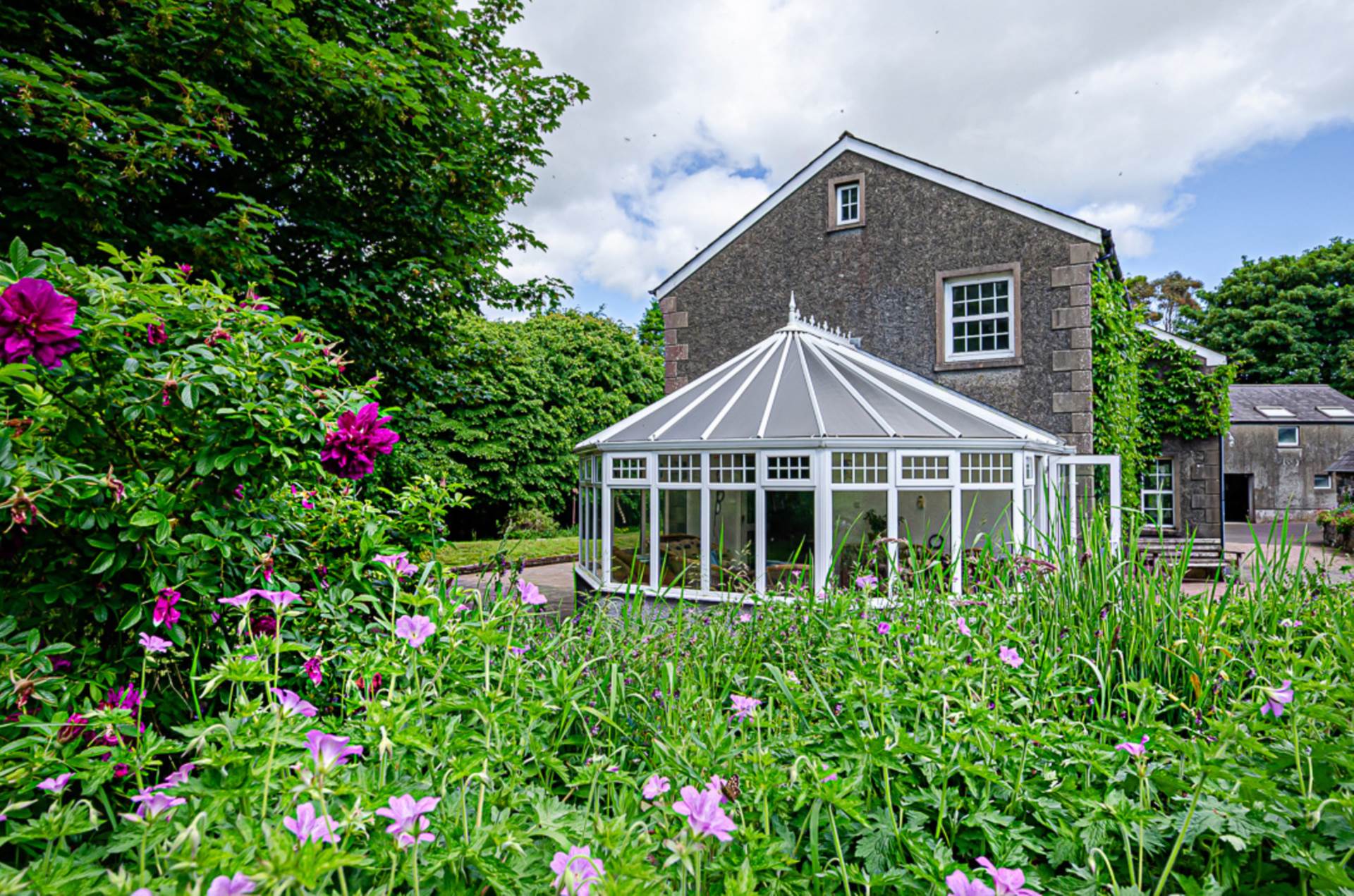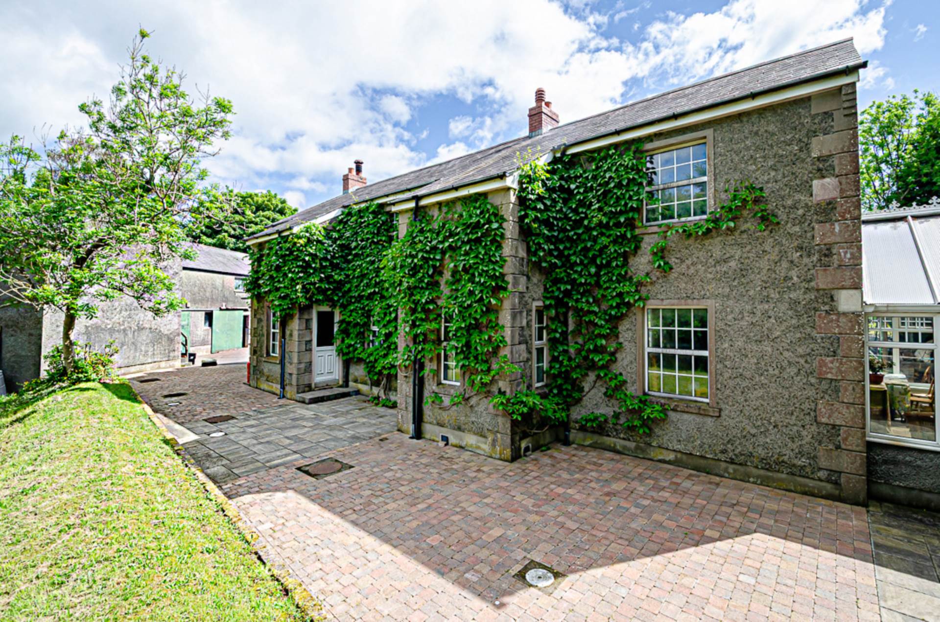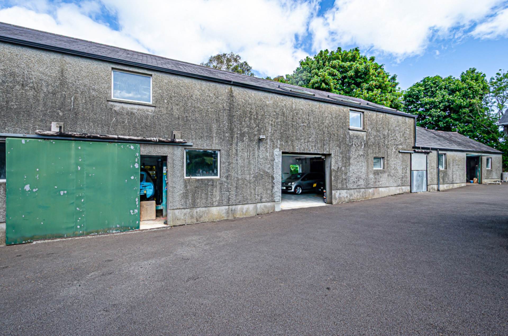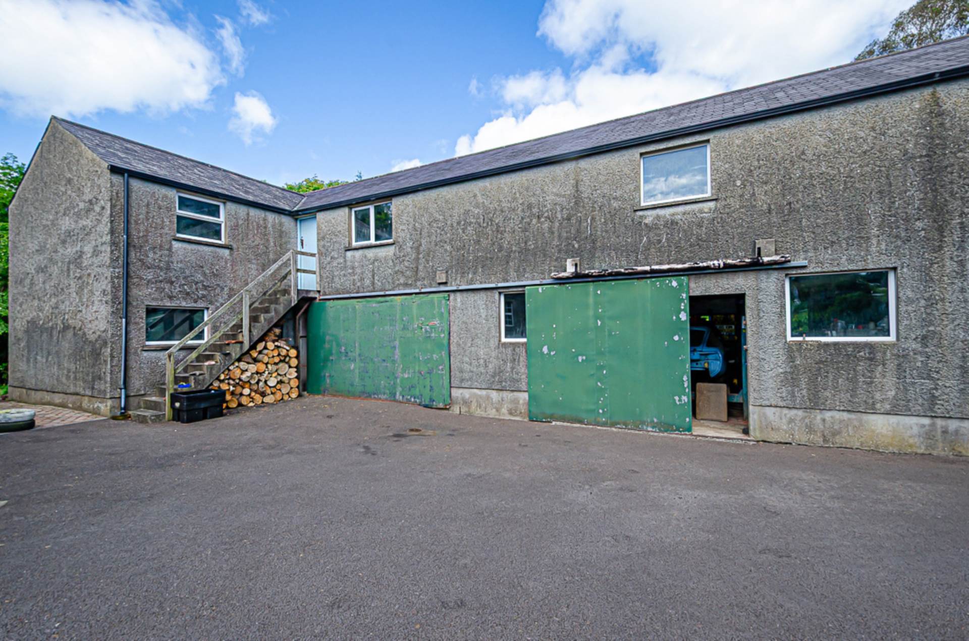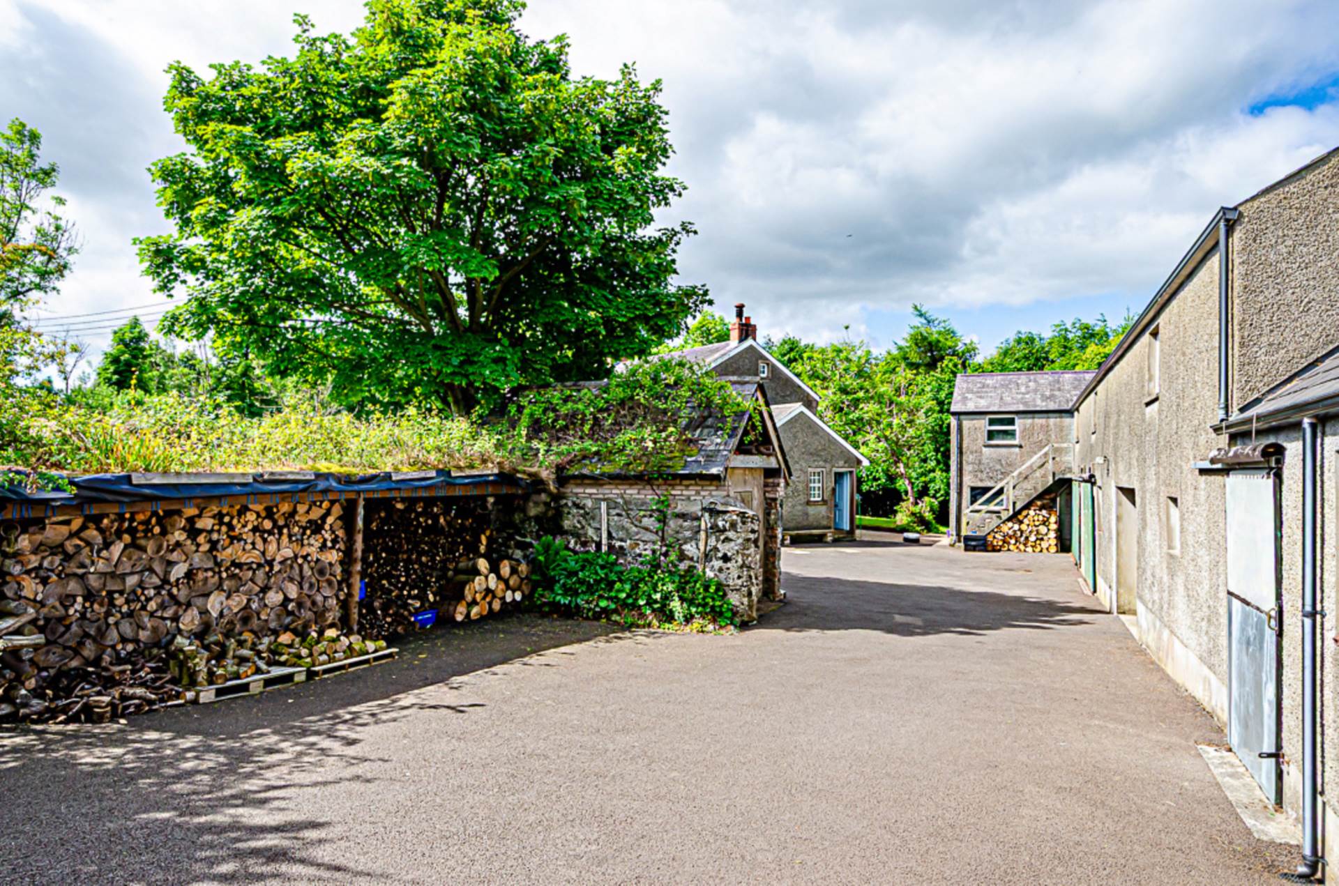 Outside there are well-finished patio areas, a terraced grass area, and extensive tree planting over several acres. The property is accessed via a long concrete laneway and SMA surfaced yard. Along one side of this yard, are restored outbuildings which have been converted into four garages (which could accommodate 14 cars), a bright, spacious centrally heated and insulated workshop, and several large storage areas. A set of concrete steps leads up to one of these storage areas. This was remodelled for use as a flat or holiday let, but the work was never completed.