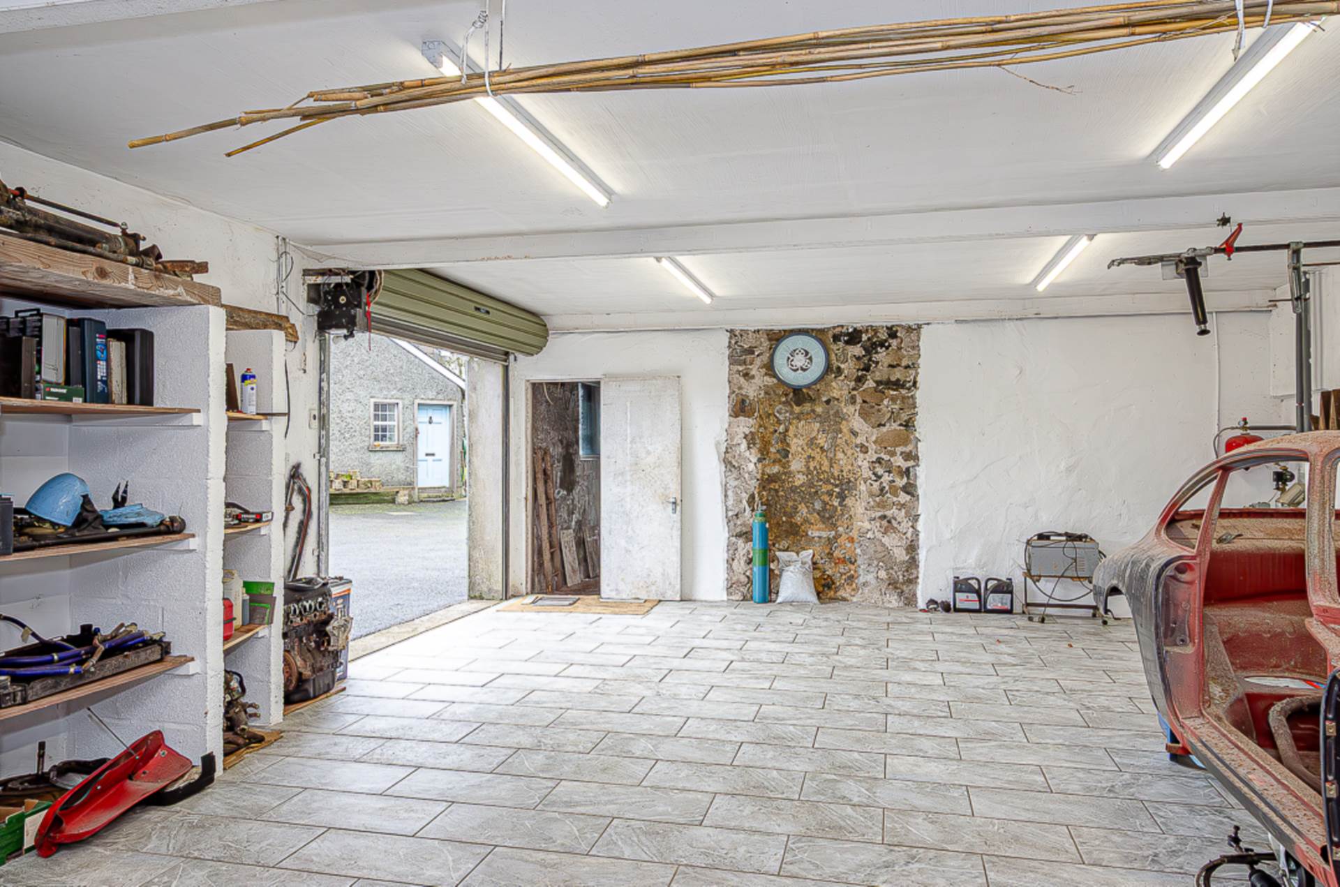 Garage - 30'4" (9.25m) x 21'7" (6.58m)Garage - 30'8" (9.35m) x 20'8" (6.3m)Garage with tiled porcelain floor and insulated ceiling, oil fired central heating boiler (for workshop above), strip lighting and power, and roller shutter door. Original exposed stone wall from old fireplace